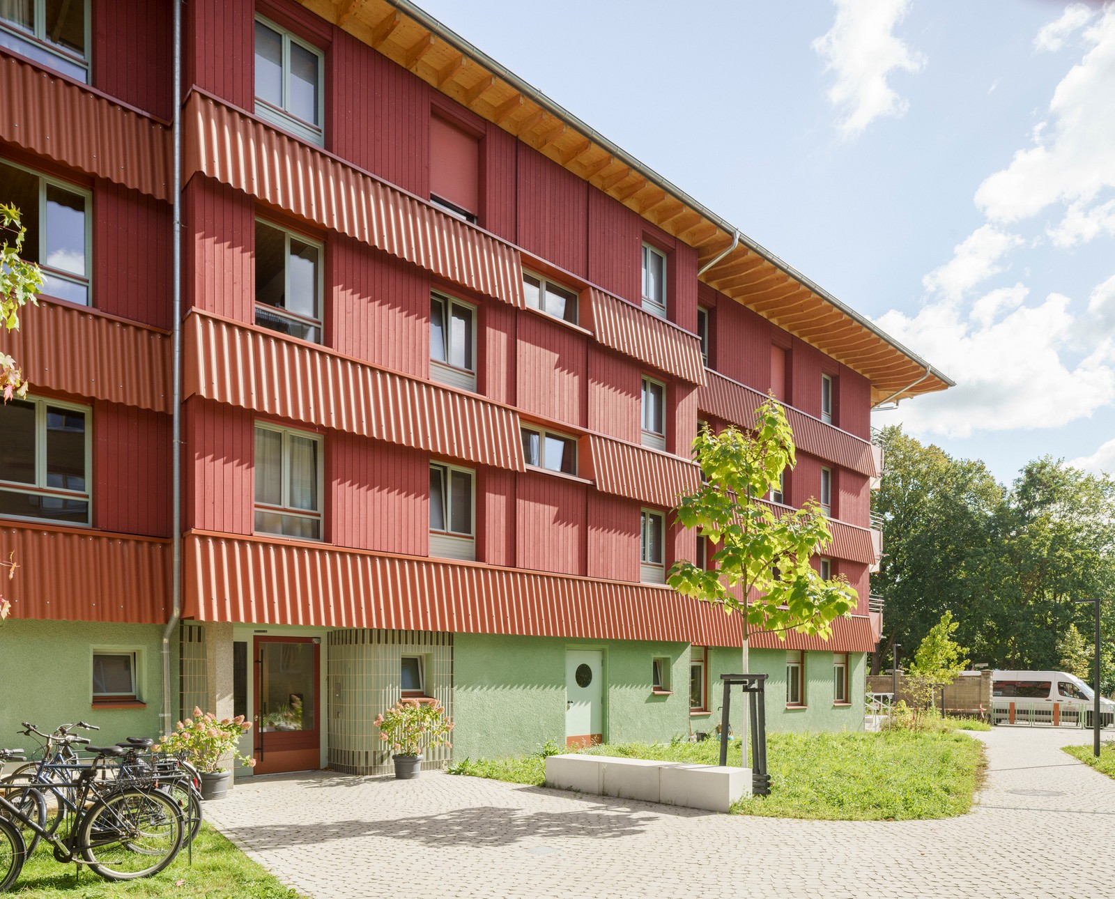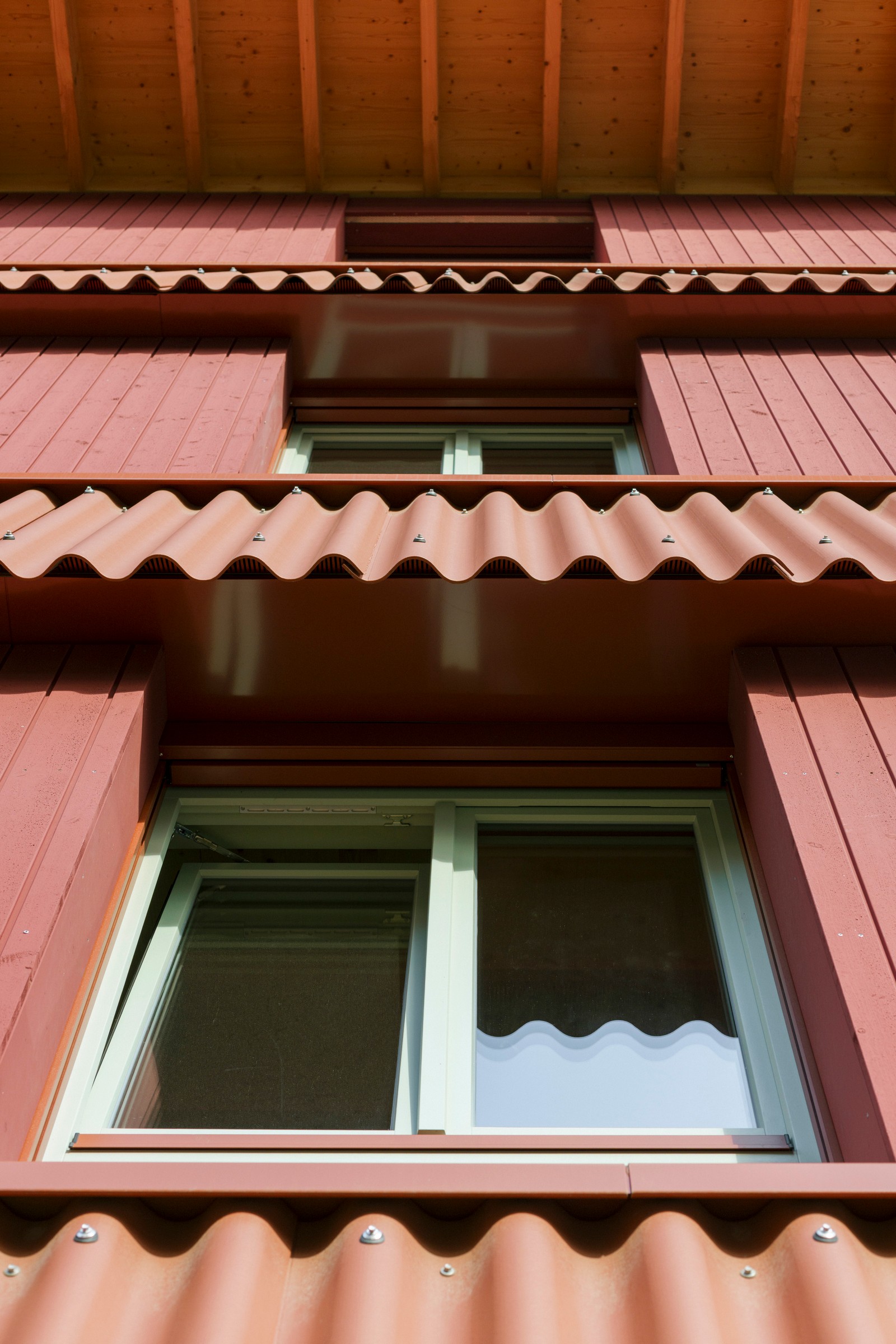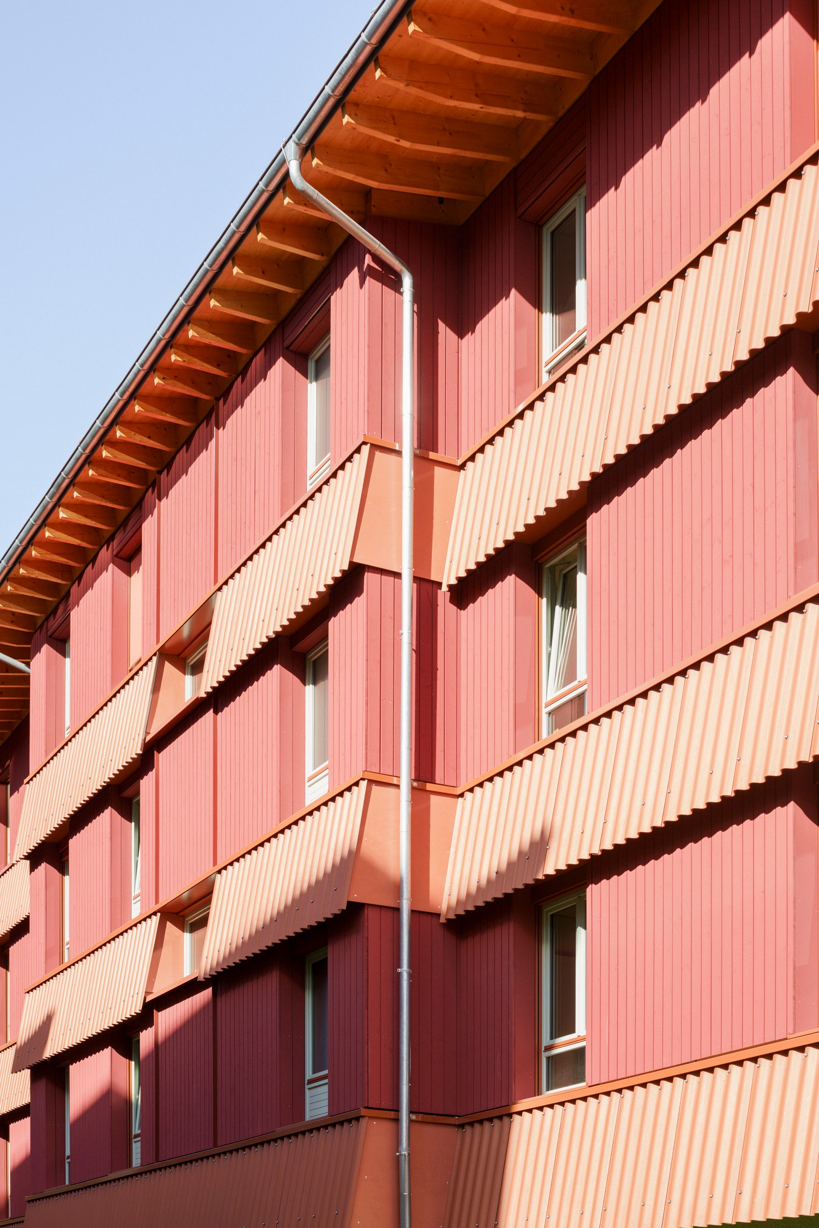 Al igual que el techo, los pisos superiores también están construidos con madera. Muros de carga y techos de CLT macizo, elementos grandes densamente rellenos con aislamiento mineral, protegidos contra la intemperie y revestidos con tablas rojas esmaltadas y aserradas en bruto. Los elementos llegaron a Berlín desde Baja Sajonia prefabricados, incluyendo ventanas y paneles. Solo se instalaron in situ los faldones protectores, que cubren las juntas, absorben la protección solar y retrasan el envejecimiento de la madera. Los faldones están hechos de cemento corrugado y su extremo de chapa metálica actúa como barra de protección contra incendios.