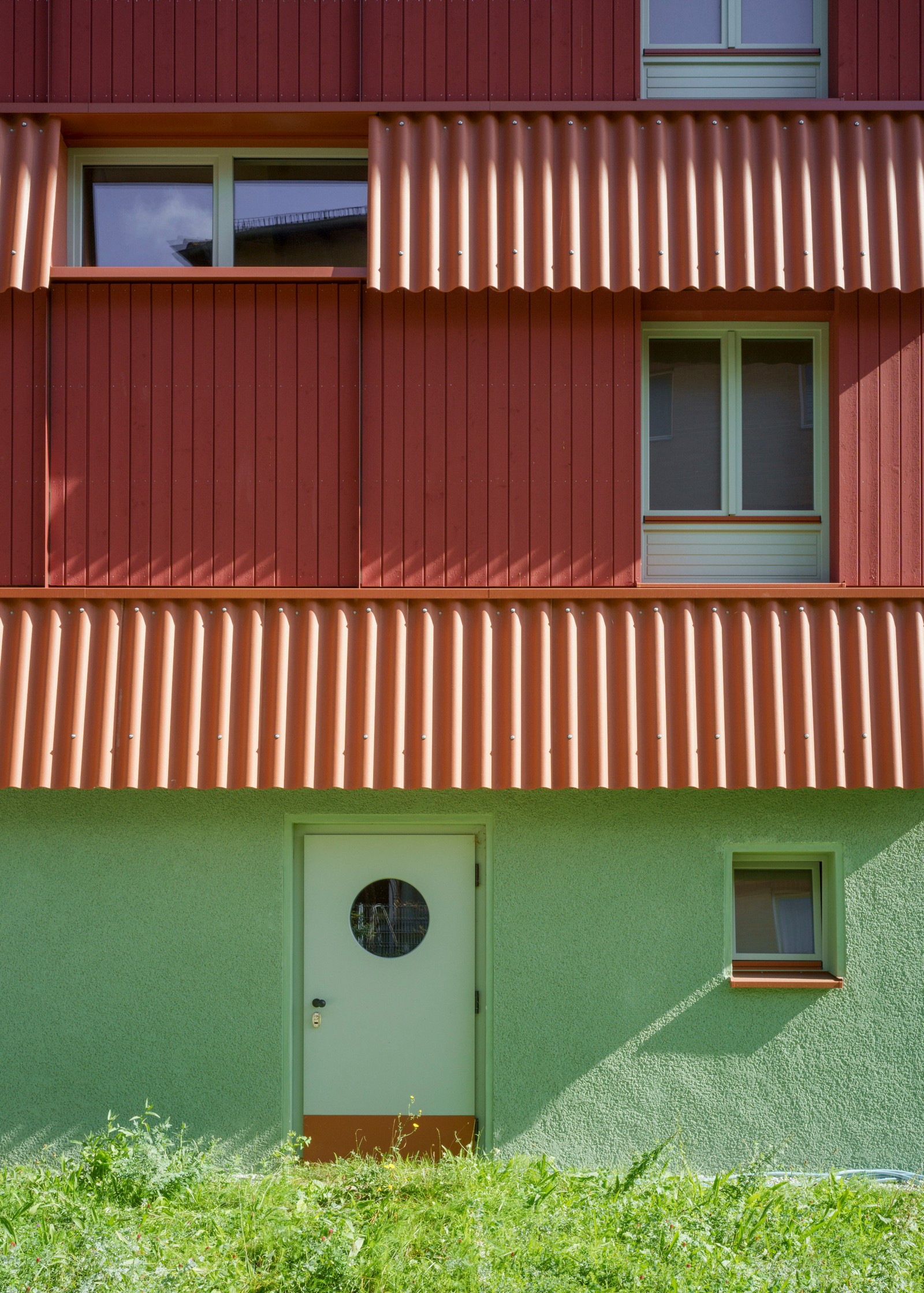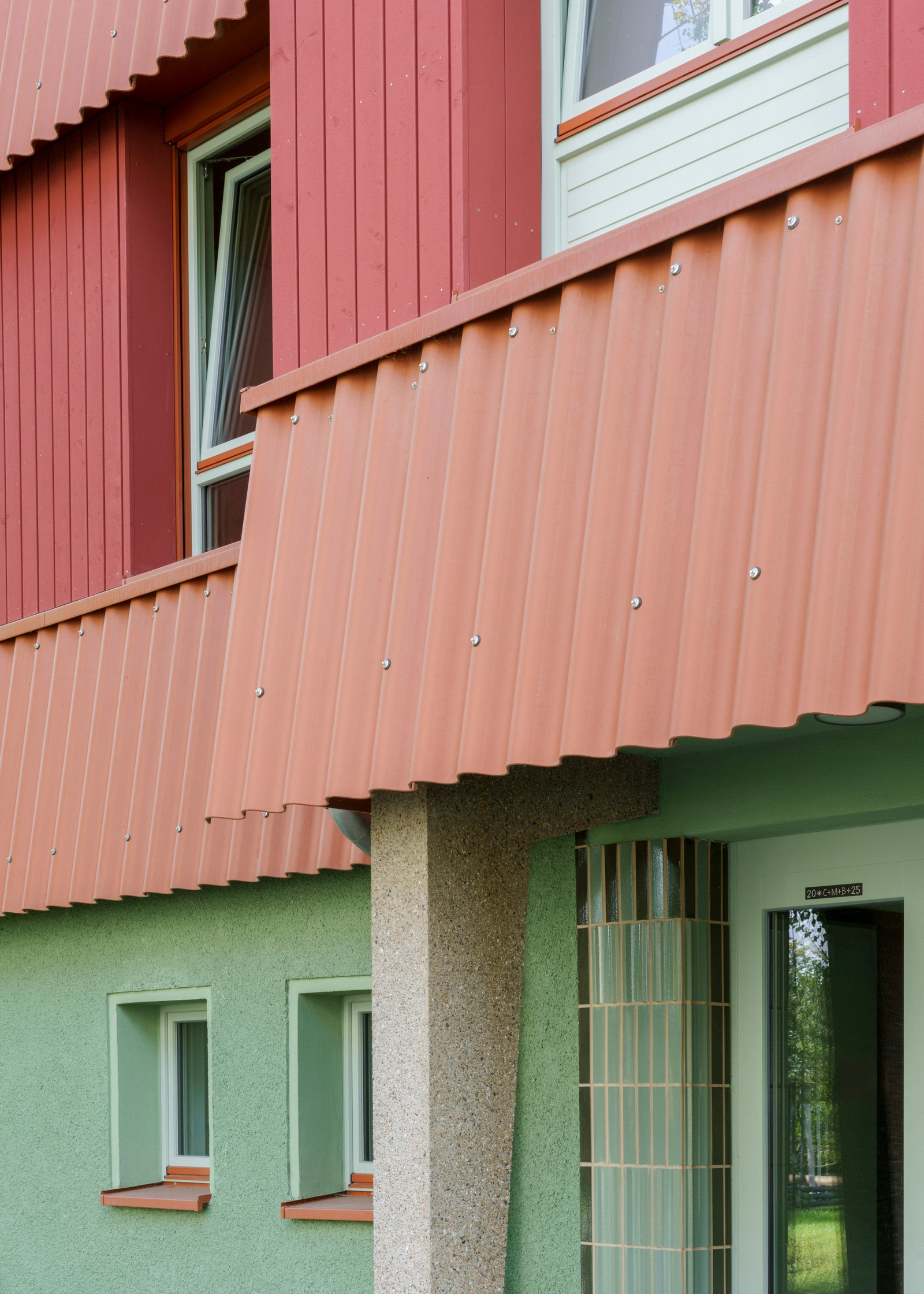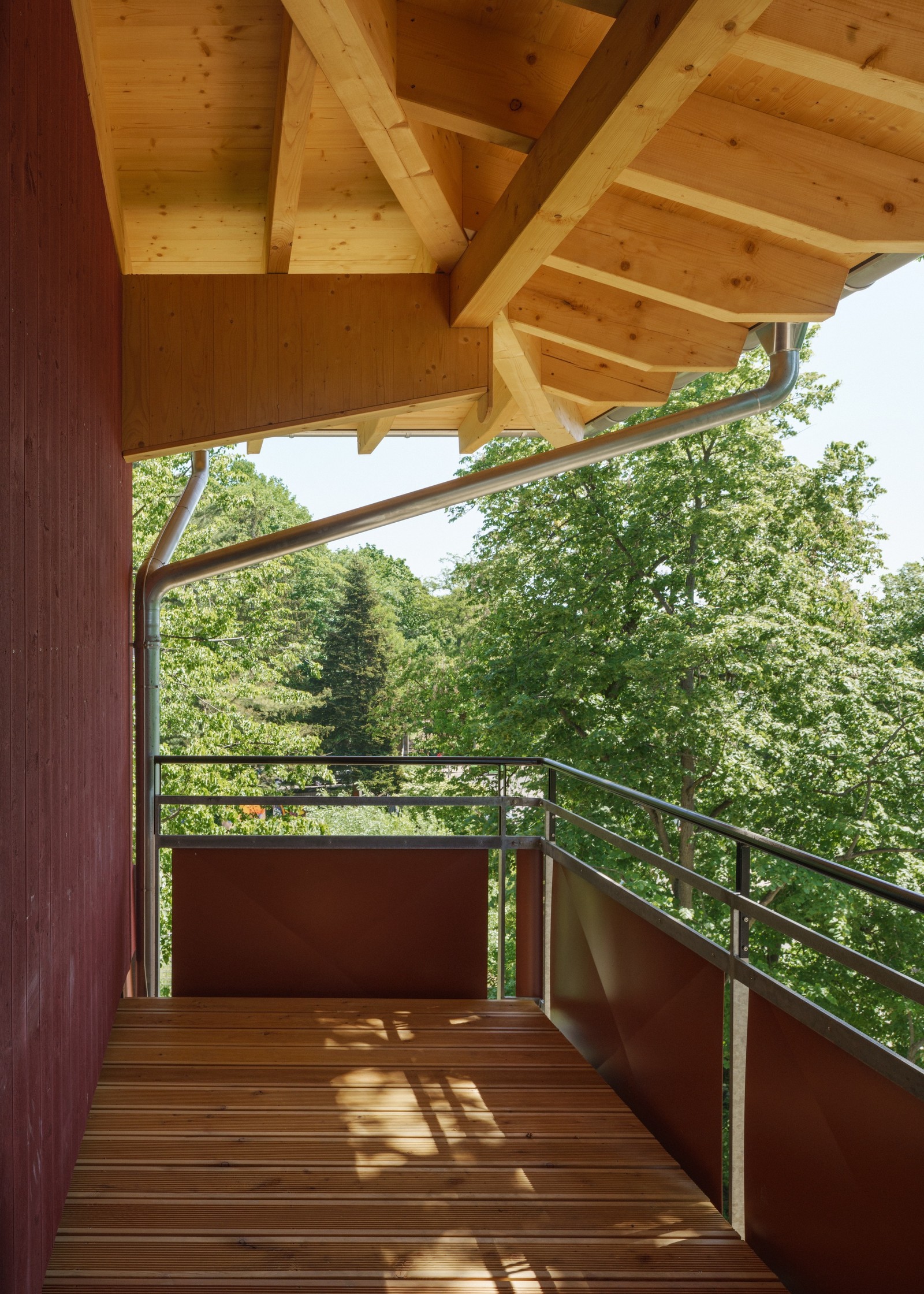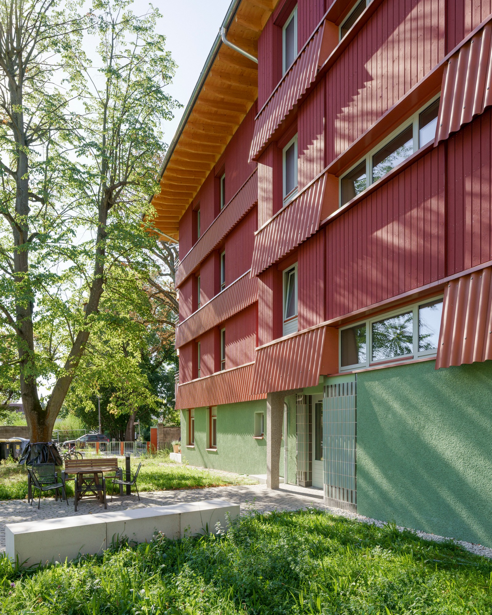 Al igual que el techo, los pisos superiores también están construidos con madera. Muros de carga y techos de CLT macizo, elementos grandes densamente rellenos con aislamiento mineral, protegidos contra la intemperie y revestidos con tablas rojas esmaltadas y aserradas en bruto. Los elementos llegaron a Berlín desde Baja Sajonia prefabricados, incluyendo ventanas y paneles. Solo se instalaron in situ los faldones protectores, que cubren las juntas, absorben la protección solar y retrasan el envejecimiento de la madera. Los faldones están hechos de cemento corrugado y su extremo de chapa metálica actúa como barra de protección contra incendios.