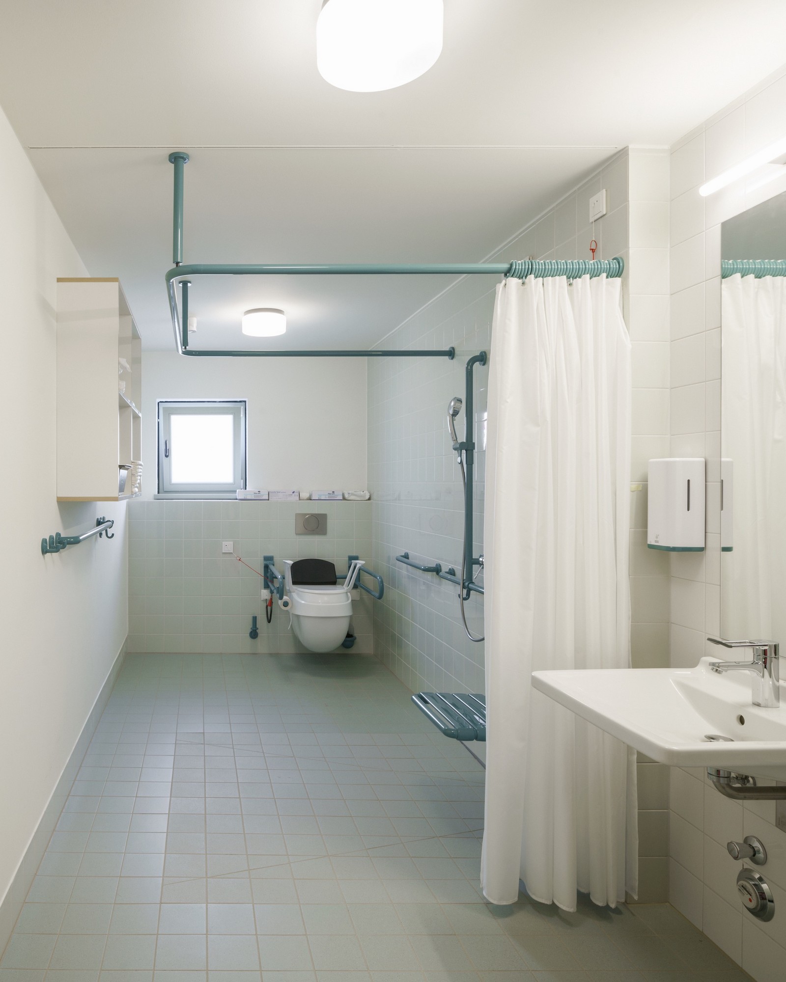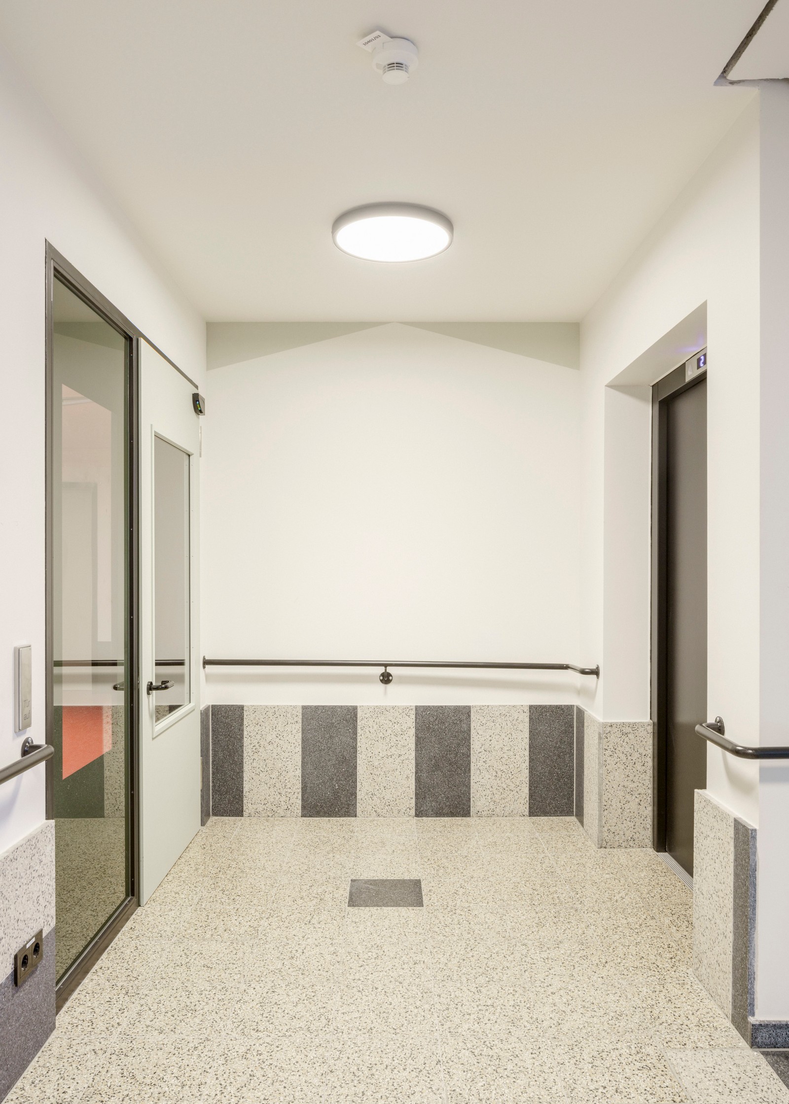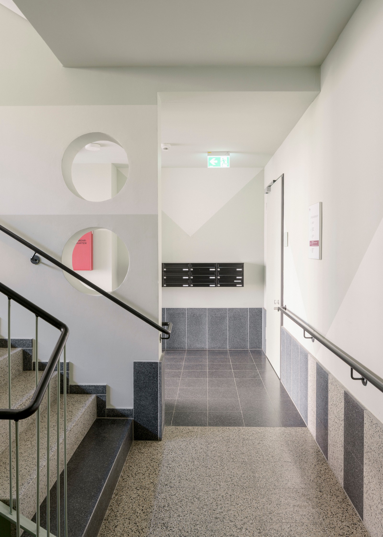 Dos escaleras garantizan una seguridad óptima en caso de emergencia. Toda la casa está libre de barreras y es accesible para sillas de ruedas. También se prestó la máxima atención a todos los requisitos necesarios en términos de diseño: zonas de espera para sillas de ruedas en las escaleras, alturas libres en las ventanas, interruptores de luz y manijas de alto contraste, pasamanos en las zonas comunes, máximos recortes de vidrio, botones pulsadores y sistemas de llamada de emergencia en todo el edificio.