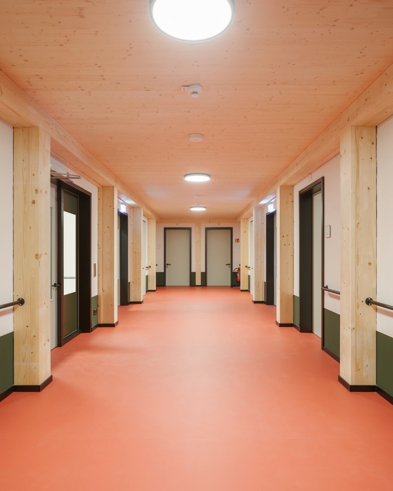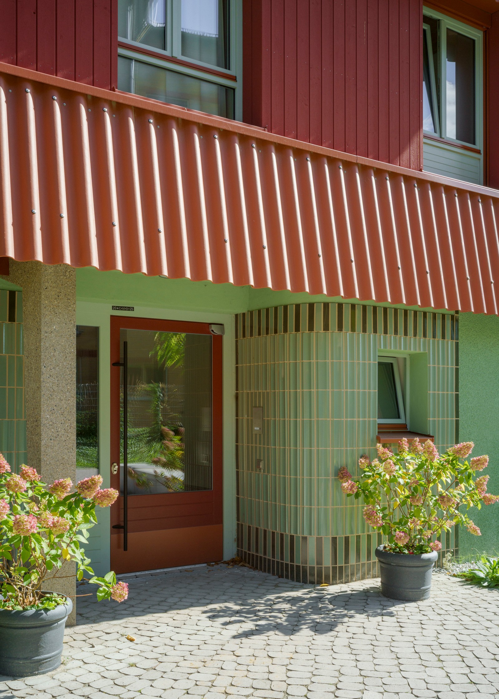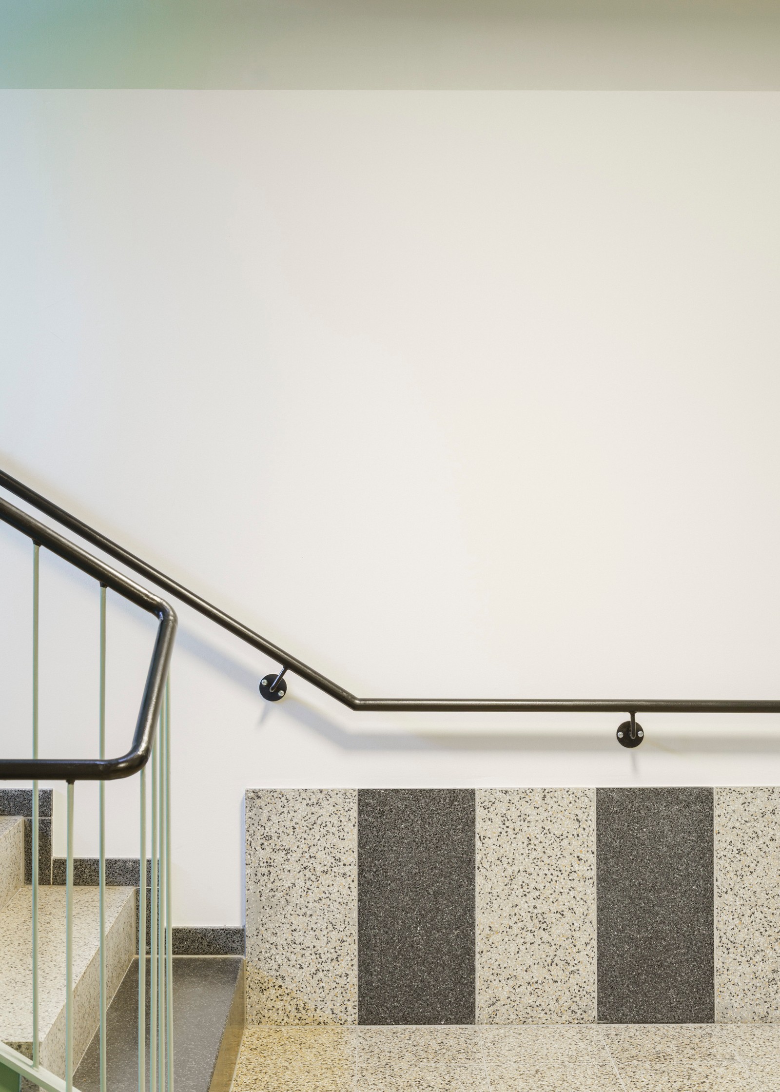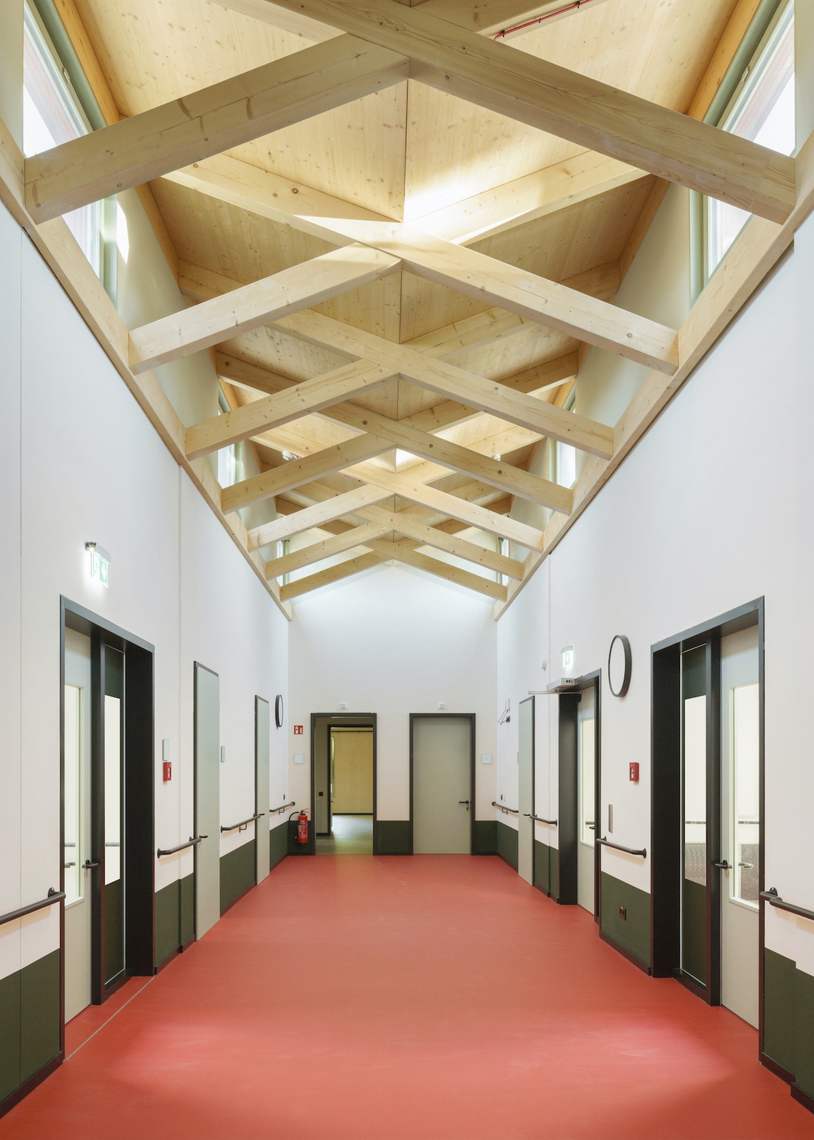 La dirección de la casa se encuentra al sur, en Nordendstraße, donde también hay dos puertas en la antigua pared abierta. Si se sube por los caminos accesibles para sillas de ruedas, se llega al zócalo verde, protegido por el techo. Cortado en un saliente, el revestimiento exterior se vuelve aquí táctil: las baldosas verdes brillantes resaltan la entrada. No solo las zonas de entrada, sino toda la planta baja es de piedra. Las baldosas de terrazo en el piso y un patrón verde y blanco en las paredes dan la bienvenida a los usuarios en el interior. Luego se entra al pasillo central: una sala de distribución abierta, el centro, el corazón de la casa, un espacio generoso en lugar de un pasillo estrecho. En la planta superior, el pasillo recibe luz adicional gracias a una construcción especial de vigas entrecruzadas donde se ve el cielo.