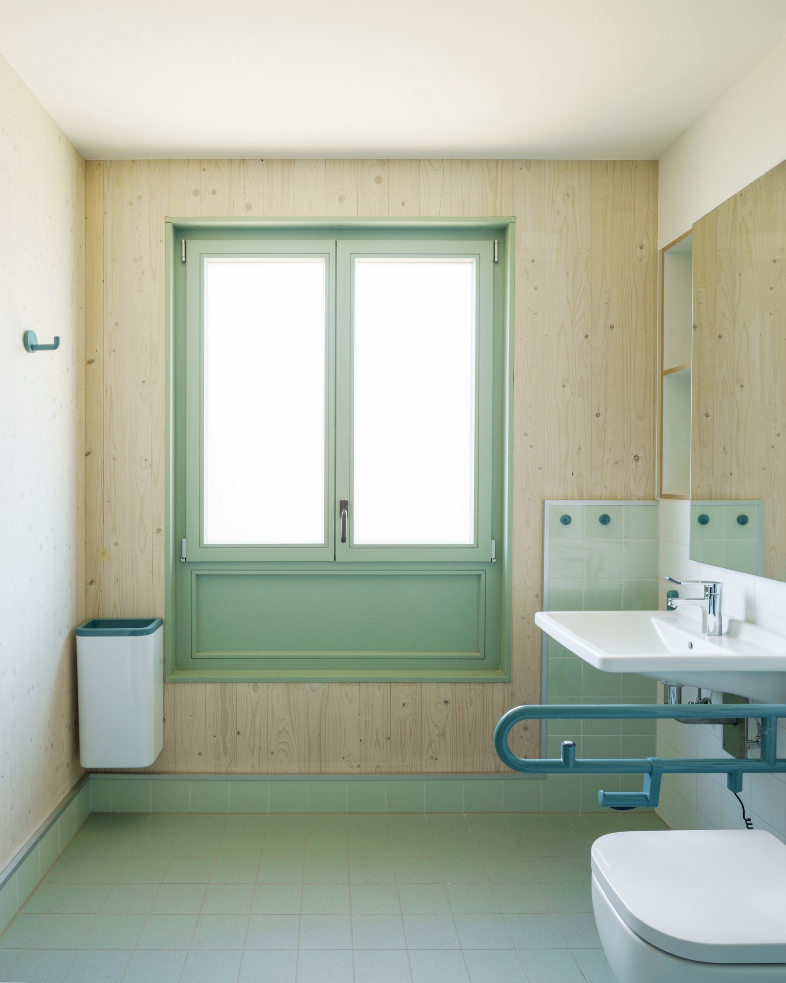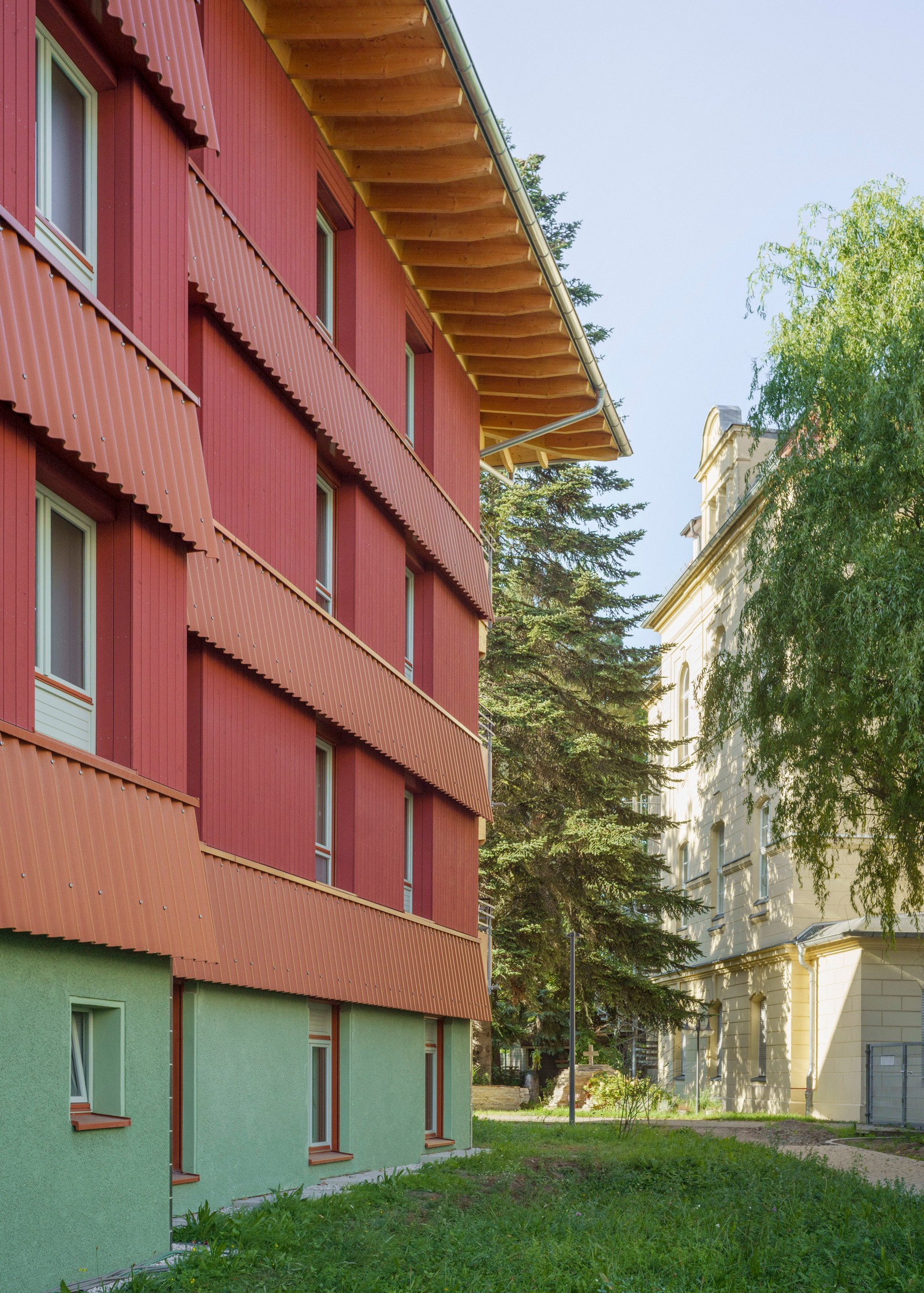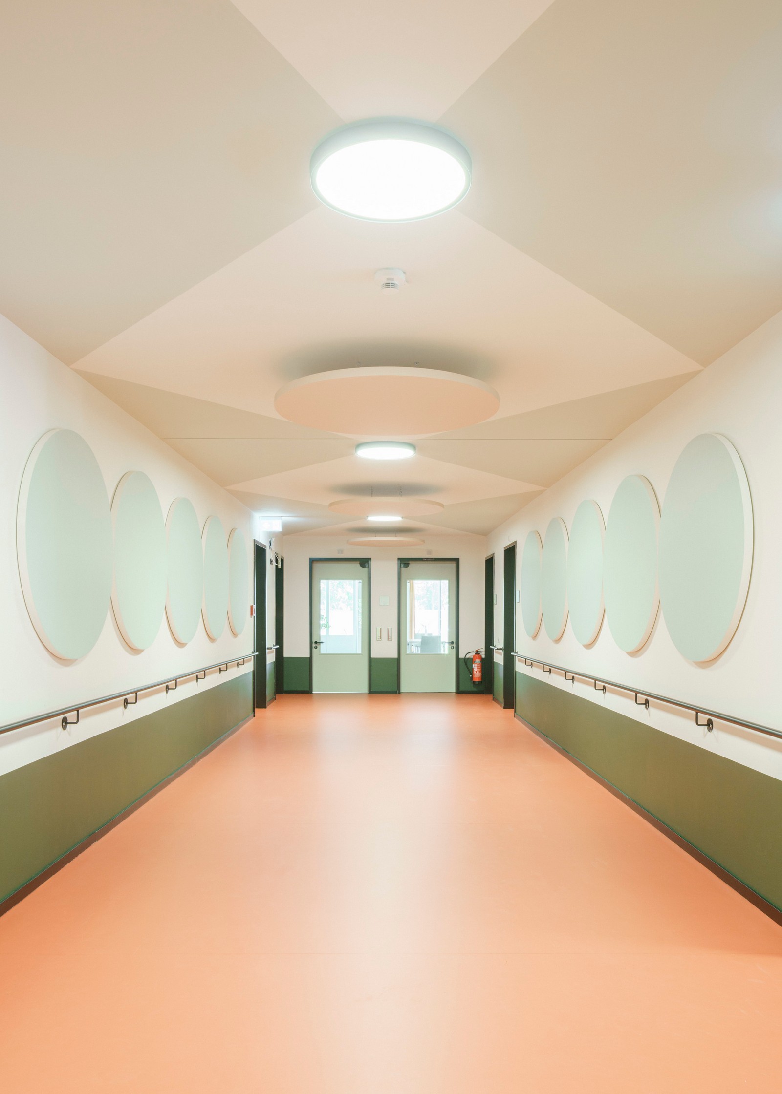 La dirección de la casa se encuentra al sur, en Nordendstraße, donde también hay dos puertas en la antigua pared abierta. Si se sube por los caminos accesibles para sillas de ruedas, se llega al zócalo verde, protegido por el techo. Cortado en un saliente, el revestimiento exterior se vuelve aquí táctil: las baldosas verdes brillantes resaltan la entrada. No solo las zonas de entrada, sino toda la planta baja es de piedra. Las baldosas de terrazo en el piso y un patrón verde y blanco en las paredes dan la bienvenida a los usuarios en el interior. Luego se entra al pasillo central: una sala de distribución abierta, el centro, el corazón de la casa, un espacio generoso en lugar de un pasillo estrecho. En la planta superior, el pasillo recibe luz adicional gracias a una construcción especial de vigas entrecruzadas donde se ve el cielo.