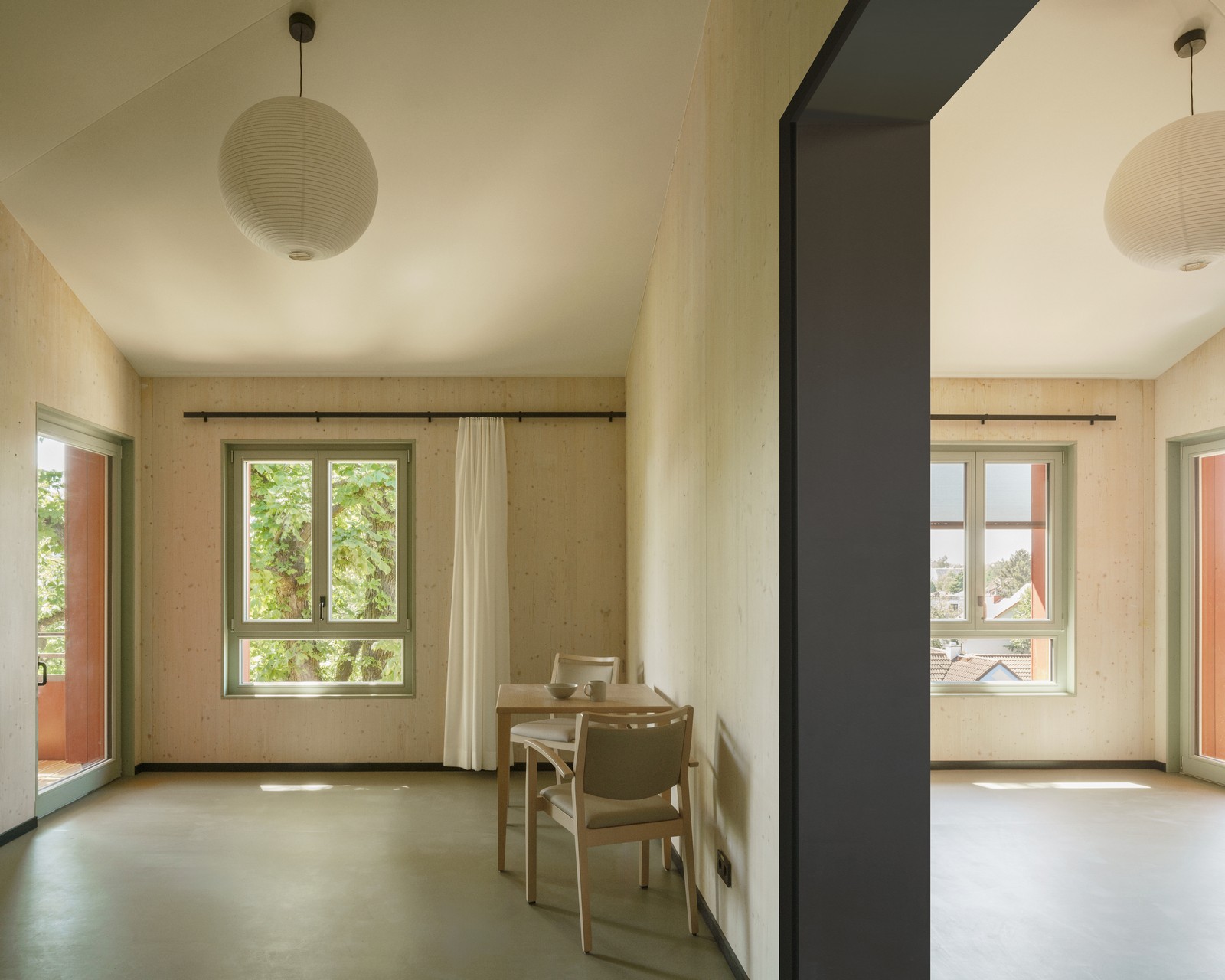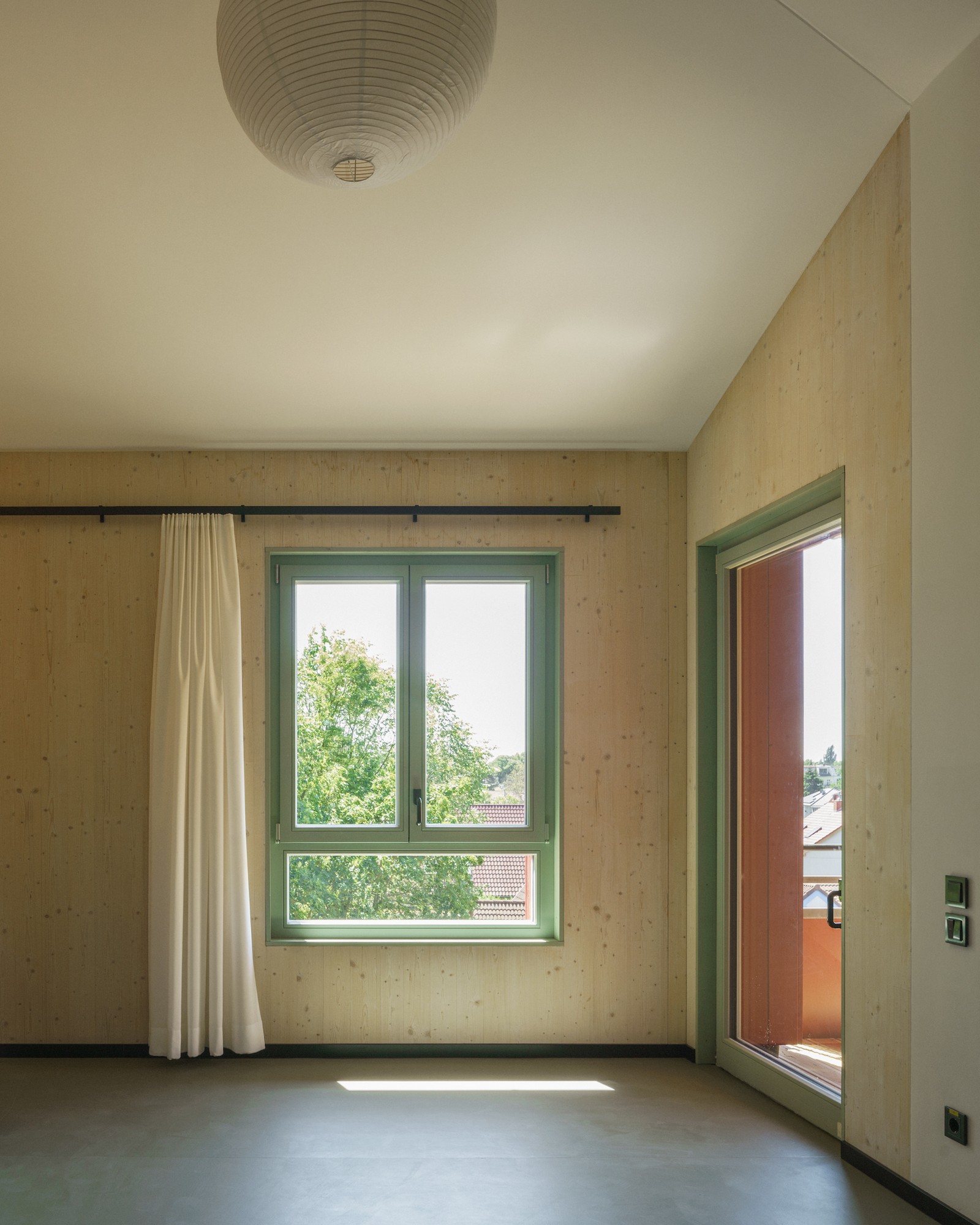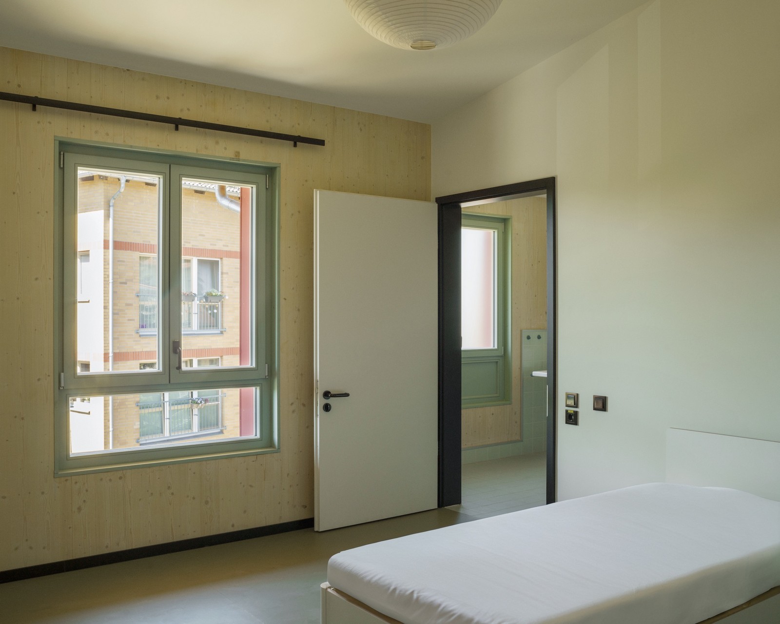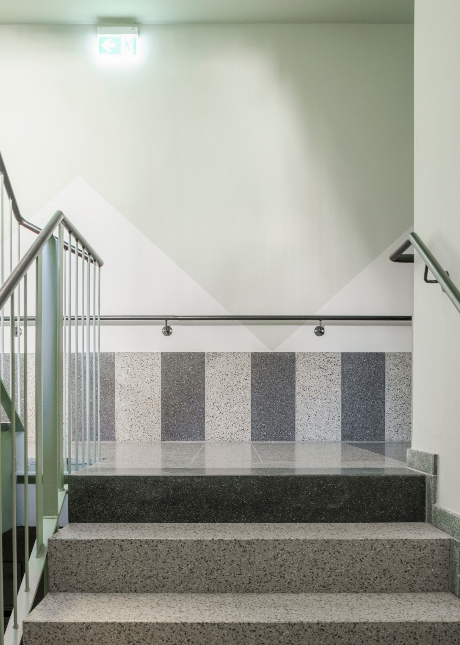 La dirección de la casa se encuentra al sur, en Nordendstraße, donde también hay dos puertas en la antigua pared abierta. Si se sube por los caminos accesibles para sillas de ruedas, se llega al zócalo verde, protegido por el techo. Cortado en un saliente, el revestimiento exterior se vuelve aquí táctil: las baldosas verdes brillantes resaltan la entrada. No solo las zonas de entrada, sino toda la planta baja es de piedra. Las baldosas de terrazo en el piso y un patrón verde y blanco en las paredes dan la bienvenida a los usuarios en el interior. Luego se entra al pasillo central: una sala de distribución abierta, el centro, el corazón de la casa, un espacio generoso en lugar de un pasillo estrecho. En la planta superior, el pasillo recibe luz adicional gracias a una construcción especial de vigas entrecruzadas donde se ve el cielo.