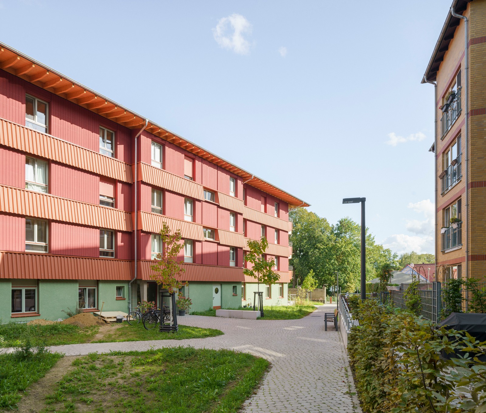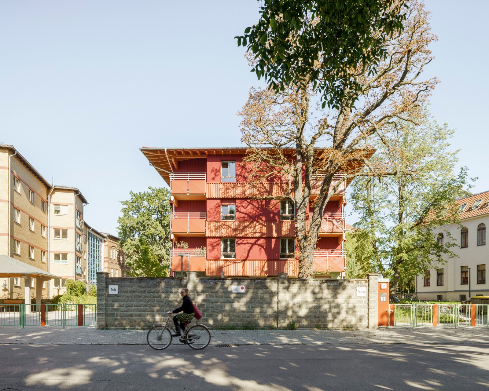 En una parcela con aspecto de parque en Pankow, un distrito del norte de Berlín, entre villas catalogadas de principios de siglo, una ampliación sobria y funcional de la década de 1990 y grandes árboles centenarios que han acompañado la historia de este lugar histórico, se encuentra la ubicación ideal para otra nueva residencia gestionada por SKF Berlin e.V.