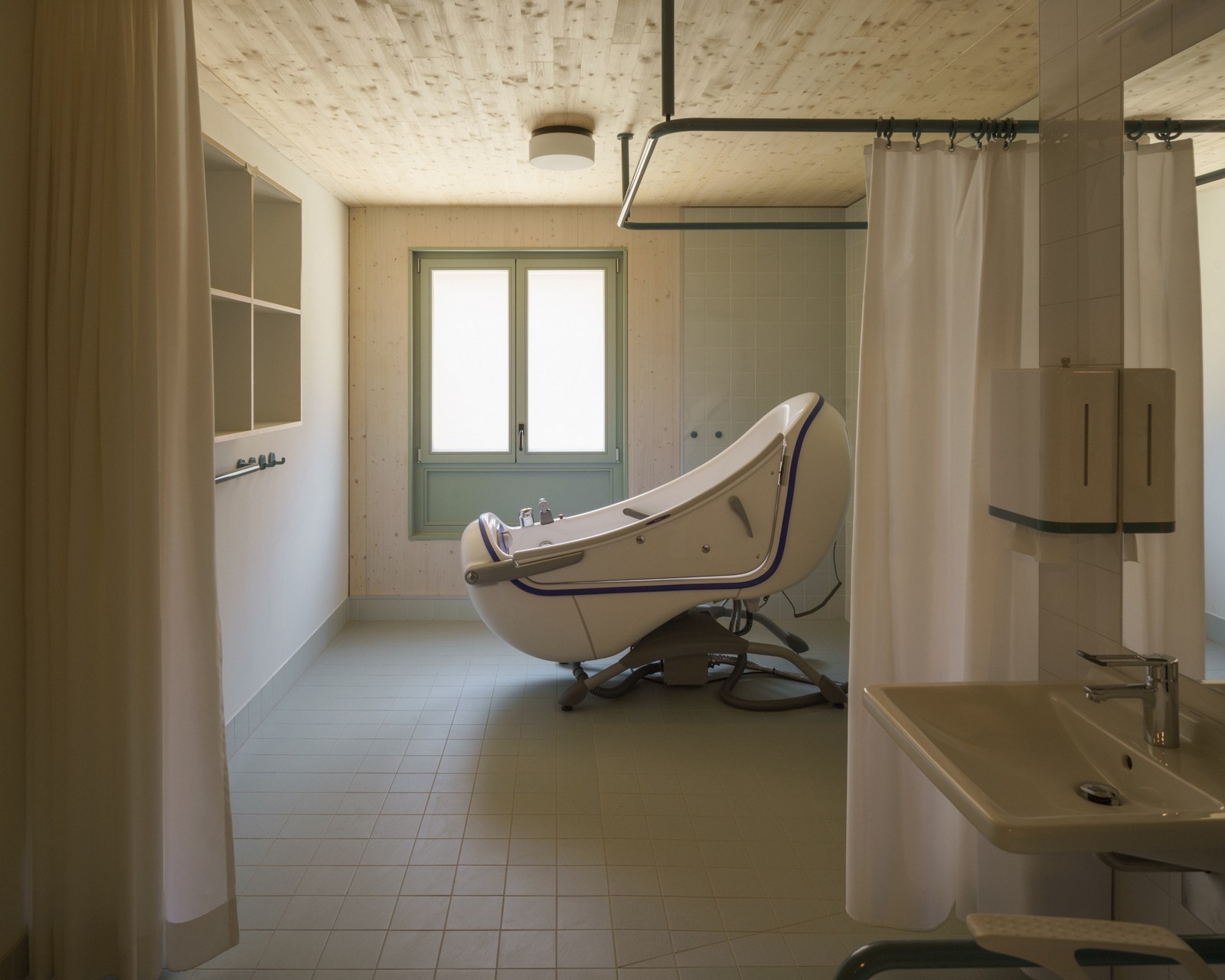 Una entrada para los residentes se encuentra en el centro, con acceso desde el este, mientras que otra entrada para la zona de actividades diurnas se encuentra en el centro, hacia el oeste. Las dos entradas separadas sirven para equilibrar y son importantes para la orientación; las dos zonas son gestionadas y financiadas por diferentes instalaciones, y la zona de la planta baja solo se utiliza durante el día.