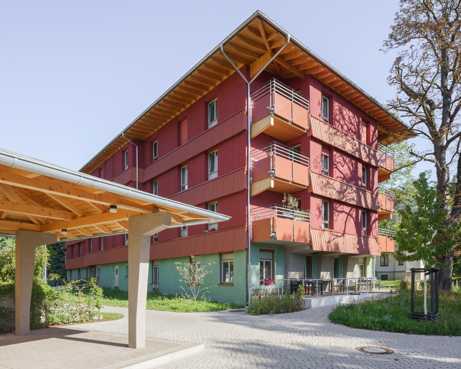 Cuatro pisos, coronados por un techo en voladizo cuyas vigas de madera quedan visibles en el exterior, una base sólida en verde y una superestructura de madera serán el nuevo hogar de hasta 32 residentes con discapacidades mentales y físicas.