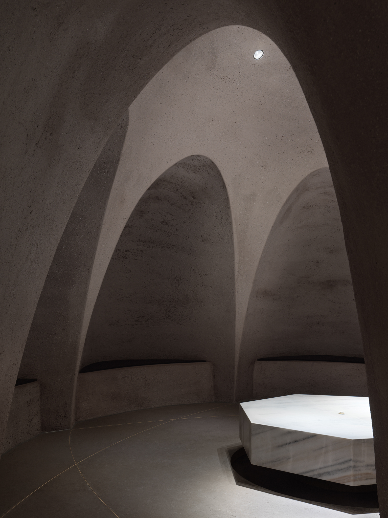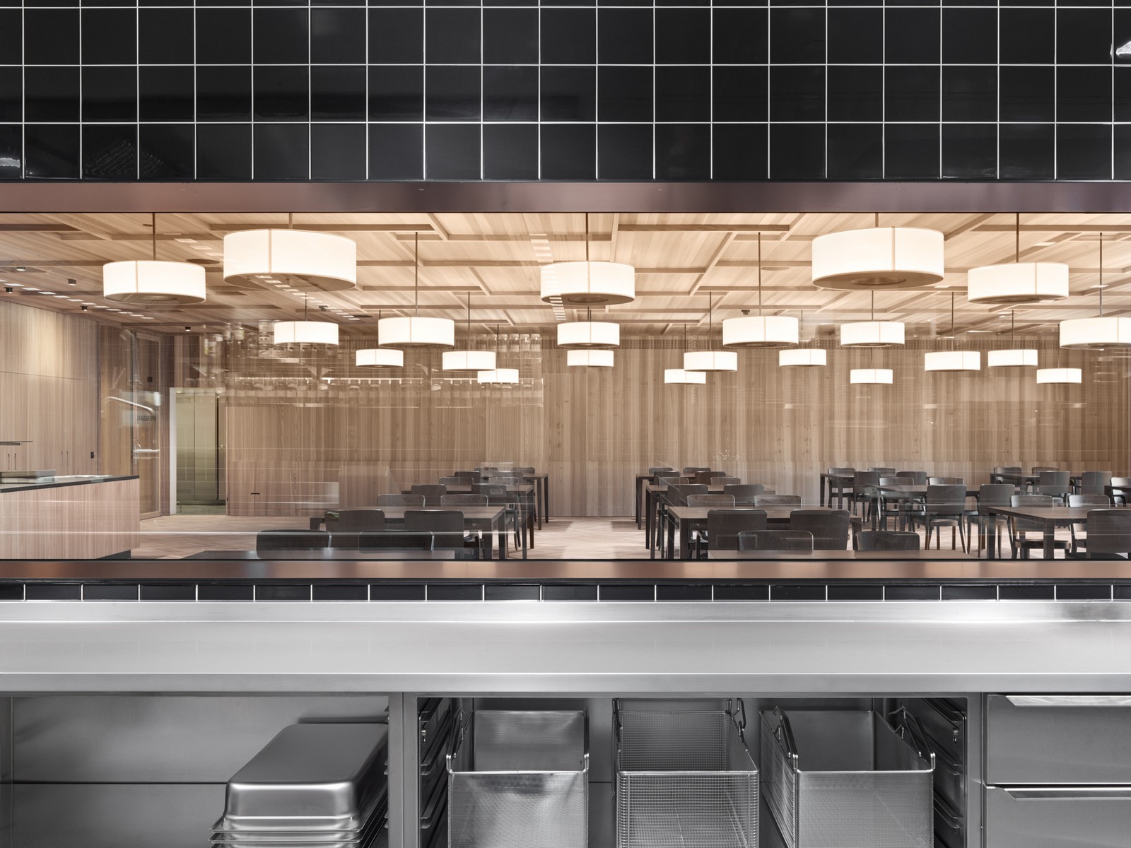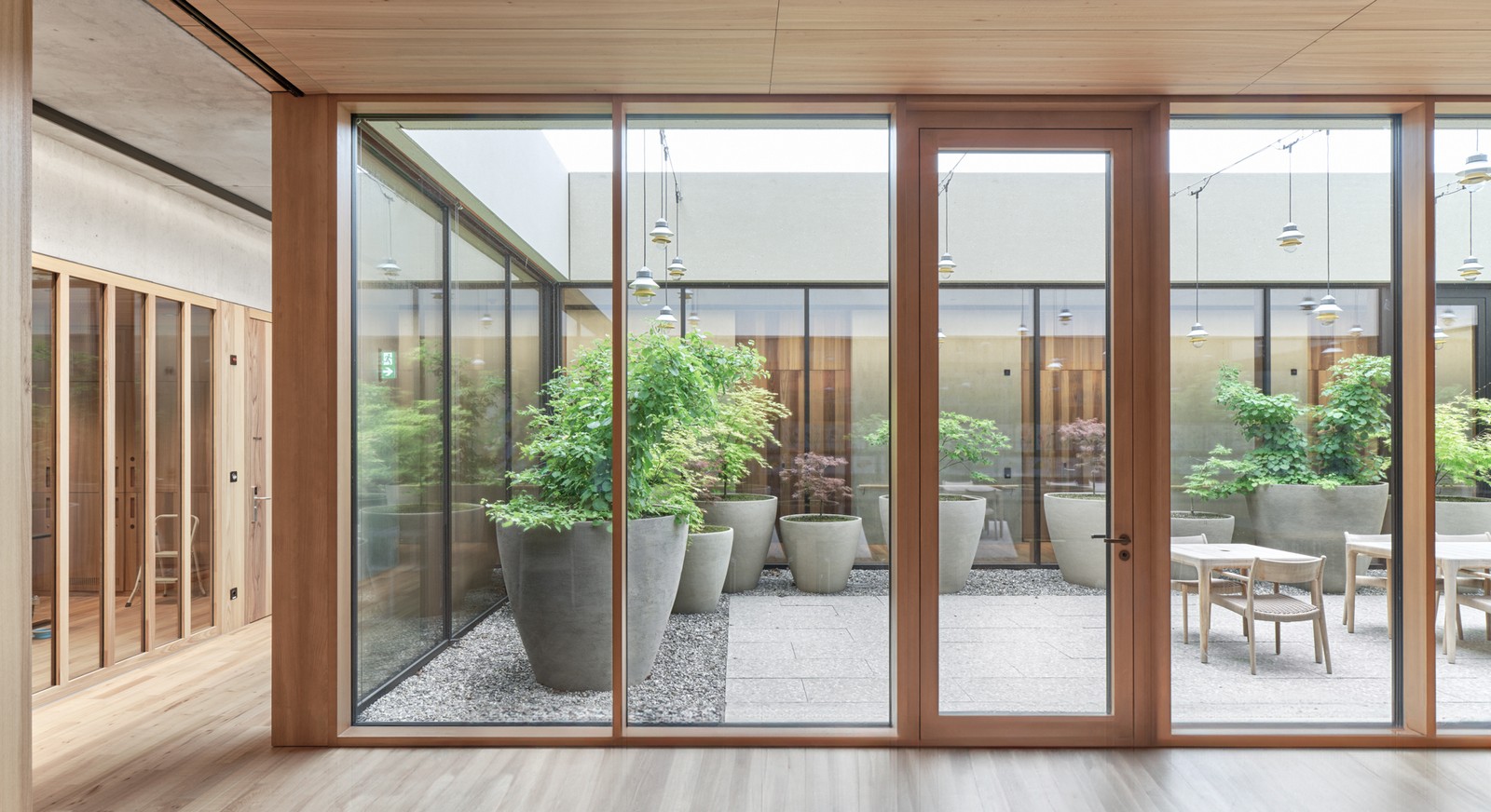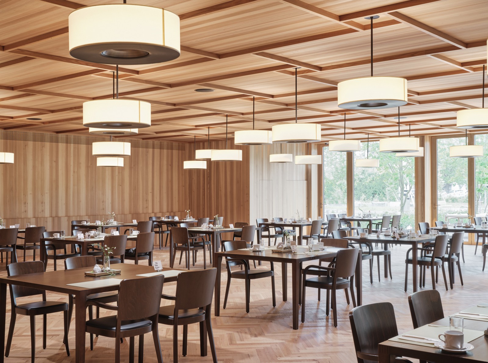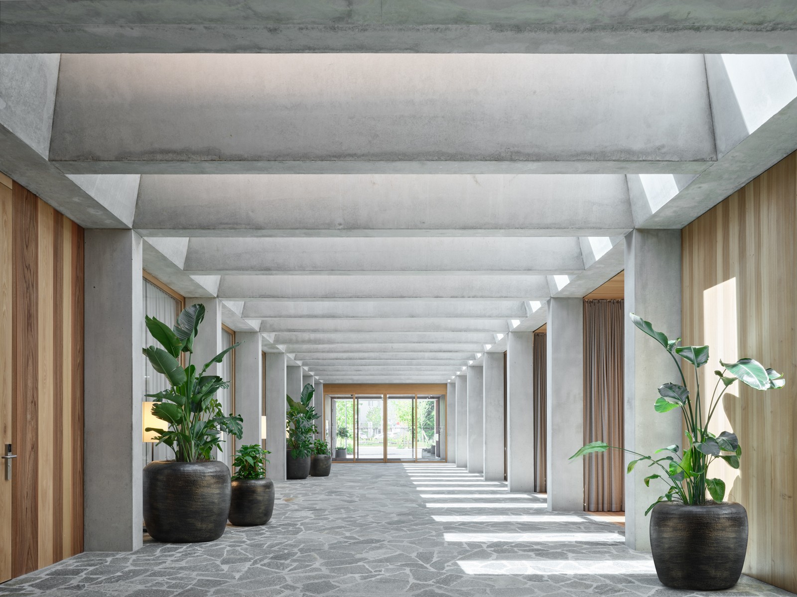 El edificio se ha situado en el extremo occidental del terreno como reacción al entorno. Los volúmenes de una sola planta reflejan los edificios bajos circundantes y facilitan una transición armoniosa a la casa principal de cuatro plantas sin restar valor al contexto. El resto del terreno al este se ha ajardinado como parque y podría albergar una futura ampliación.