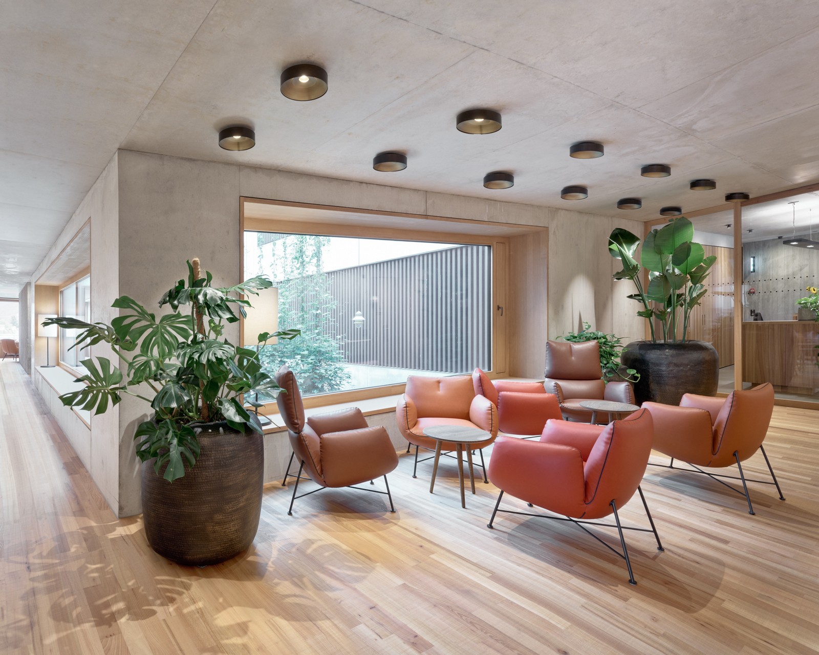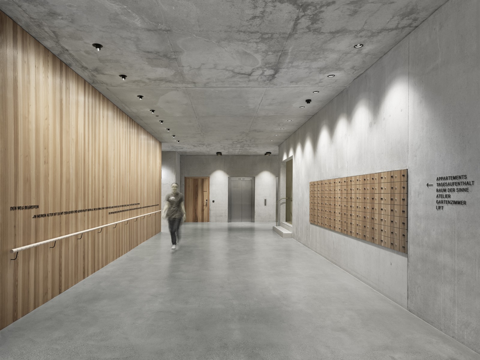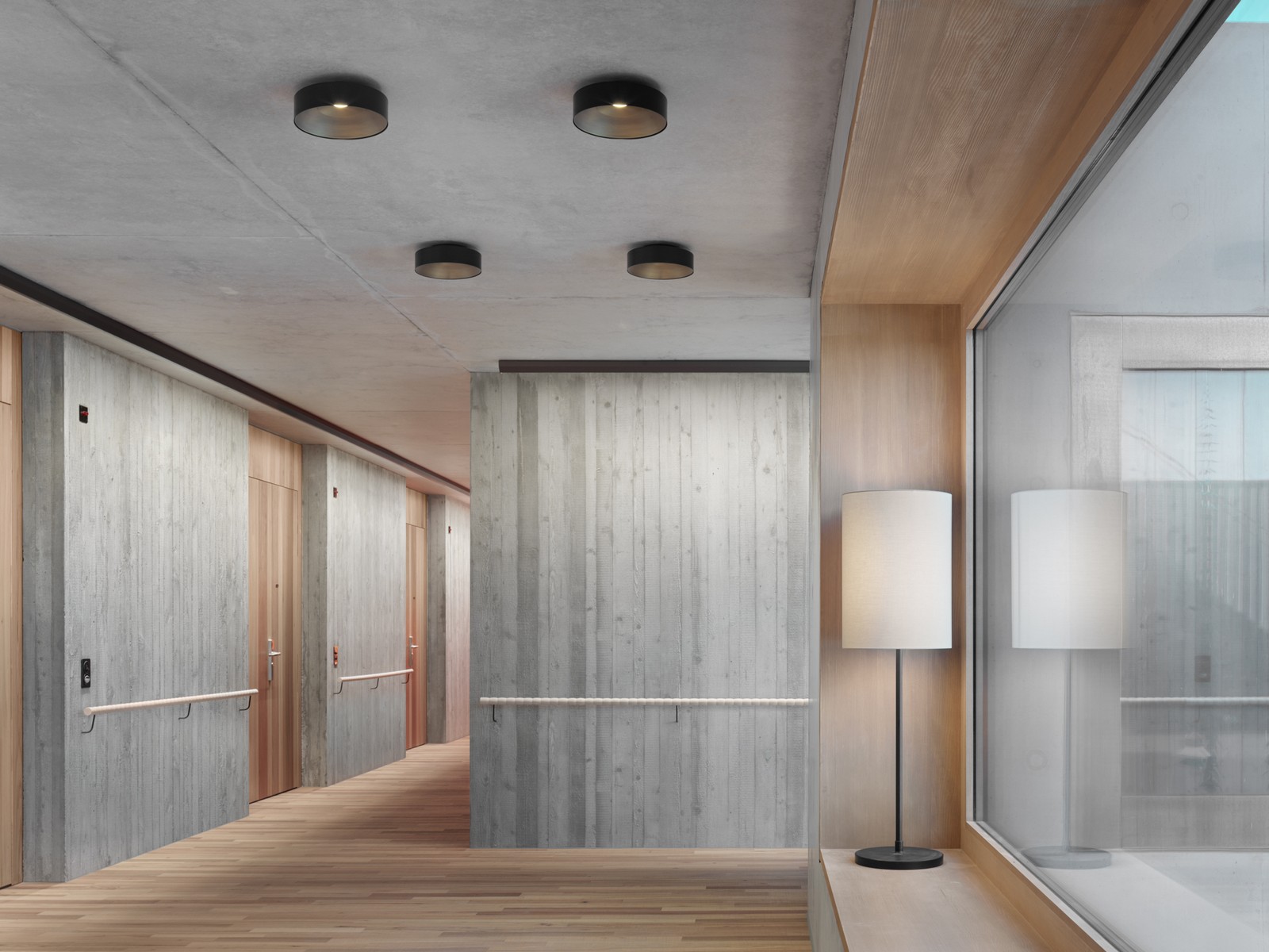 El concepto de diseño detrás de esta propuesta pone a los residentes en el centro de atención. El formato de apartamento constituye la base organizativa de la vivienda: las zonas separadas de dormitorio y sala de estar resaltan el lugar que ocupa cada habitación dentro de una residencia tipo apartamento.