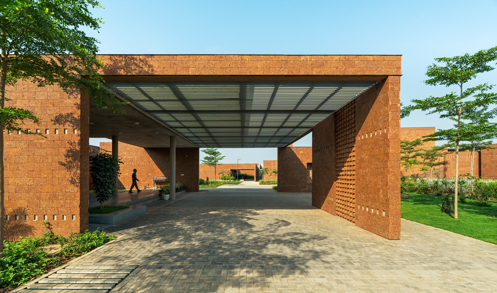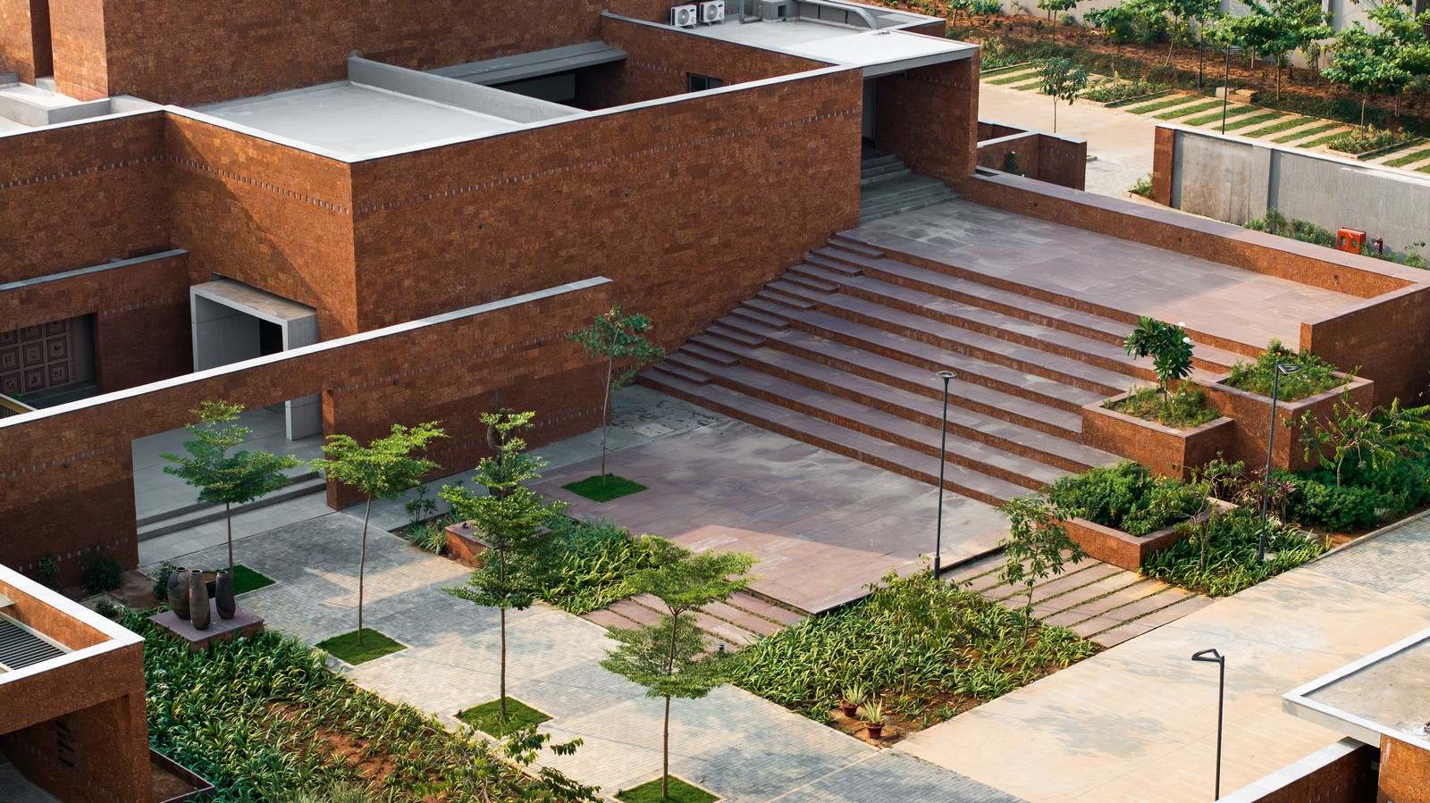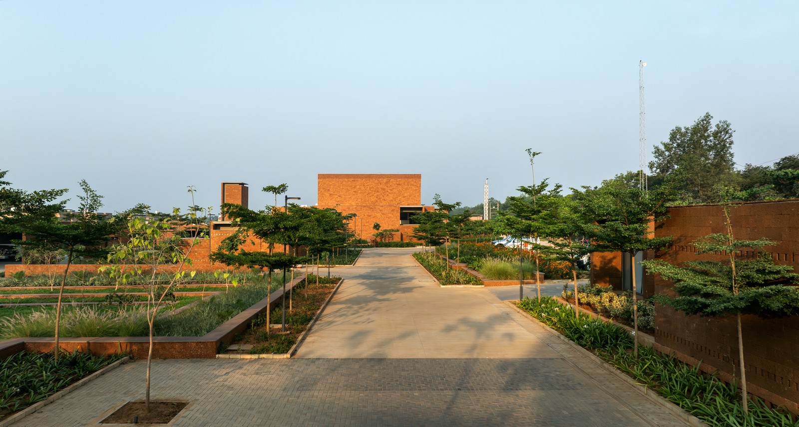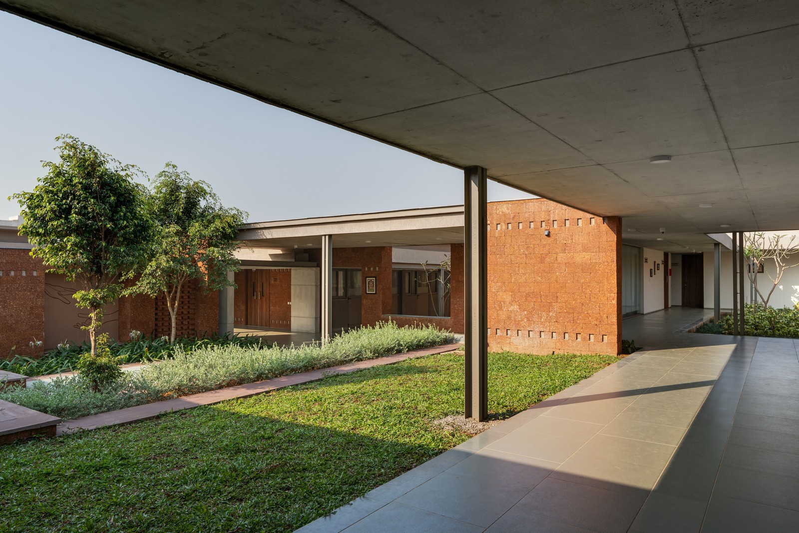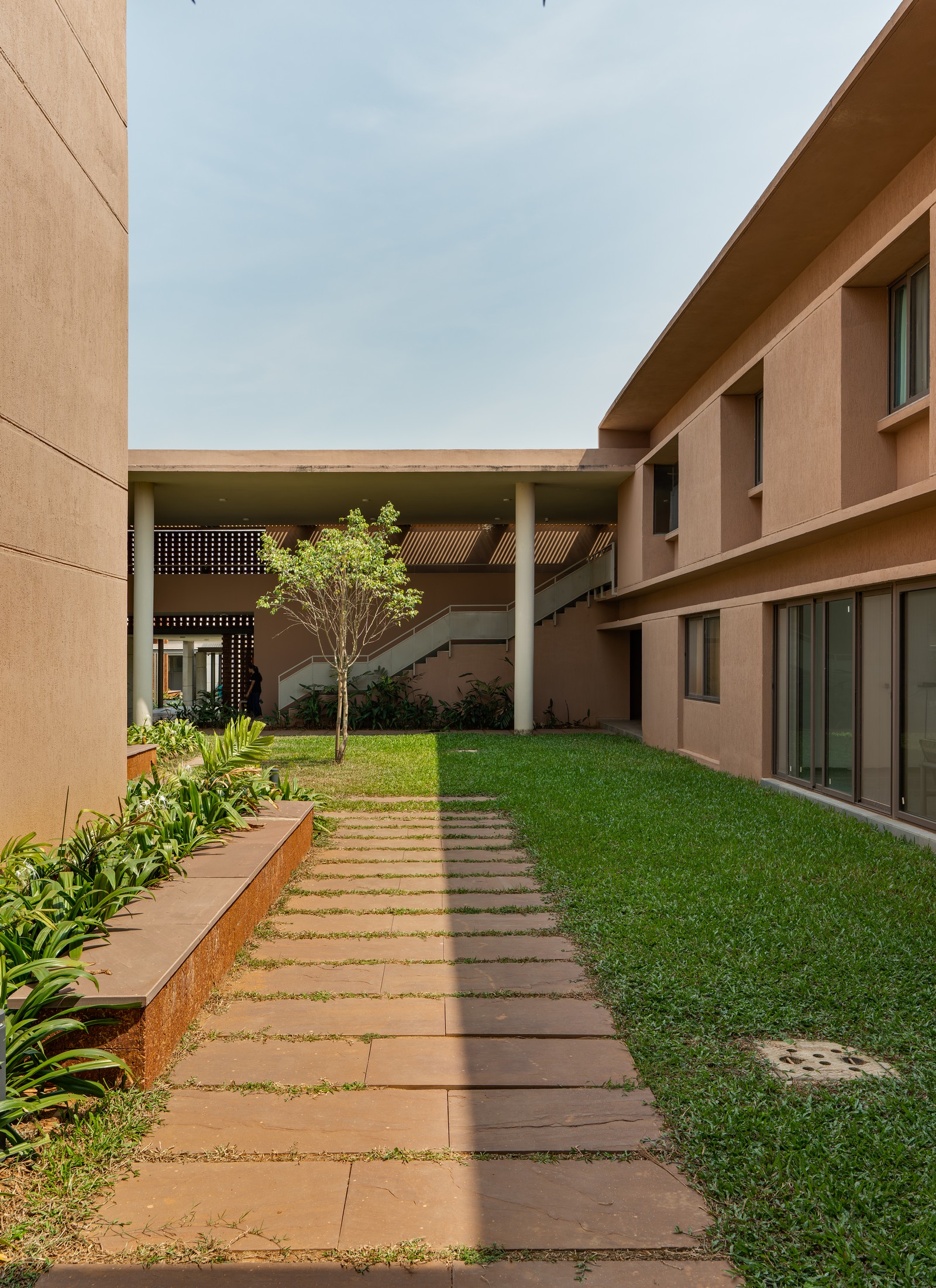 Una plaza central ajardinada, accesible mediante un recorrido con eje ligeramente desplazado, actúa como columna vertebral contemplativa que conecta las instalaciones principales. La arquitectura, sobria y de carácter terroso, se despliega gradualmente mediante la interacción entre espacios construidos y vacíos.