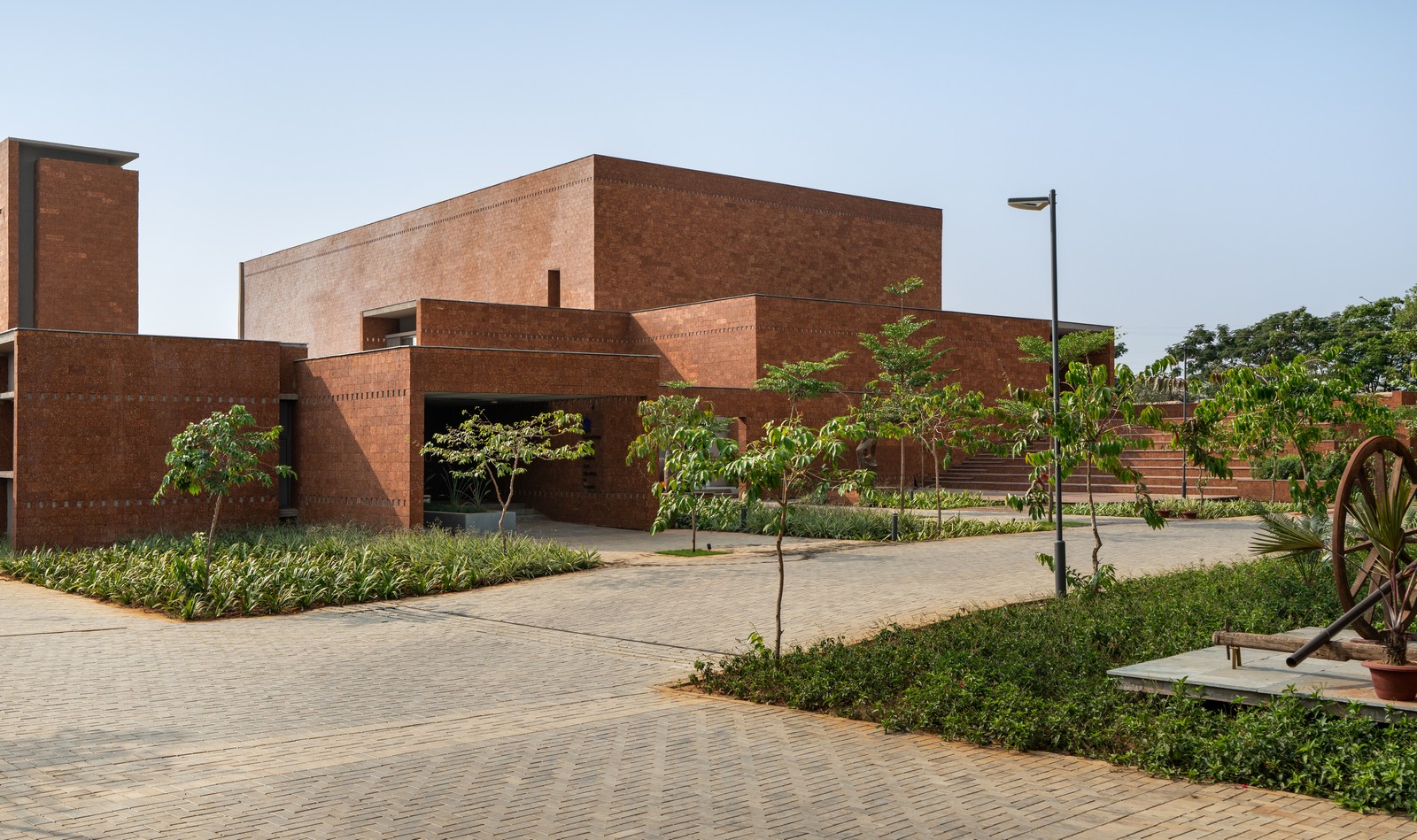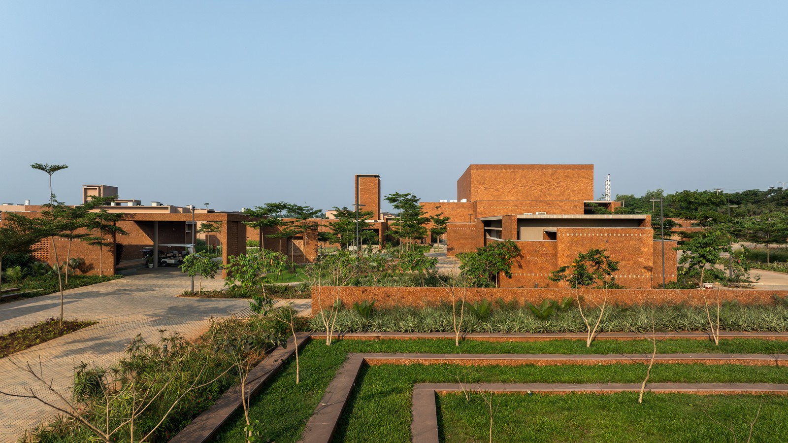 Situado en un terreno de 20 acres moldeado por antiguas canteras de laterita, el relieve natural, marcado por depresiones y una suave pendiente, ha sido respetuosamente integrado. Estas depresiones se han reinterpretado como estanques de captación de agua de lluvia, reflejando una integración armoniosa entre paisaje y arquitectura.