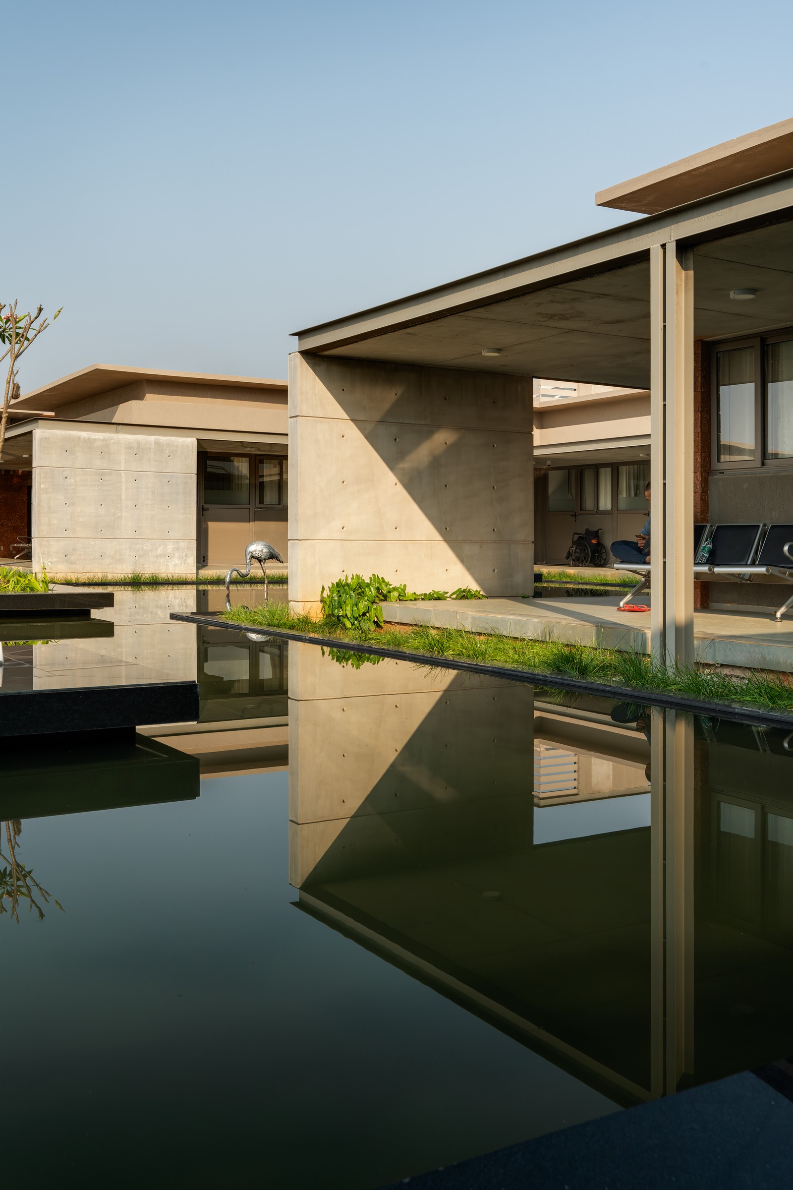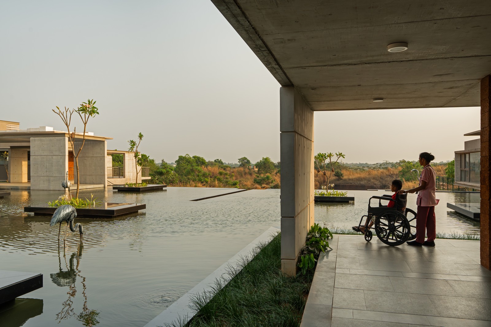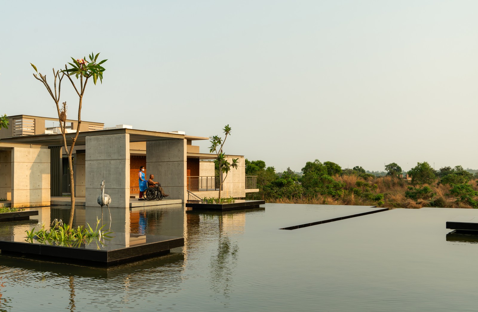 Pantallas de laterita tipo jaali filtran la luz solar y la ventilación, equilibrando apertura y privacidad. Alrededor del cuerpo de agua y las salas, superficies de hormigón texturizado complementan la piedra natural. El arte desempeña un papel discreto pero poderoso: pinturas Patachitra y Saura, ubicadas en nichos de pasillos y patios, narran historias de sanación y tradición. Esculturas realizadas con metal reciclado por artesanos locales introducen temas de compasión, duelo y resiliencia, resonando con la experiencia humana del hospice.