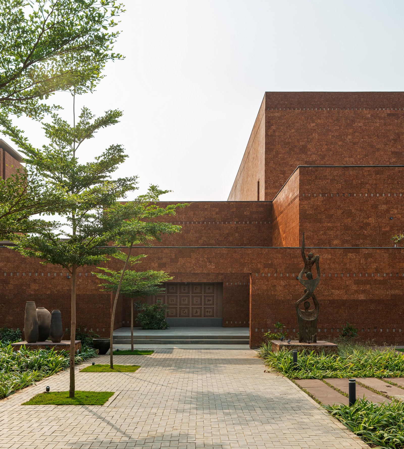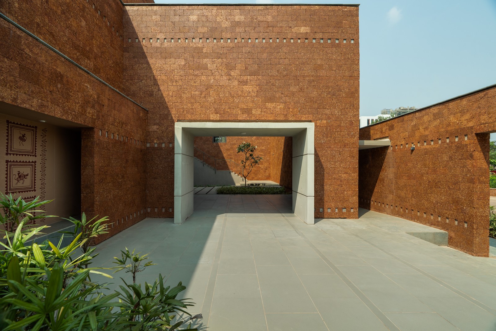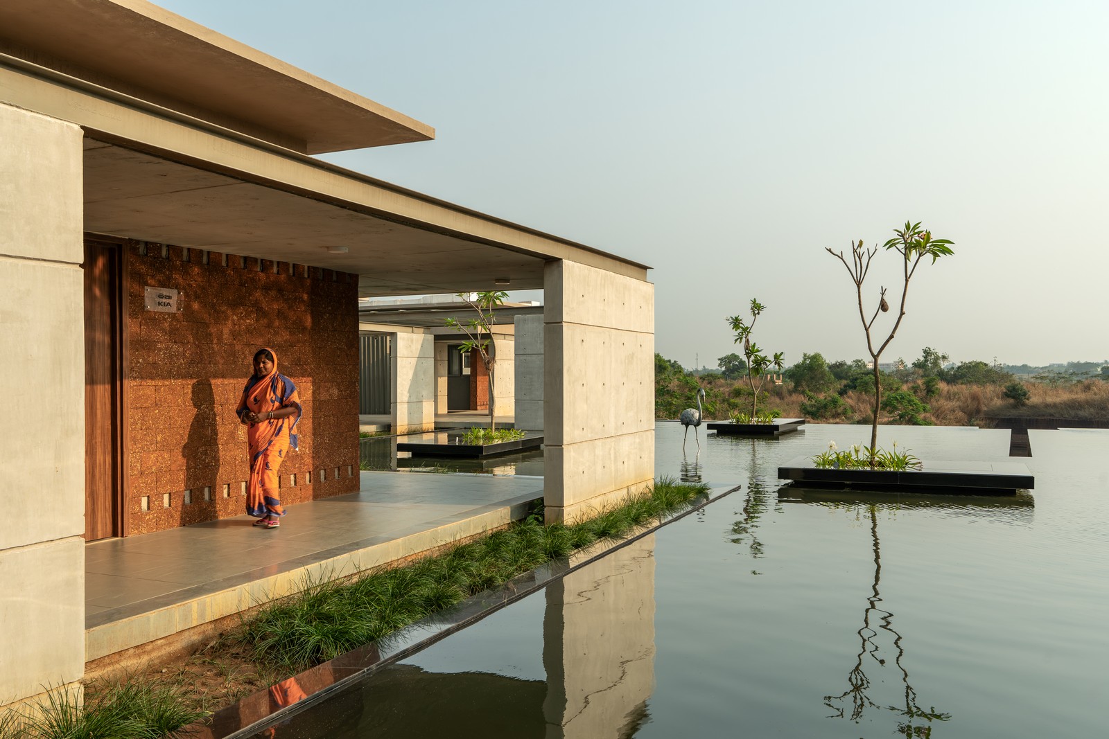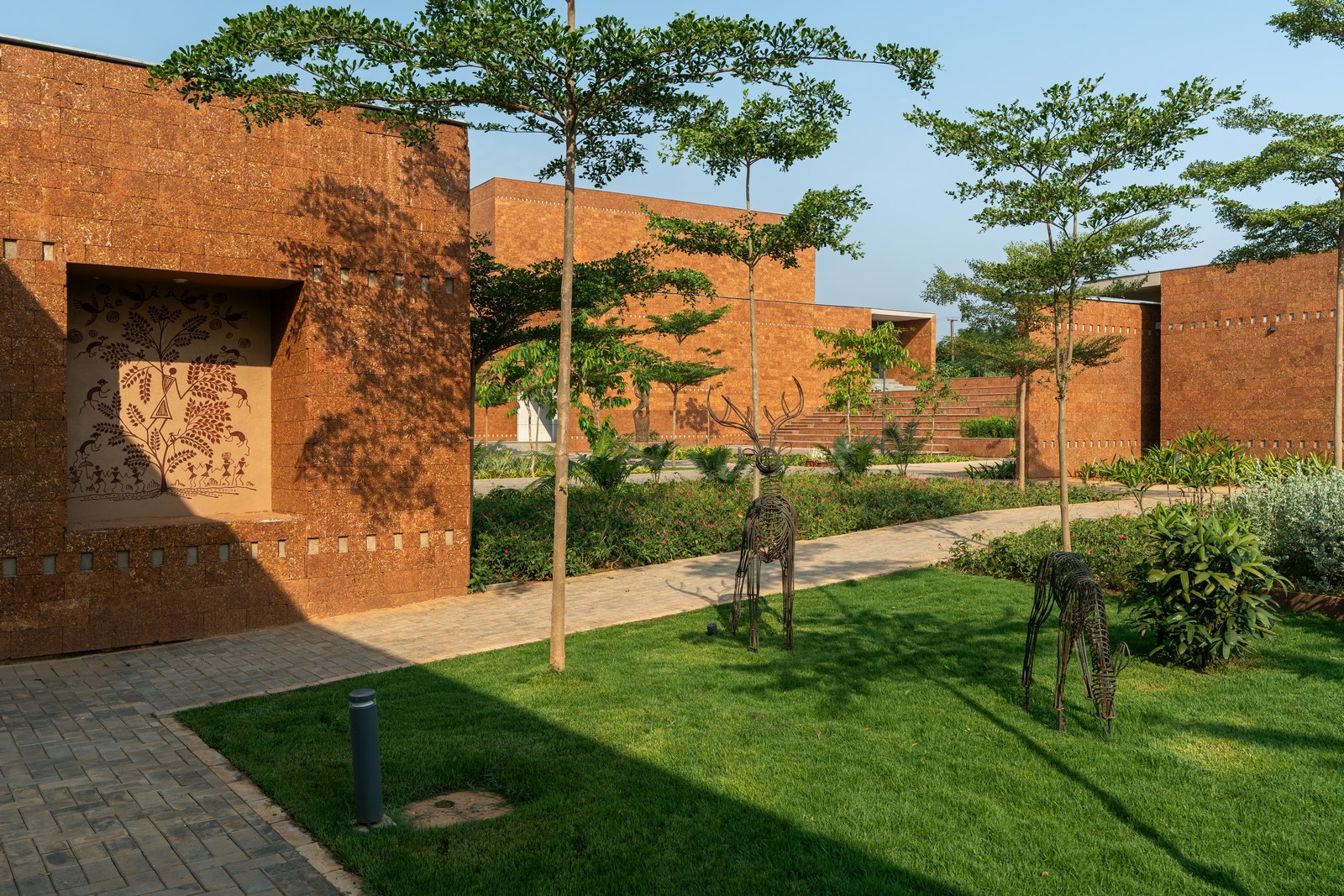 Pantallas de laterita tipo jaali filtran la luz solar y la ventilación, equilibrando apertura y privacidad. Alrededor del cuerpo de agua y las salas, superficies de hormigón texturizado complementan la piedra natural. El arte desempeña un papel discreto pero poderoso: pinturas Patachitra y Saura, ubicadas en nichos de pasillos y patios, narran historias de sanación y tradición. Esculturas realizadas con metal reciclado por artesanos locales introducen temas de compasión, duelo y resiliencia, resonando con la experiencia humana del hospice.