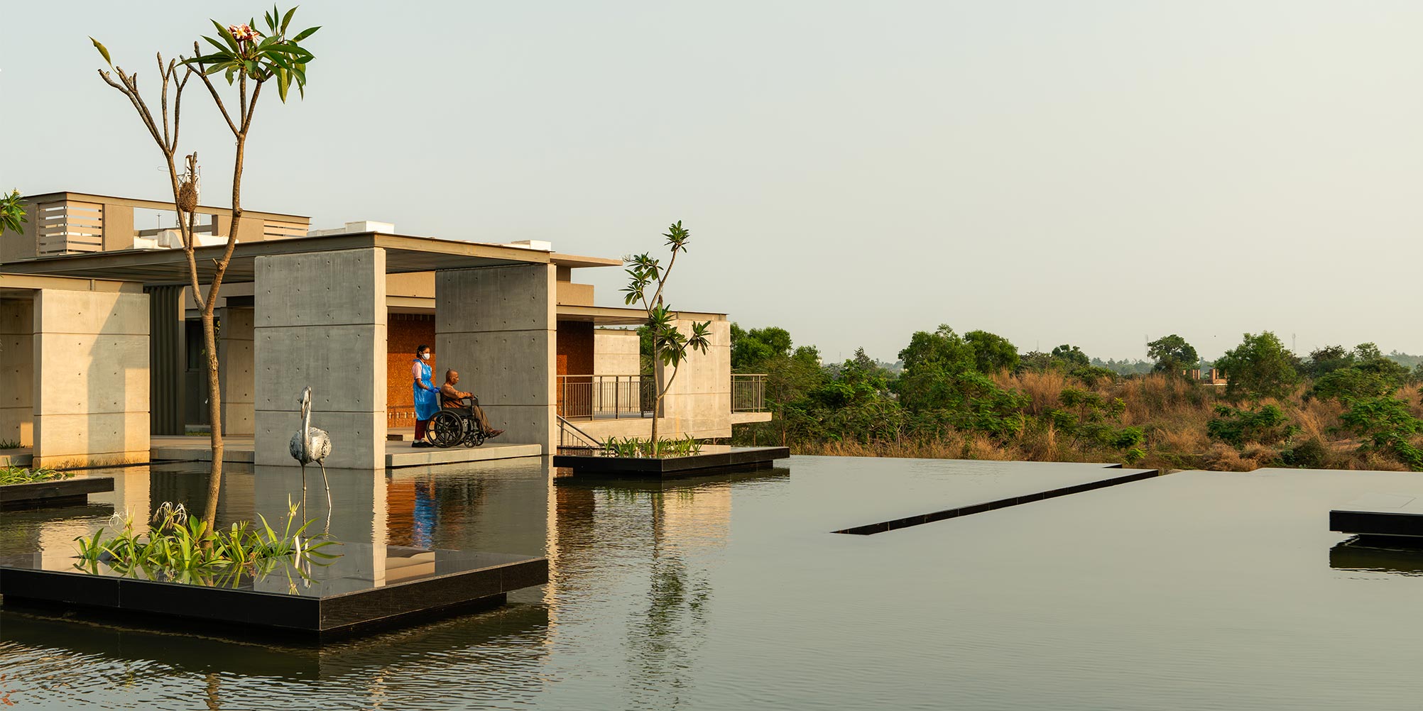 Pantallas de laterita tipo jaali filtran la luz solar y la ventilación, equilibrando apertura y privacidad. Alrededor del cuerpo de agua y las salas, superficies de hormigón texturizado complementan la piedra natural. El arte desempeña un papel discreto pero poderoso: pinturas Patachitra y Saura, ubicadas en nichos de pasillos y patios, narran historias de sanación y tradición. Esculturas realizadas con metal reciclado por artesanos locales introducen temas de compasión, duelo y resiliencia, resonando con la experiencia humana del hospice.