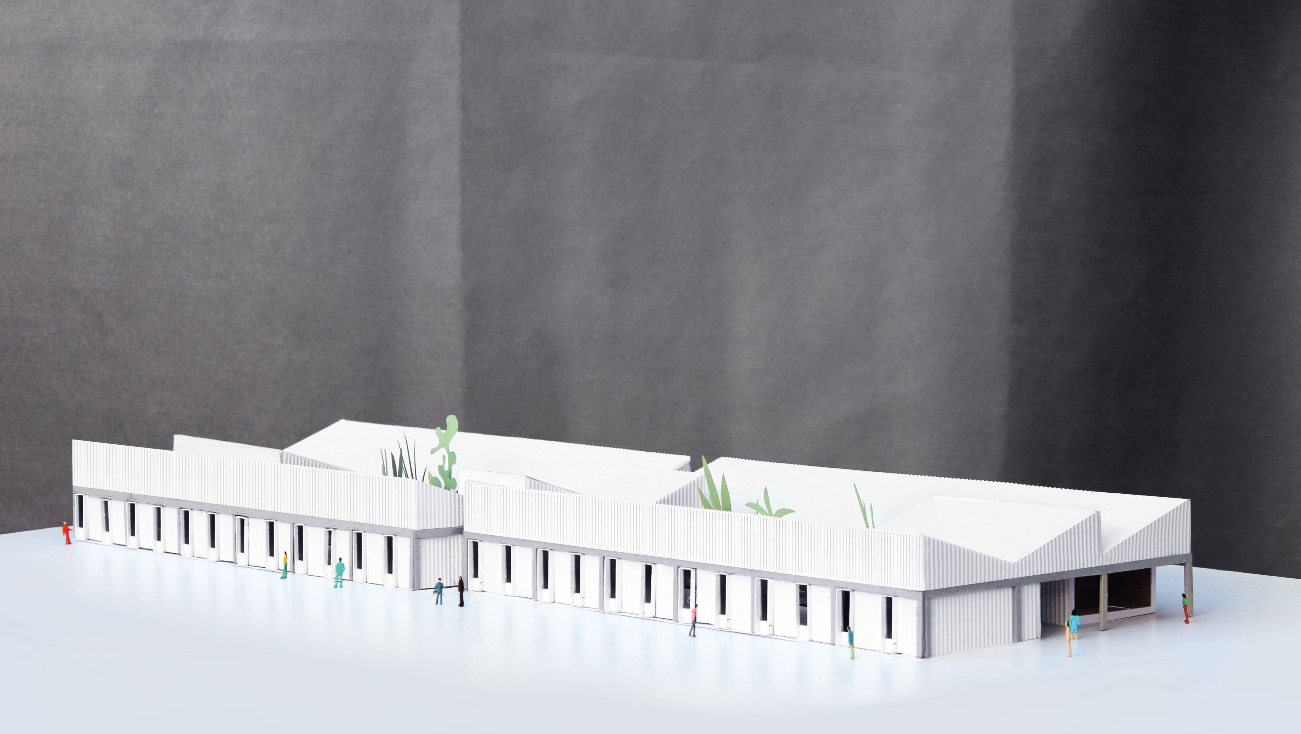Su volumen muestra un sistema de cubiertas inclinadas que se integra con los perfiles de las zonas verdes y futuras viviendas que rodearán al edificio, dando un aspecto más humano y cercano al contar con un perfil reconocible y doméstico, que desplazan la idea de Centro de Salud como un centro institucional, e introduce una visión como Casa de los Cuidados.