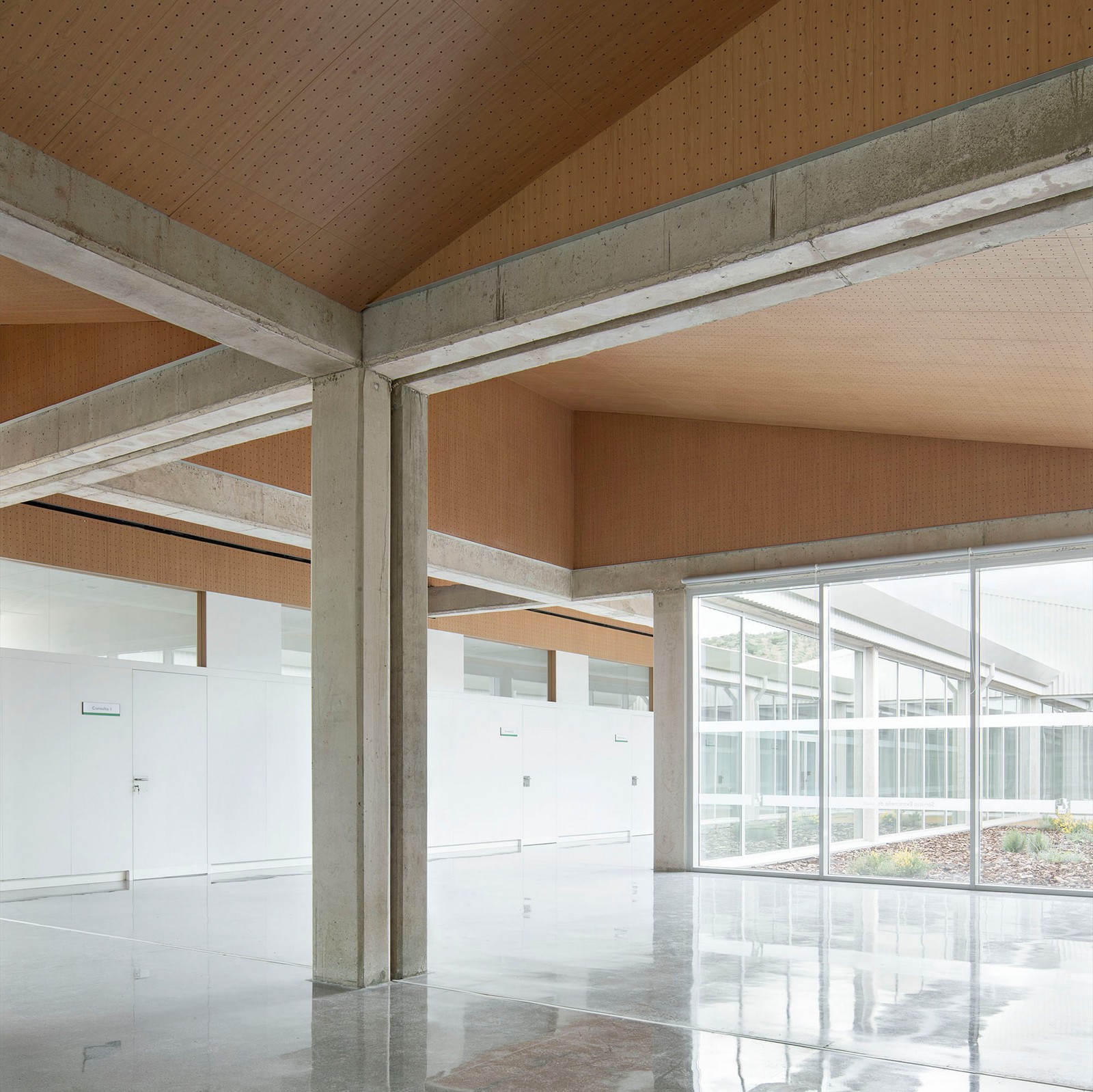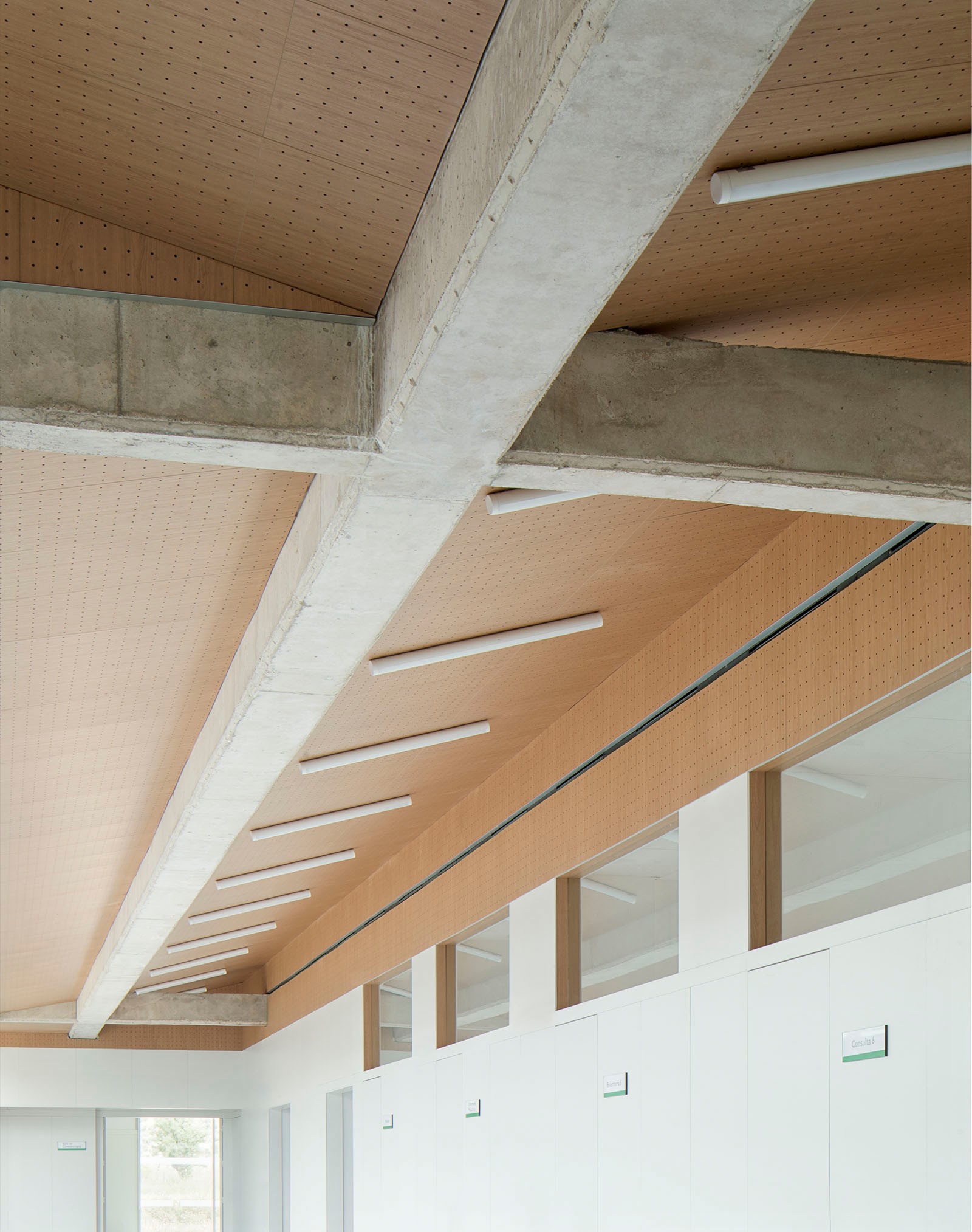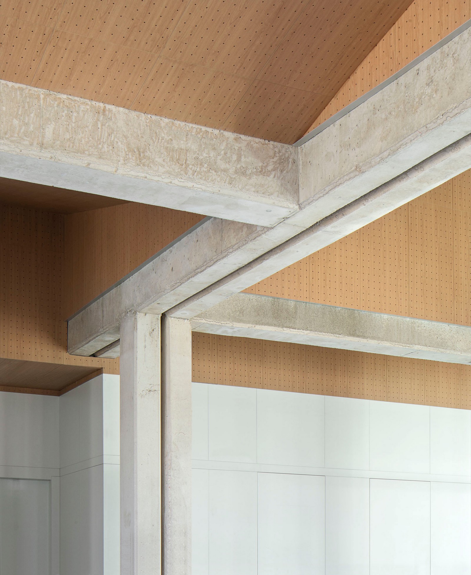 Interiormente, el perfil de las cubiertas inclinadas se extiende por todo el centro, inundando los espacios con una carcasa de madera cálida, una constelación que abriga.