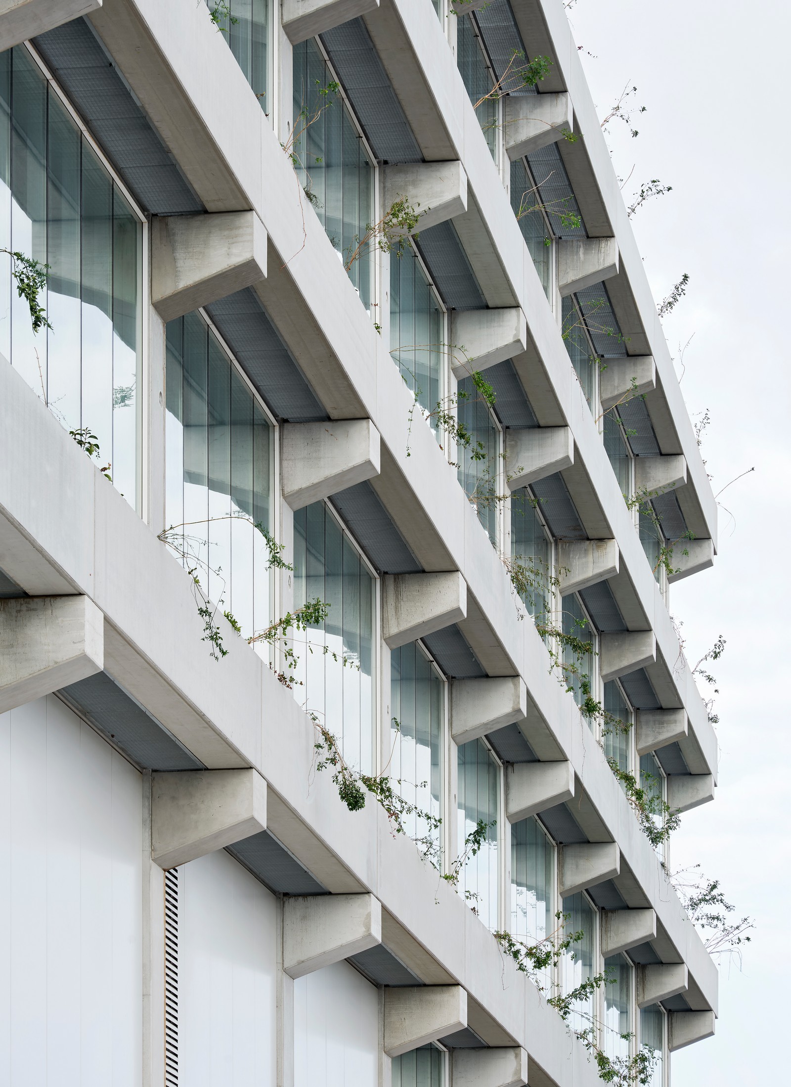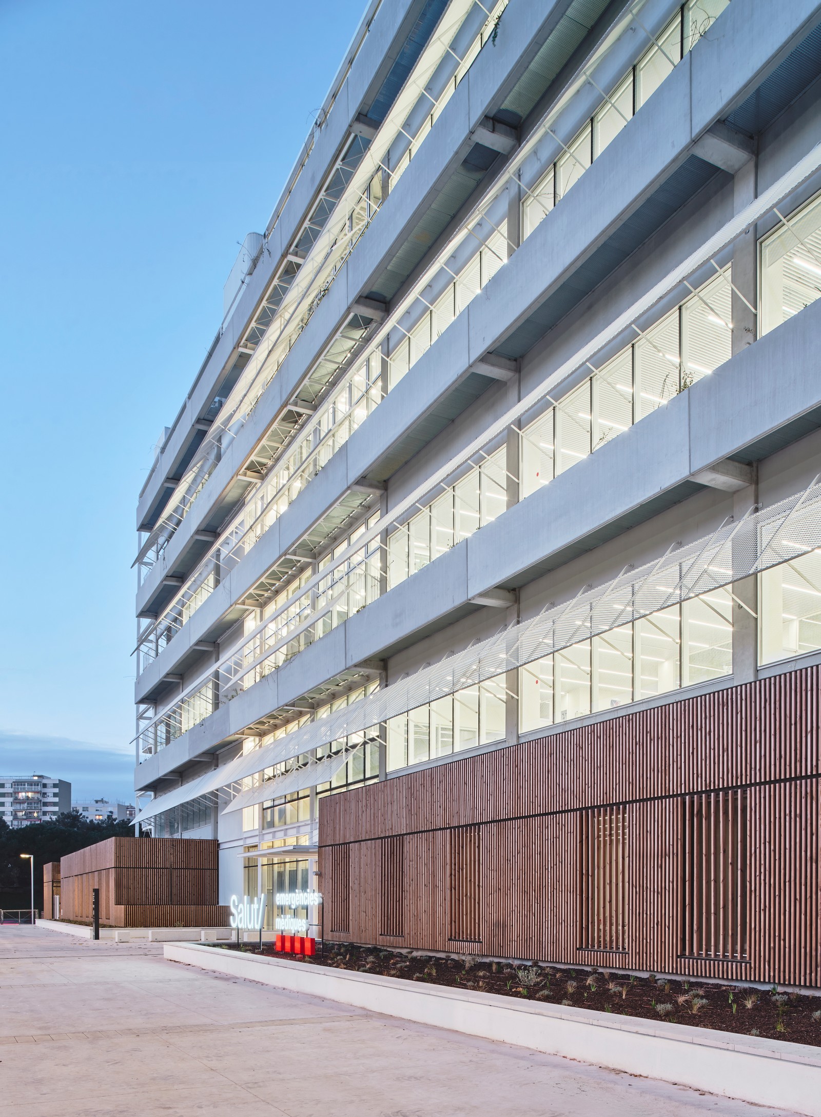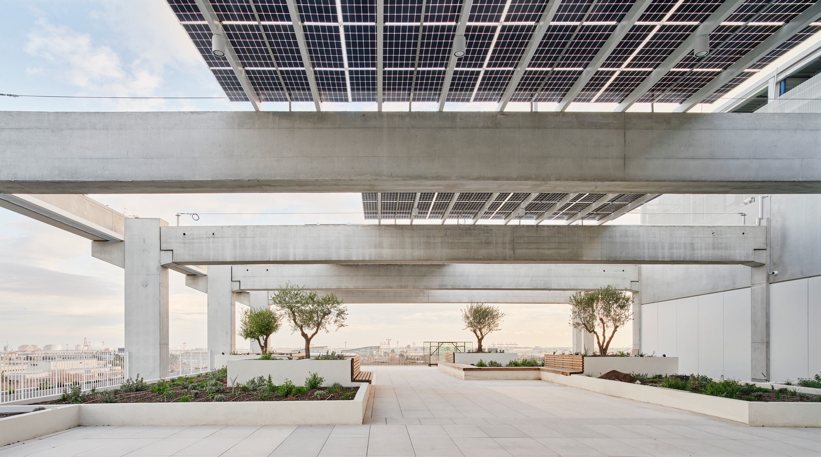 Se aplicó una estrategia de sostenibilidad integral, con medidas pasivas y activas. Desde el diseño de fachadas adaptadas, donde la superficie acristalada en orientaciones más expuestas cuenta con elementos de protección que permiten la visión exterior no tamizada, hasta la introducción de un patio bioclimático en el centro del edificio como espacio templado de relación entre los trabajadores y una pérgola fotovoltaica dando sombra a la terraza. Por lo que respecta a la huella de carbono embebida, la industrialización en la obra supone una reducción de 1032 Tm de CO2. Las soluciones constructivas se han definido teniendo en cuenta el plazo de ejecución, el coste de construcción y la durabilidad de los materiales, reduciendo los futuros costes de mantenimiento. Unas grandes jardineras continuas de hormigón prefabricado componen las fachadas junto a su pasarela de mantenimiento, y protegerán de la radiación cuando la vegetación alcance su madurez, e introducen una beneficiosa biofilia, amable tanto hacia la ciudad como hacia el trabajador.
