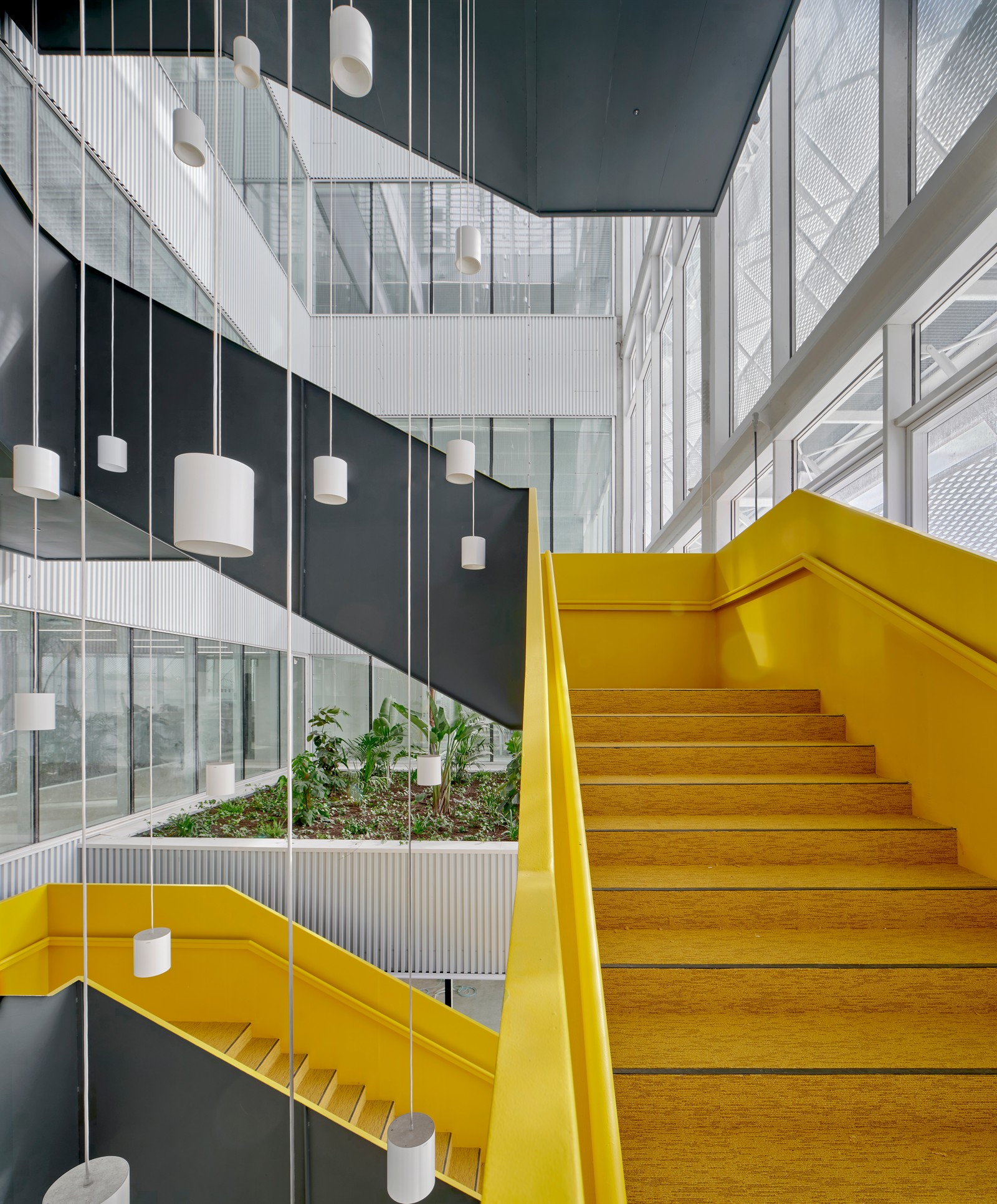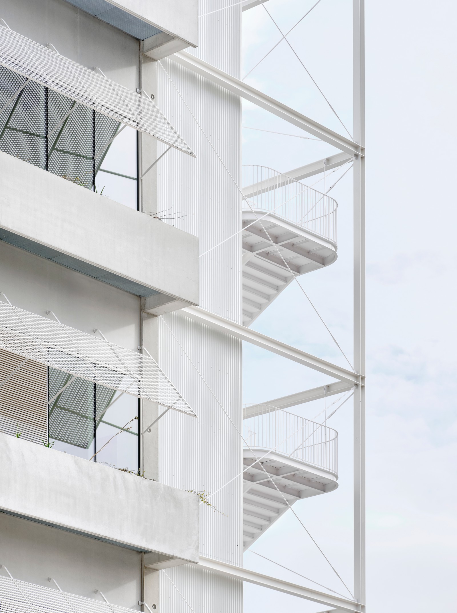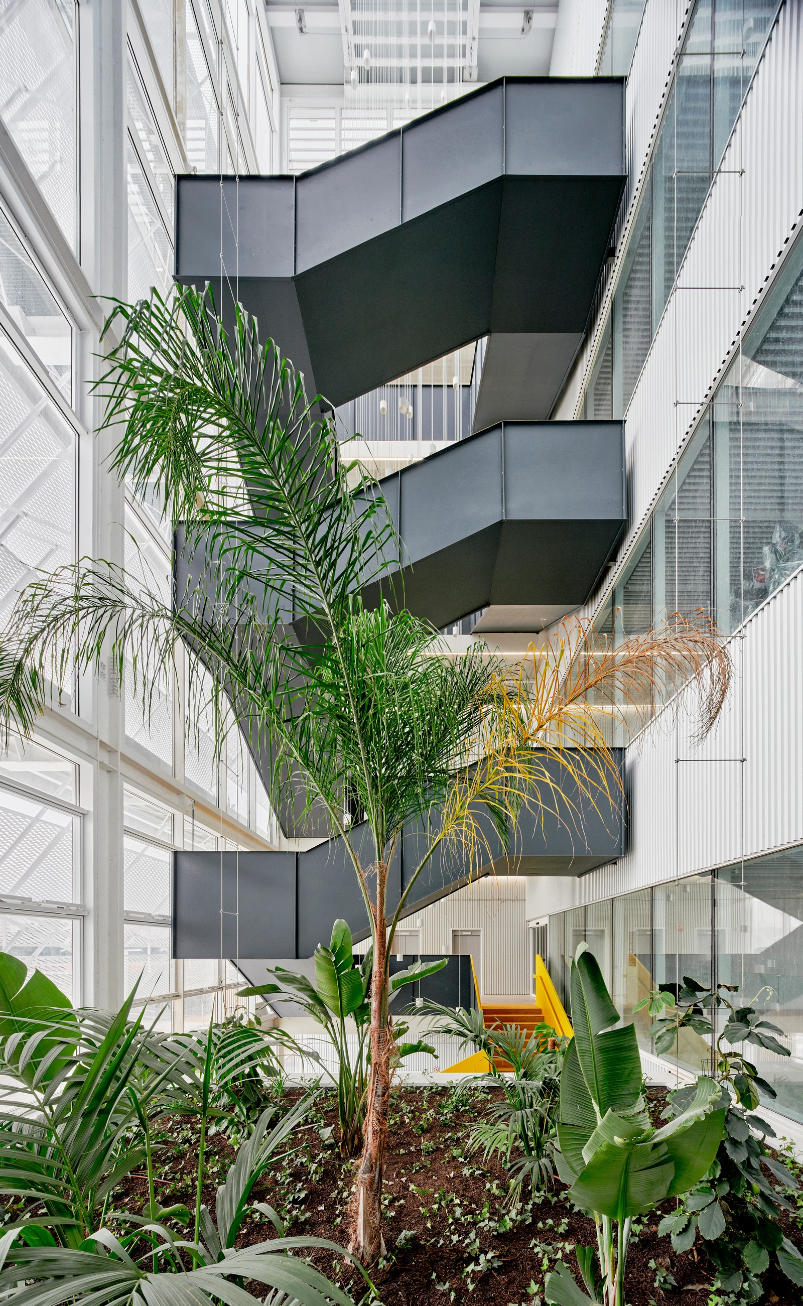 Se aplicó una estrategia de sostenibilidad integral, con medidas pasivas y activas. Desde el diseño de fachadas adaptadas, donde la superficie acristalada en orientaciones más expuestas cuenta con elementos de protección que permiten la visión exterior no tamizada, hasta la introducción de un patio bioclimático en el centro del edificio como espacio templado de relación entre los trabajadores y una pérgola fotovoltaica dando sombra a la terraza. Por lo que respecta a la huella de carbono embebida, la industrialización en la obra supone una reducción de 1032 Tm de CO2. Las soluciones constructivas se han definido teniendo en cuenta el plazo de ejecución, el coste de construcción y la durabilidad de los materiales, reduciendo los futuros costes de mantenimiento. Unas grandes jardineras continuas de hormigón prefabricado componen las fachadas junto a su pasarela de mantenimiento, y protegerán de la radiación cuando la vegetación alcance su madurez, e introducen una beneficiosa biofilia, amable tanto hacia la ciudad como hacia el trabajador.