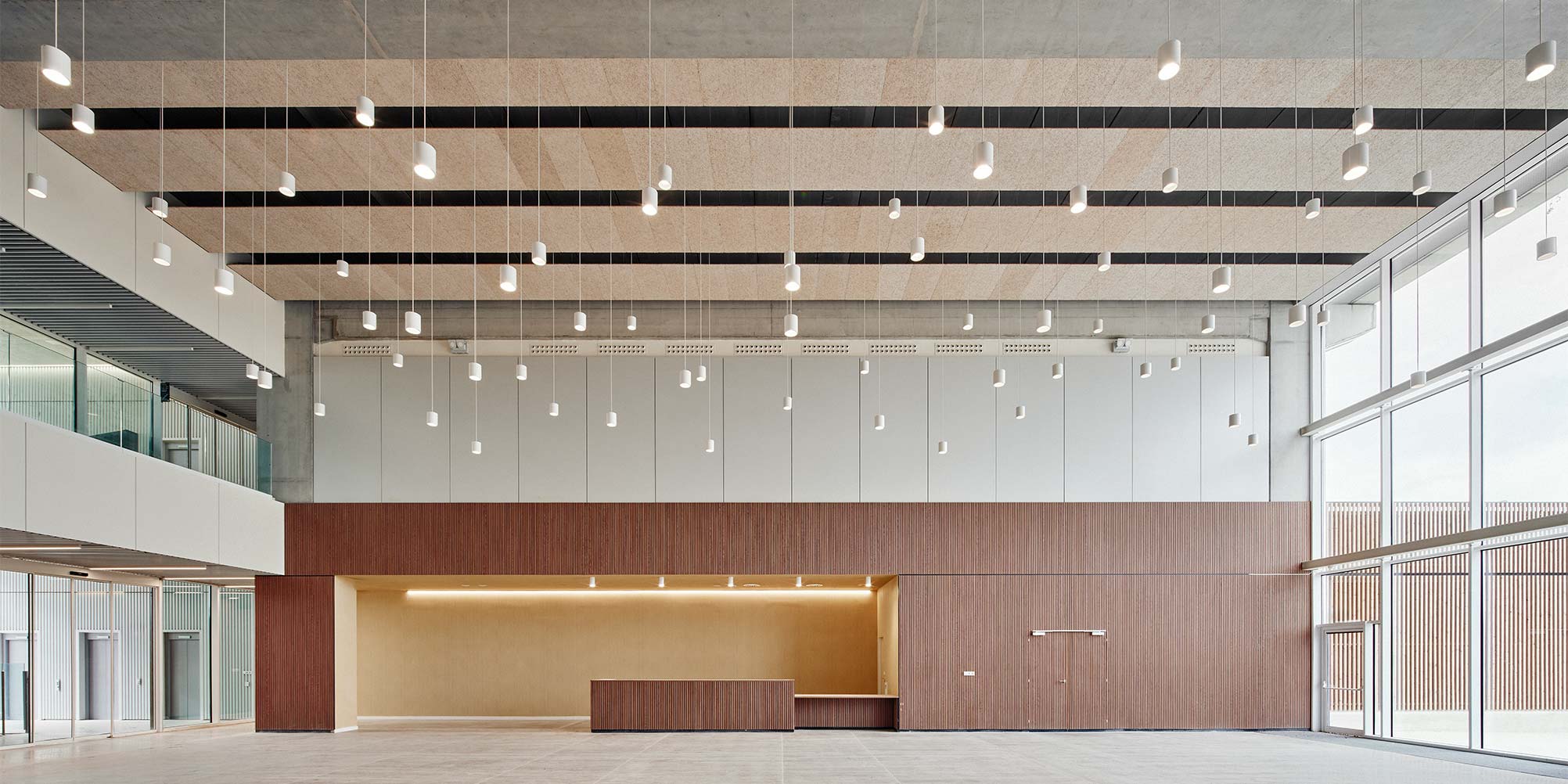 Un edificio necesariamente compacto (por economía, sostenibilidad y condicionantes de parcela) que se ubica en el actual conjunto Hospitalario Duran i Reynals, dialogando de forma equilibrada con las preexistencias y respetando las alineaciones del Hospital, por lo que se entiende como un volumen más del ritmo compositivo actual, reforzando la fachada del conjunto en la Gran Vía. La configuración de la propuesta tiene en cuenta el futuro plan urbanístico, proponiendo un vestíbulo pasante que permite un encaje urbano actual y futuro en el campus. El esquema funcional del edificio responde a la necesidad de una infraestructura flexible y adaptable al cambio. El edificio se compone de dos franjas programáticas claras, ubicadas en paralelo: una para los espacios principales de trabajo, desarrollados en salas diáfanas de 2.000m2; otra para los espacios auxiliares, en los que se concentran los servicios, núcleos de circulación y espacios segundarios en cada planta. El sistema estructural genera plantas libres de pilares en cada franja, permitiendo el máximo grado de adaptabilidad.