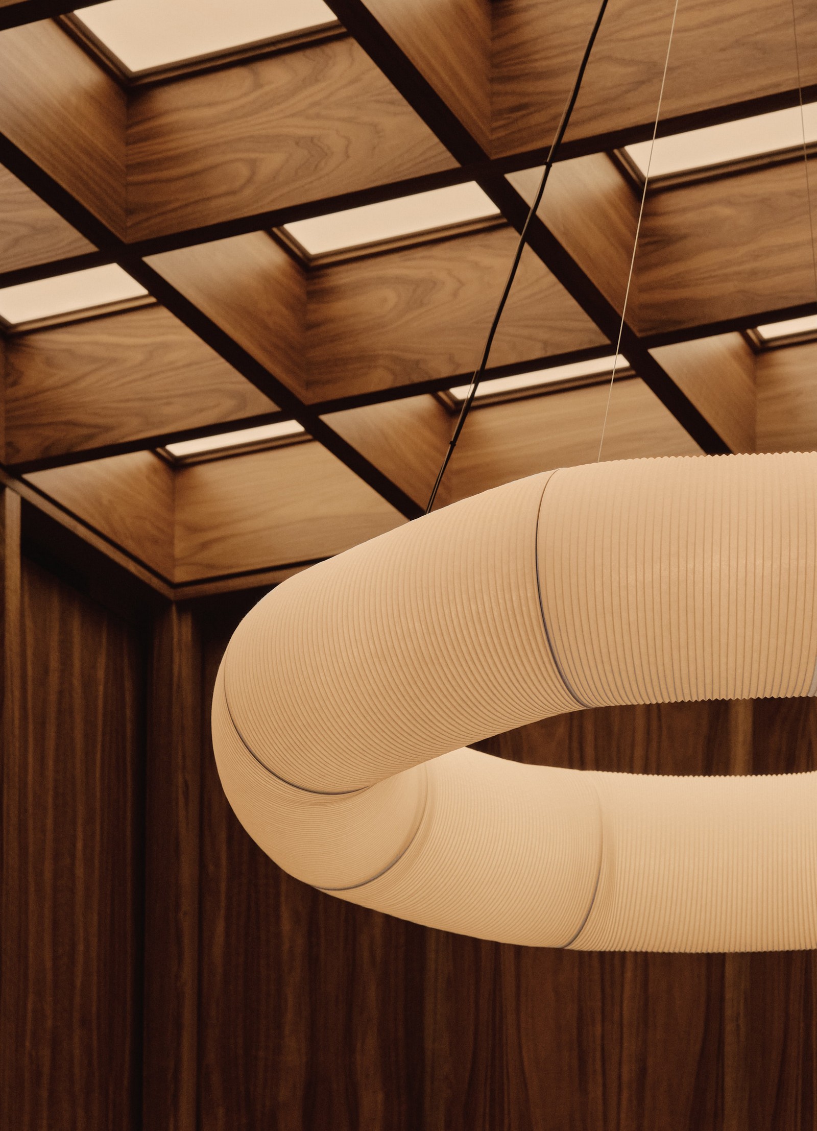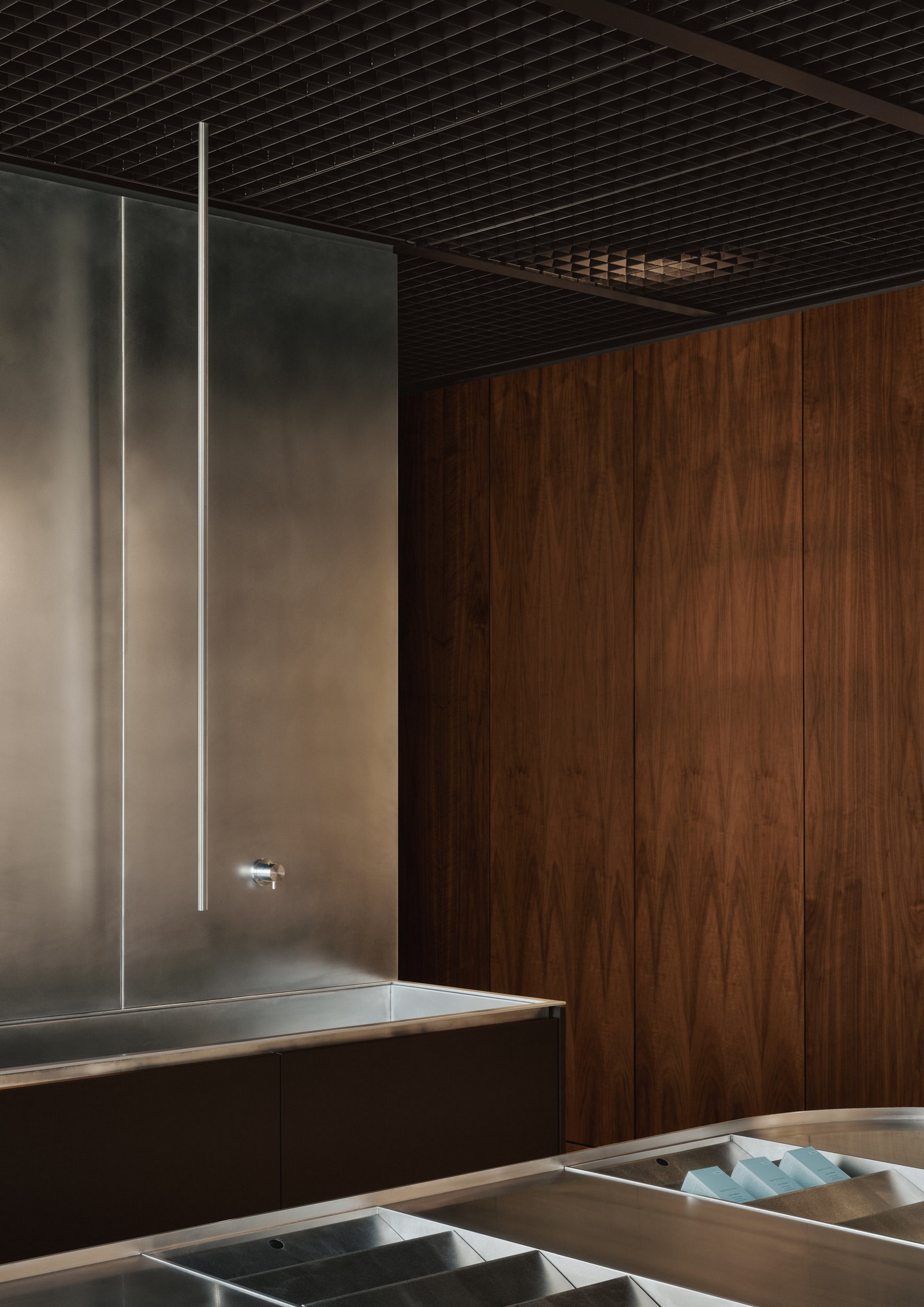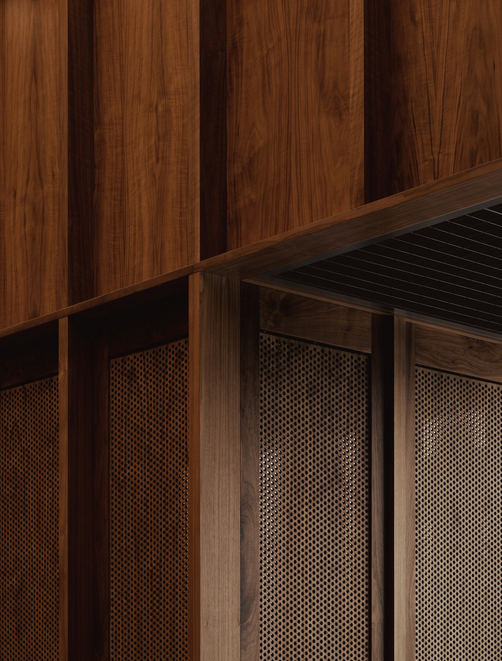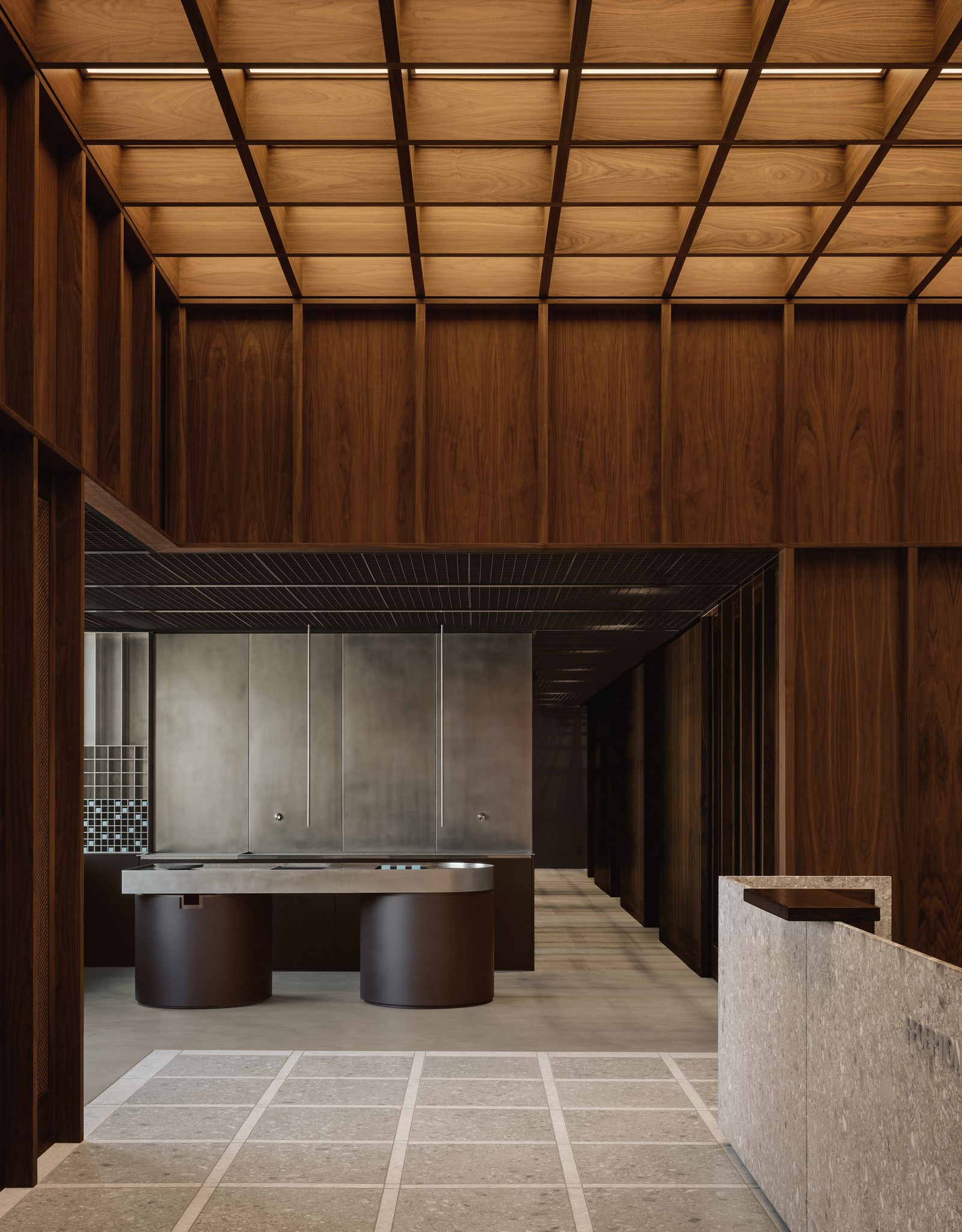 El enfoque conceptual se basó, por tanto, en la articulación de la luz y la intimidad, estableciendo una jerarquía entre ambas en diálogo con los componentes programáticos. Se desarrolló una organización espacial estratificada para disponer las áreas de tratamiento alrededor de un volumen central de doble altura; la inserción de una gran claraboya que difunde una luz diáfana se extiende por todo el espacio, realzando su sensación de grandeza. Predomina el revestimiento de nogal, cuya calidez en la zona de recepción contrasta con el árido paisaje exterior, compuesto en gran parte por vastas y hostiles extensiones de estacionamiento.