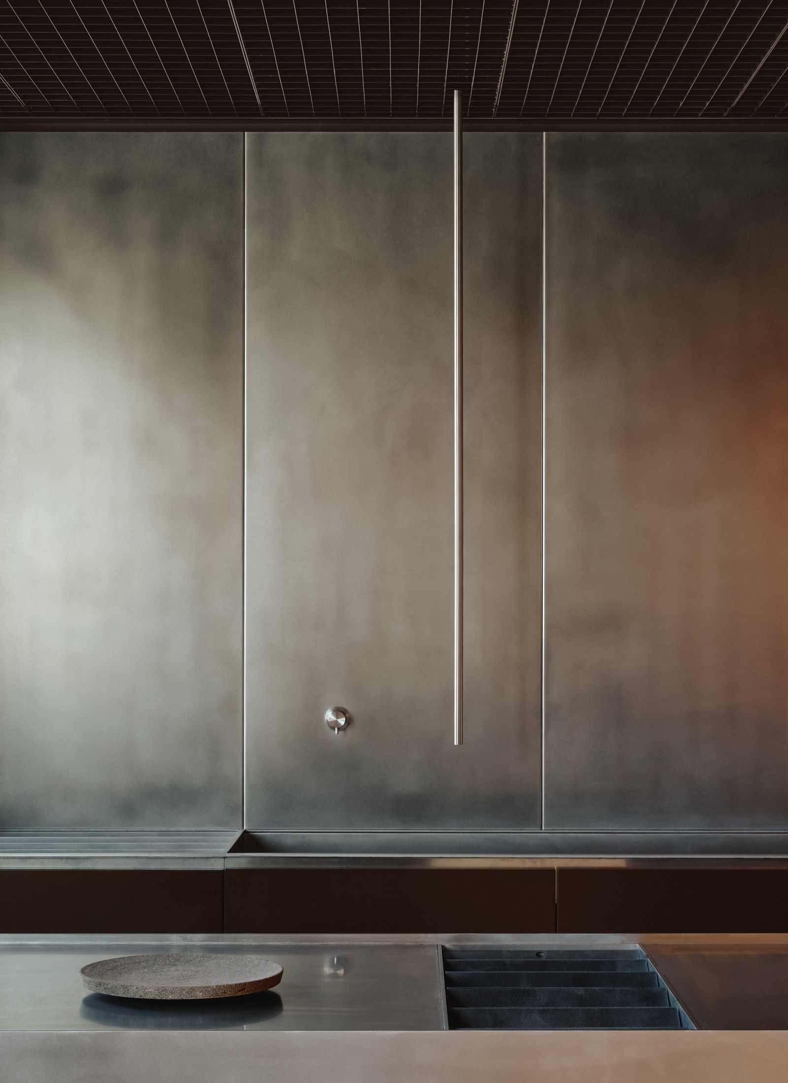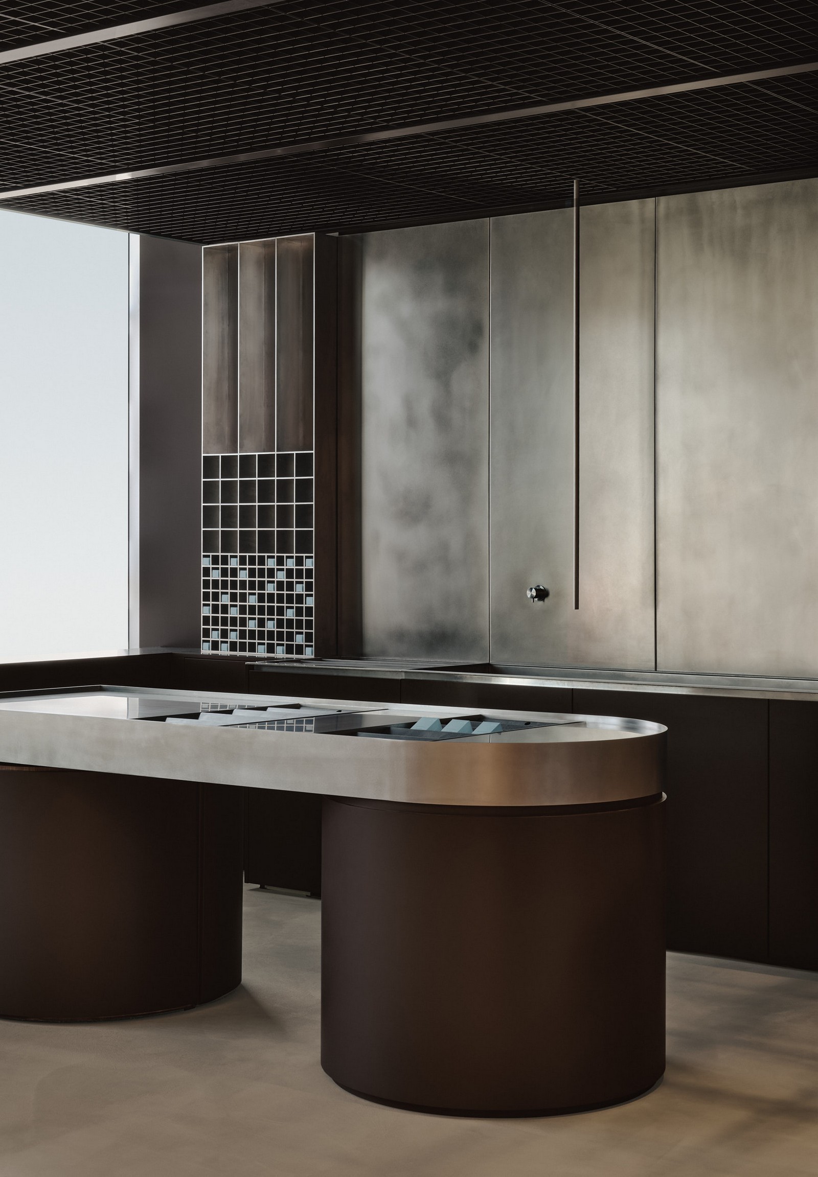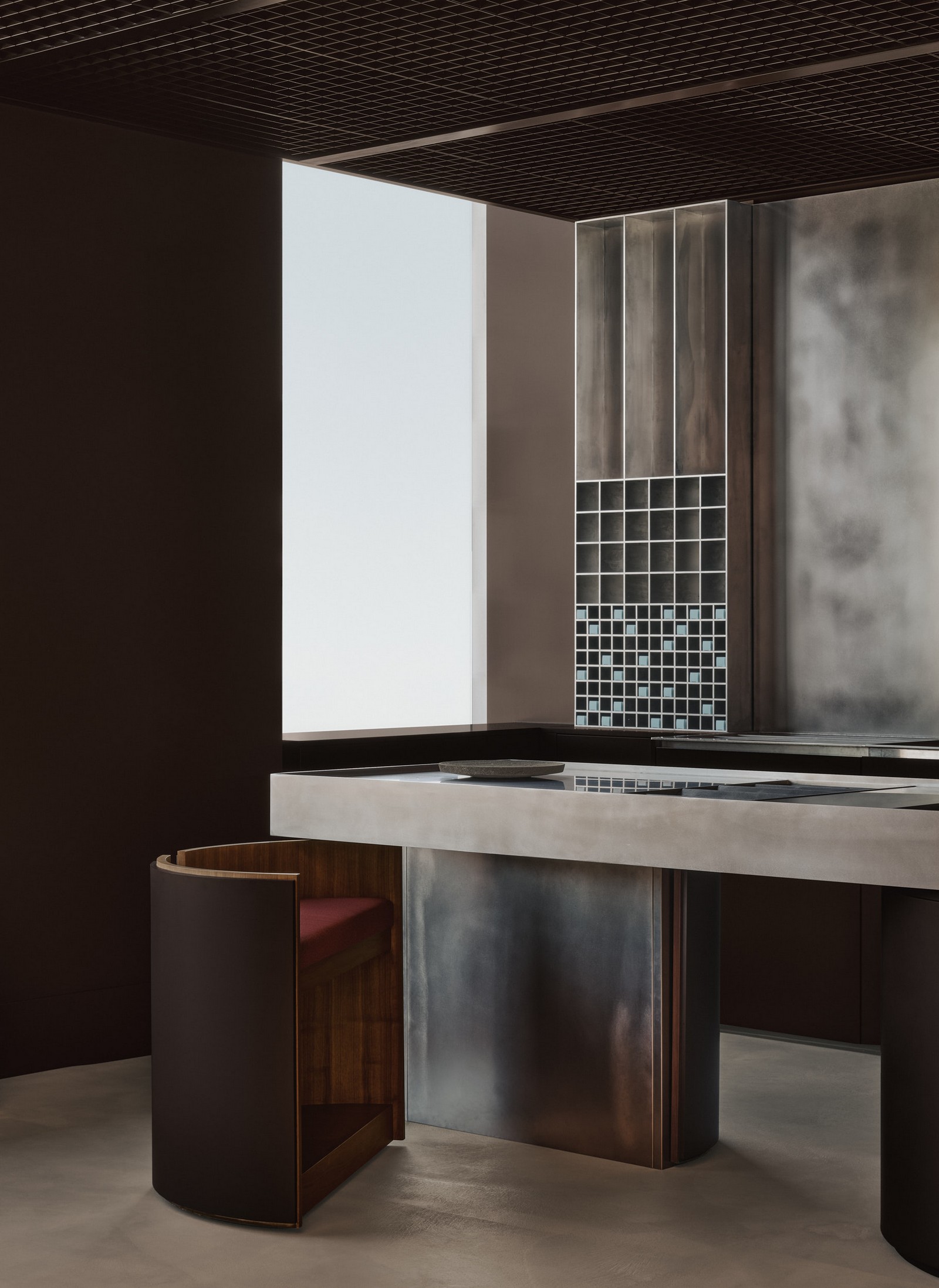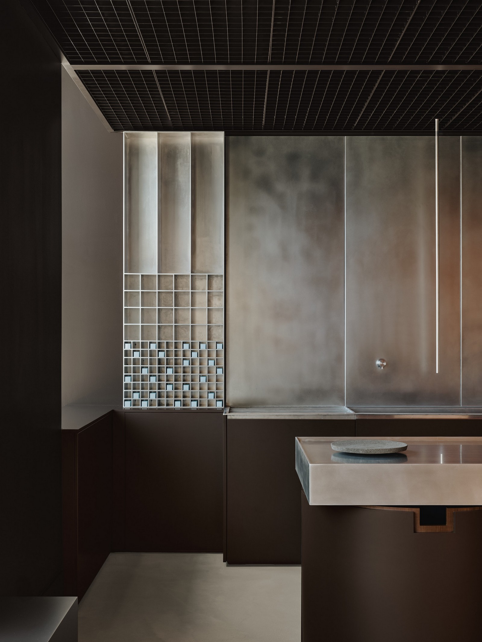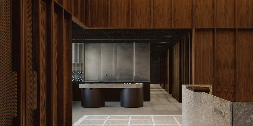 El enfoque conceptual se basó, por tanto, en la articulación de la luz y la intimidad, estableciendo una jerarquía entre ambas en diálogo con los componentes programáticos. Se desarrolló una organización espacial estratificada para disponer las áreas de tratamiento alrededor de un volumen central de doble altura; la inserción de una gran claraboya que difunde una luz diáfana se extiende por todo el espacio, realzando su sensación de grandeza. Predomina el revestimiento de nogal, cuya calidez en la zona de recepción contrasta con el árido paisaje exterior, compuesto en gran parte por vastas y hostiles extensiones de estacionamiento.