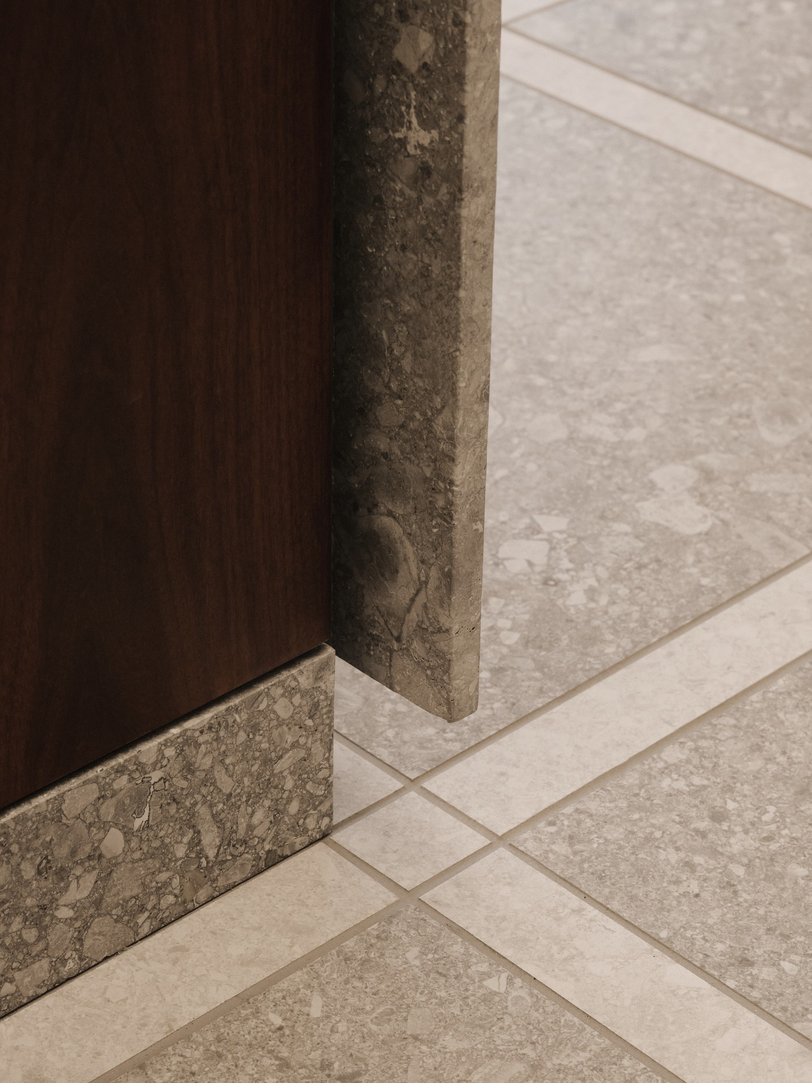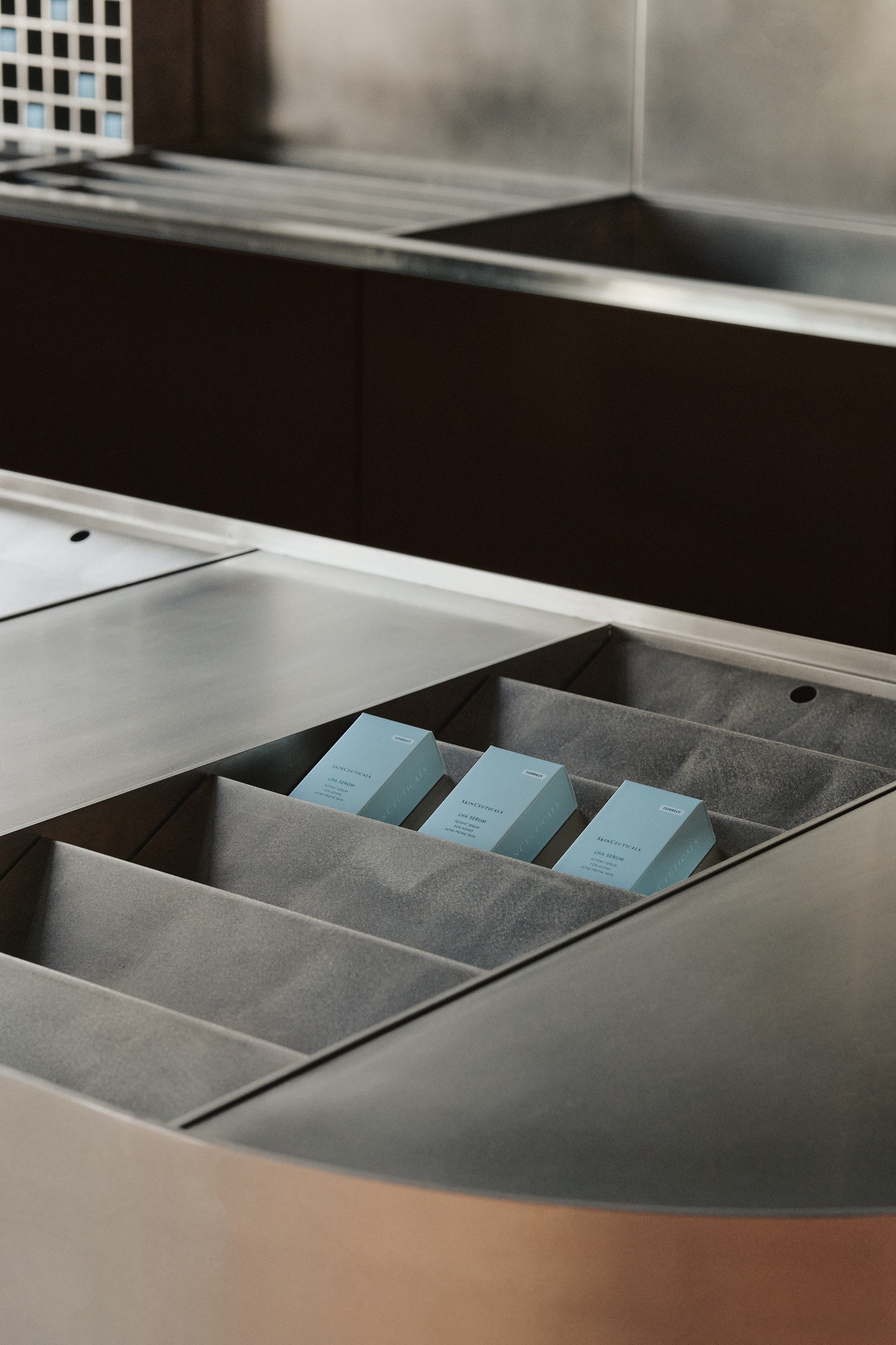 Dos funciones relacionadas con el programa principal ocupan los espacios laterales de esta zona «central», lo que confiere una dimensión más pública a las instalaciones: una cafetería diseñada para uso del personal y los pacientes, y una boutique de cosméticos equipada con un mostrador de pruebas. Estos tres espacios funcionan conjuntamente como una zona pública, lo que garantiza una transición gradual hacia las salas de tratamiento.