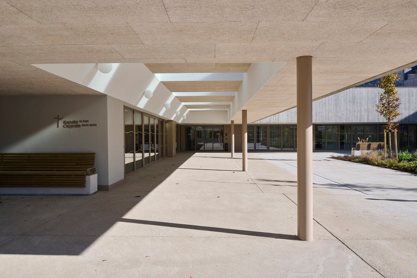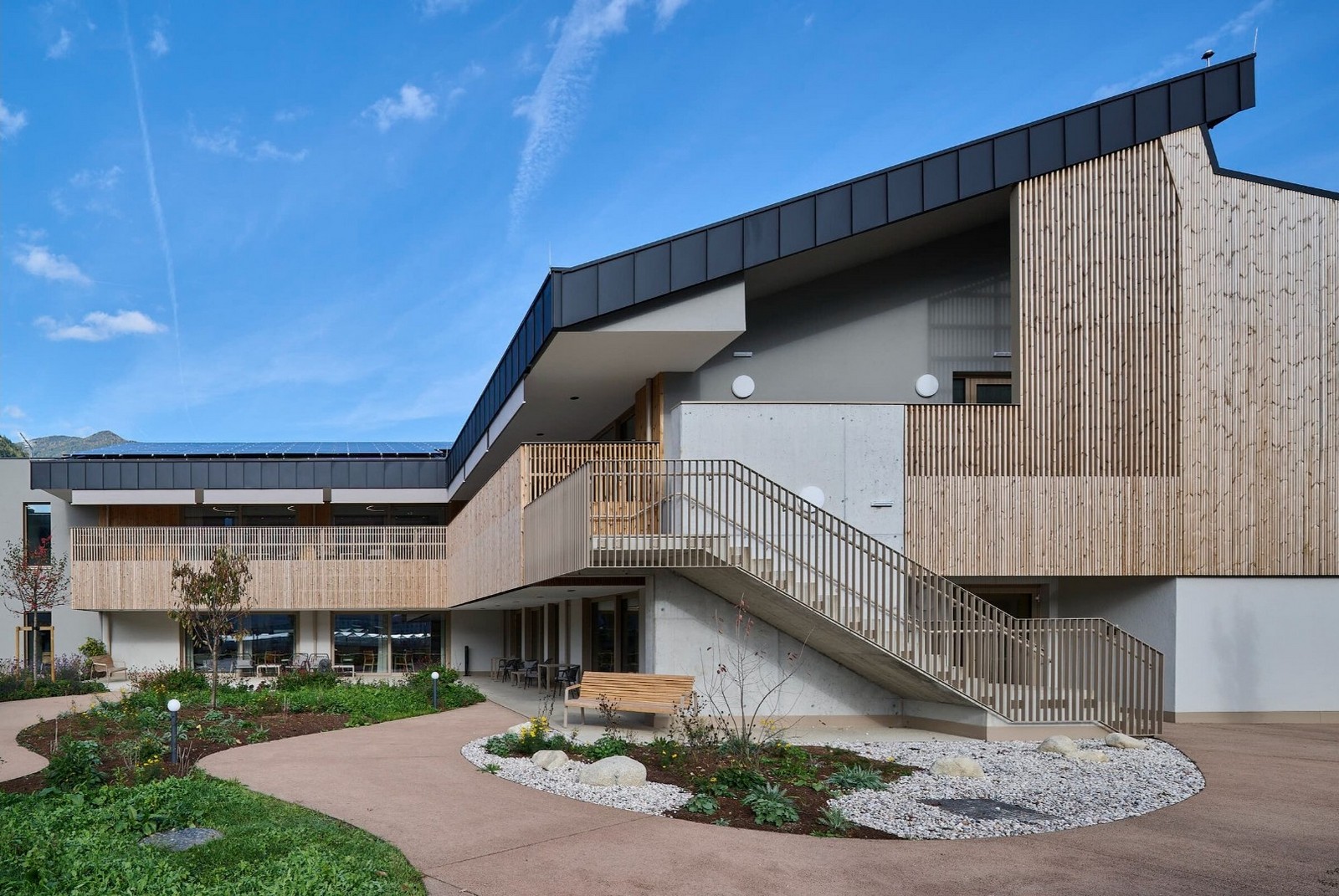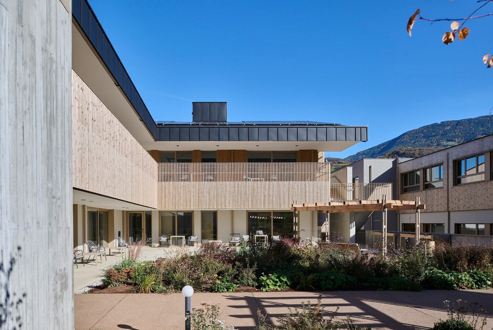 El contexto montañoso también ha influido en las decisiones constructivas y de materiales. El edificio más alto, que alberga los apartamentos para mayores autosuficientes y se sitúa parcialmente sobre el centro de día, interactúa con el complejo hospitalario vecino, ofreciendo protección visual y acústica a la plaza y a los edificios más bajos. La sostenibilidad ambiental se ha perseguido mediante soluciones específicas: una estructura prefabricada de madera para los niveles superiores y elementos prefabricados de hormigón para las áreas en contacto con el suelo, optimizando así los tiempos de construcción. El uso de pino termotratado para las fachadas, un material resistente a las inclemencias del tiempo, la humedad y el frío característicos del clima alpino, no solo responde a criterios de sostenibilidad ambiental —el proyecto aspira a la certificación CasaClima clase A e integra la red de calefacción urbana—, sino que establece una continuidad material con la tradición constructiva local.