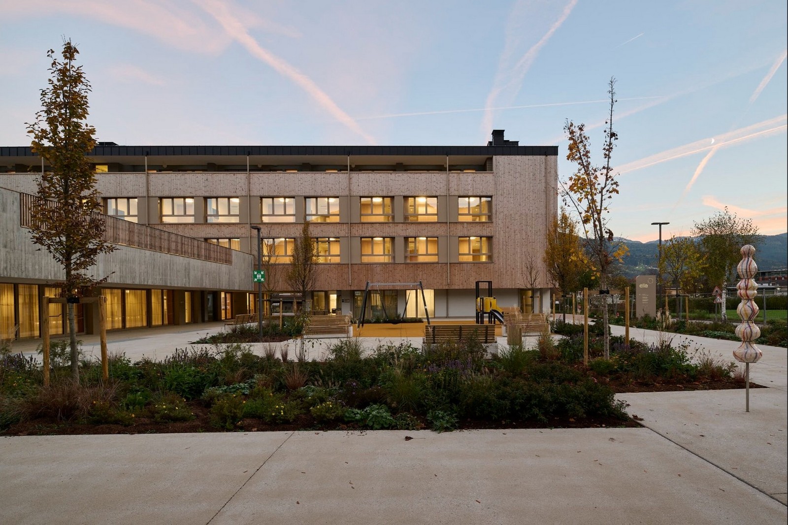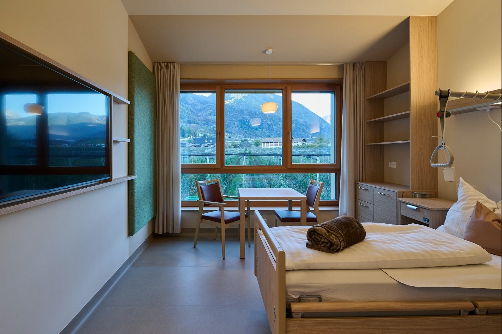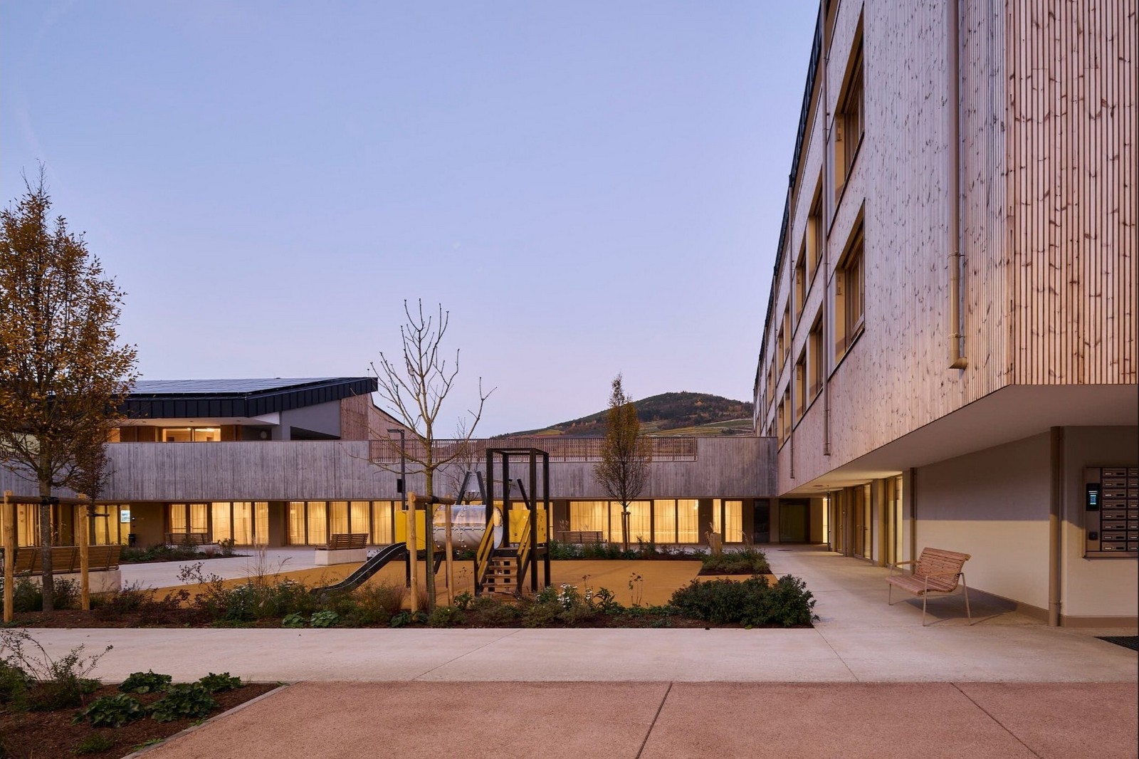El contexto montañoso también ha influido en las decisiones constructivas y de materiales. El edificio más alto, que alberga los apartamentos para mayores autosuficientes y se sitúa parcialmente sobre el centro de día, interactúa con el complejo hospitalario vecino, ofreciendo protección visual y acústica a la plaza y a los edificios más bajos. La sostenibilidad ambiental se ha perseguido mediante soluciones específicas: una estructura prefabricada de madera para los niveles superiores y elementos prefabricados de hormigón para las áreas en contacto con el suelo, optimizando así los tiempos de construcción. El uso de pino termotratado para las fachadas, un material resistente a las inclemencias del tiempo, la humedad y el frío característicos del clima alpino, no solo responde a criterios de sostenibilidad ambiental —el proyecto aspira a la certificación CasaClima clase A e integra la red de calefacción urbana—, sino que establece una continuidad material con la tradición constructiva local.