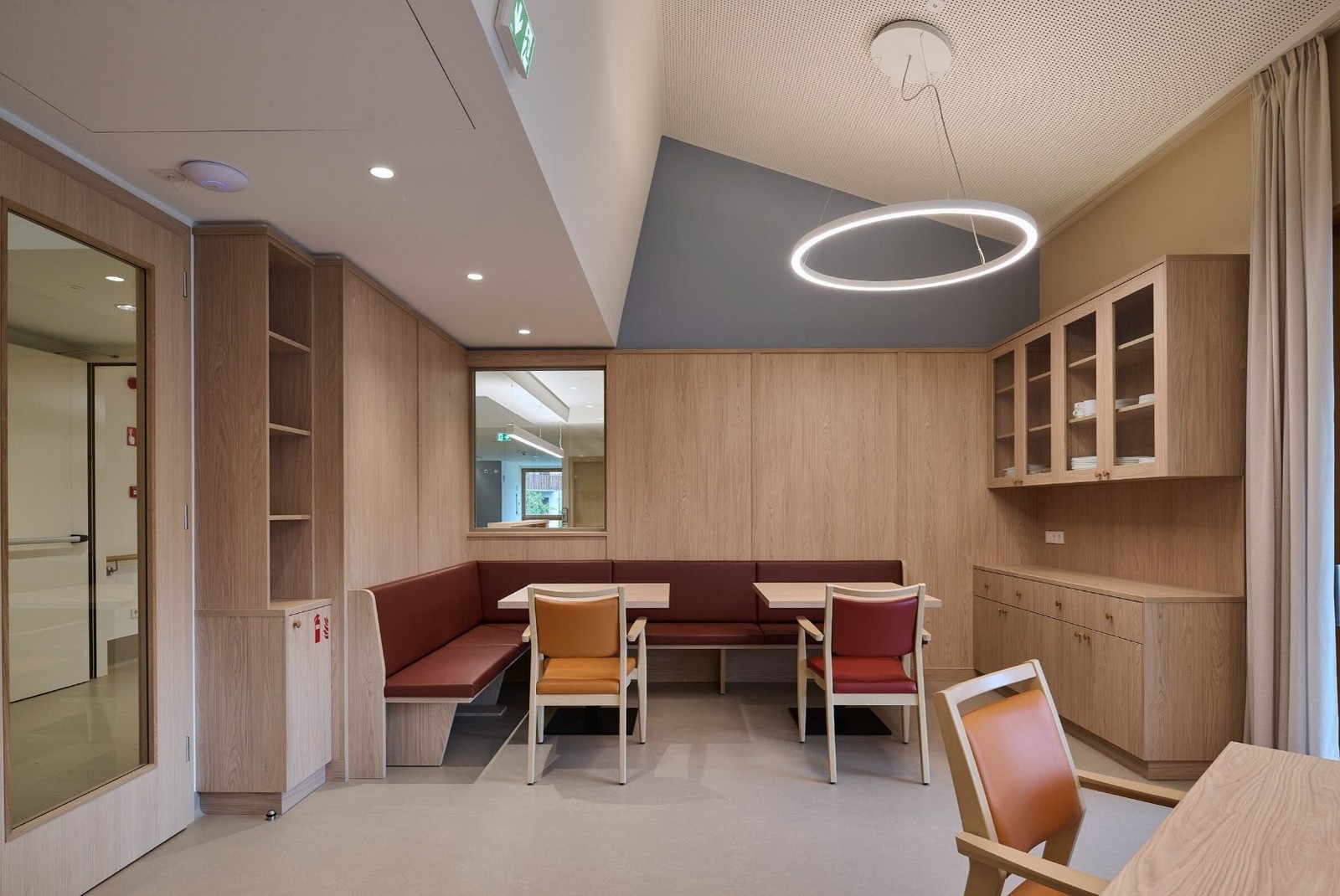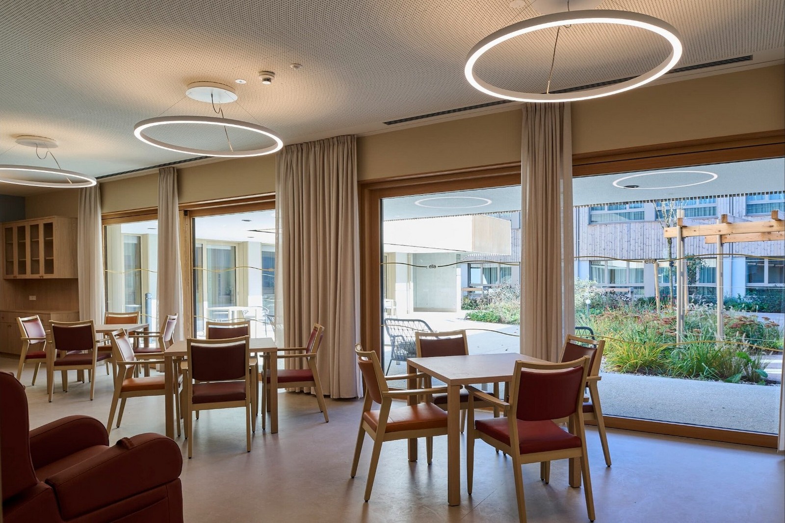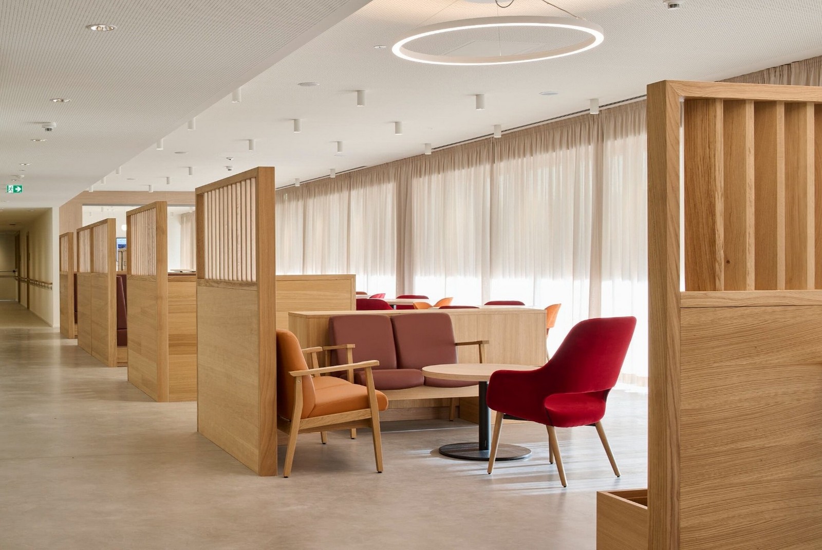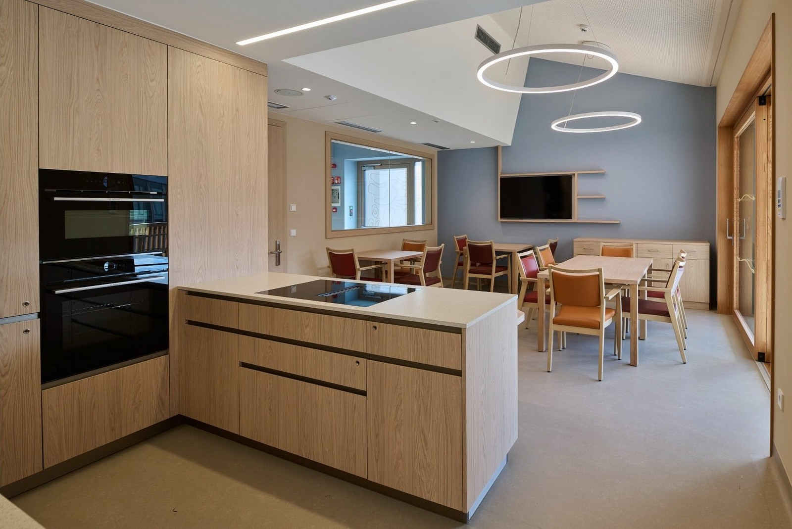 Esta gradualidad también se refleja en la organización interna de los espacios residenciales: cada unidad acoge a solo 12 personas, creando mini-comunidades que recuerdan a grandes hogares familiares. Los espacios comunes están diseñados para esta escala, con cocina, comedor y sala de estar separados, fomentando la movilidad de los residentes durante el día. Se prestó especial atención a la orientación: de manera contra intuitiva, las zonas de descanso están orientadas al norte, mientras que los espacios comunes miran al sur, incentivando a los residentes a aprovechar los espacios colectivos durante el día, beneficiándose de la mejor exposición solar.