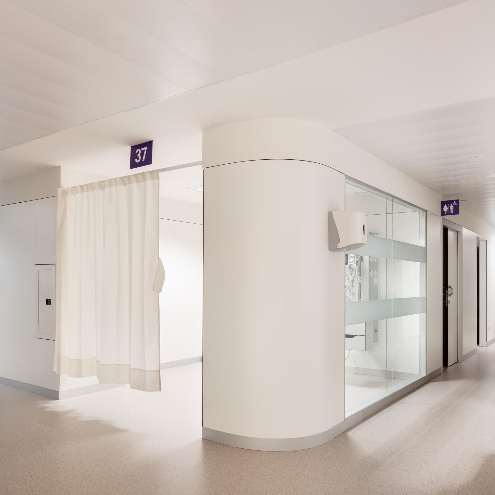 - Y los controles de enfermería se localizan en el eje central del espacio, uno en cada extremo, para posibilitar la visibilidad y el acceso a todos los ámbitos.