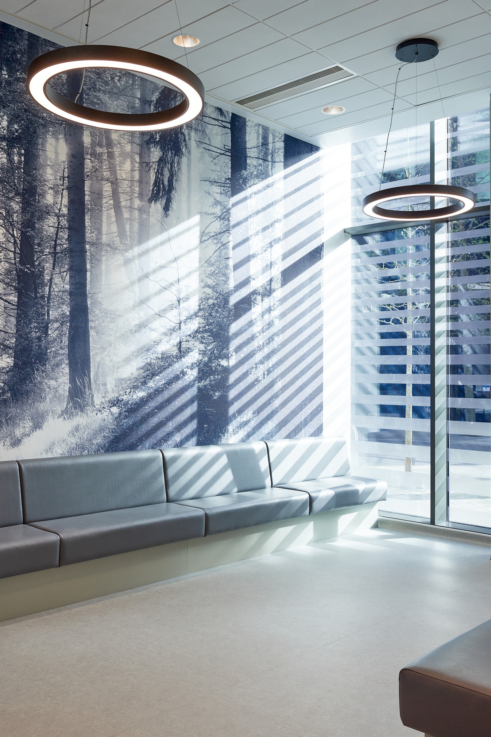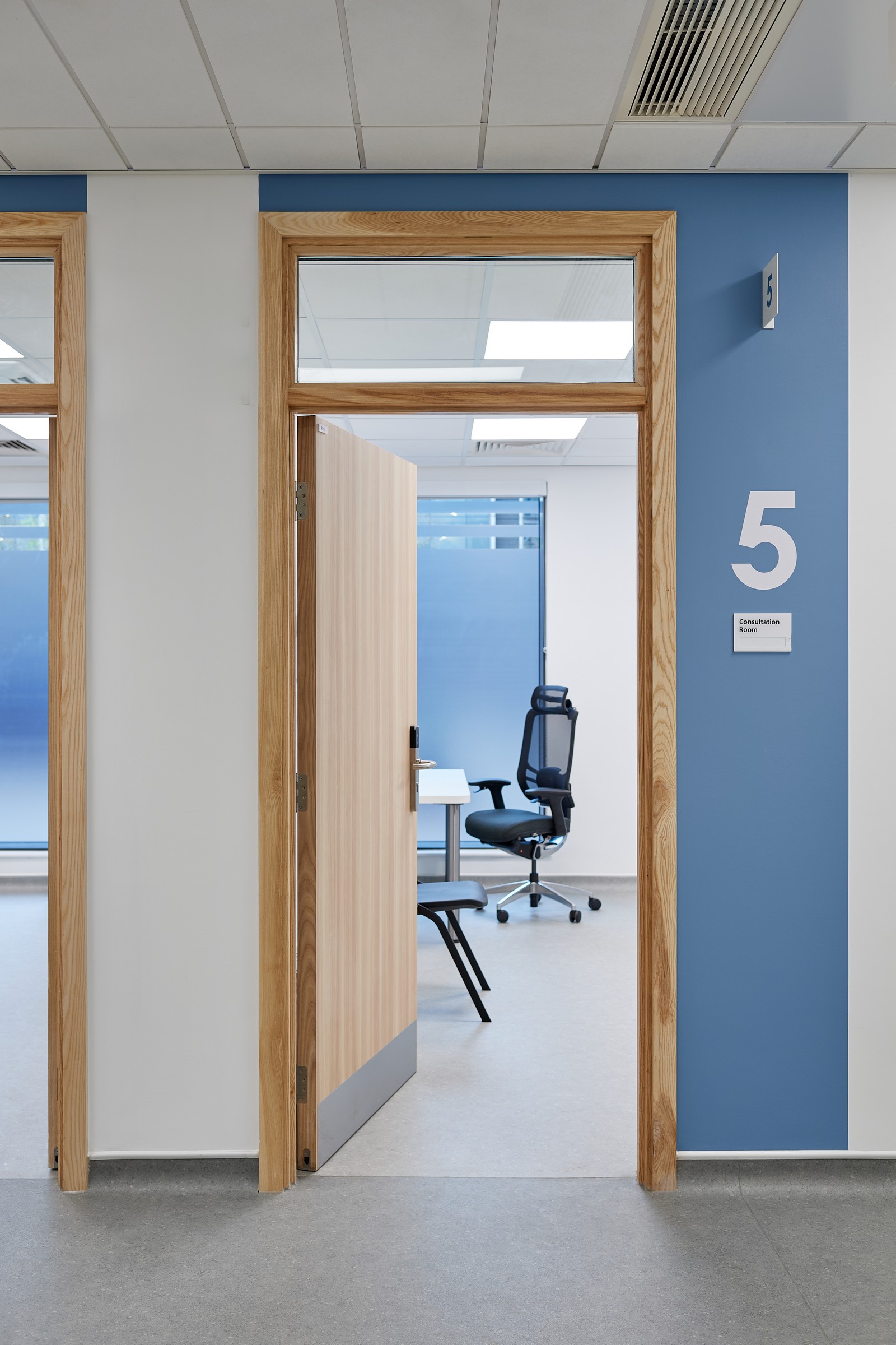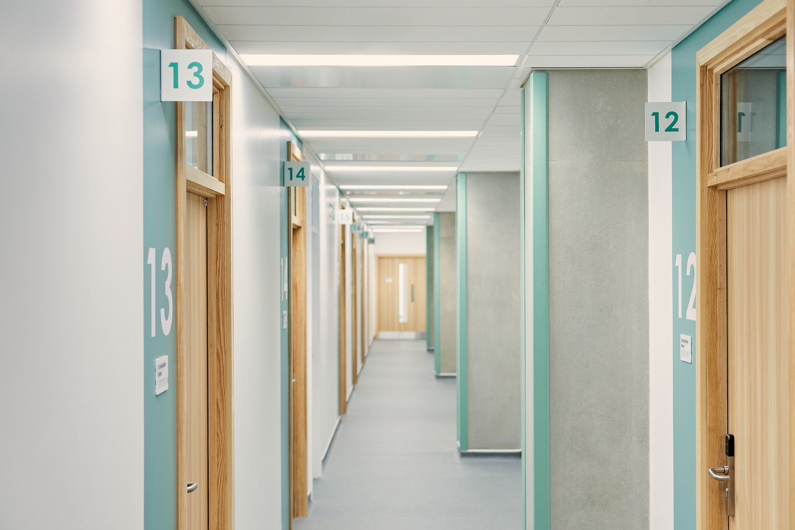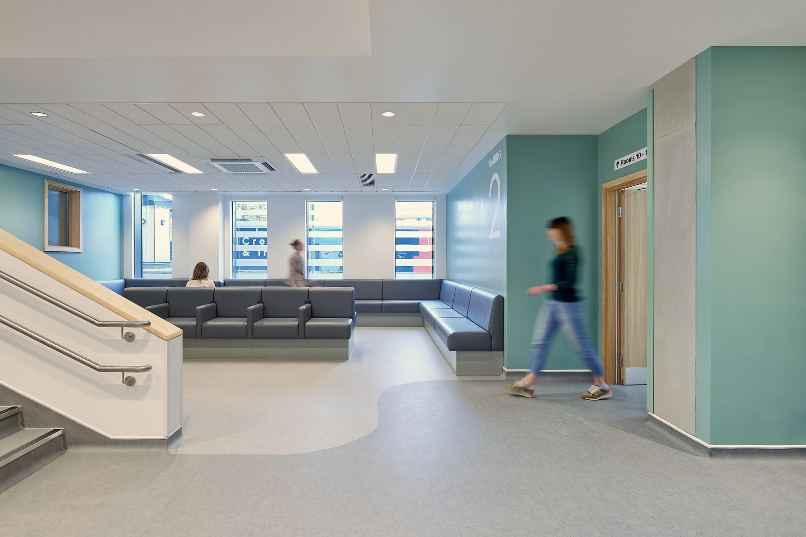 Las salas de espera están situadas junto a ventanas de altura completa, donde se ha realizado un considerable esfuerzo para coordinar los servicios del techo con el fin de maximizar la altura de este y la cantidad de luz natural que entra en el edificio. Esto ayuda a resaltar el diseño interior, que utiliza una gama de colores, señalización y gráficos en las paredes para diferenciar las áreas clave del edificio. Los materiales duraderos y de bajo mantenimiento, como el fresno natural y el hormigón visto, también contribuyen al carácter de la clínica.