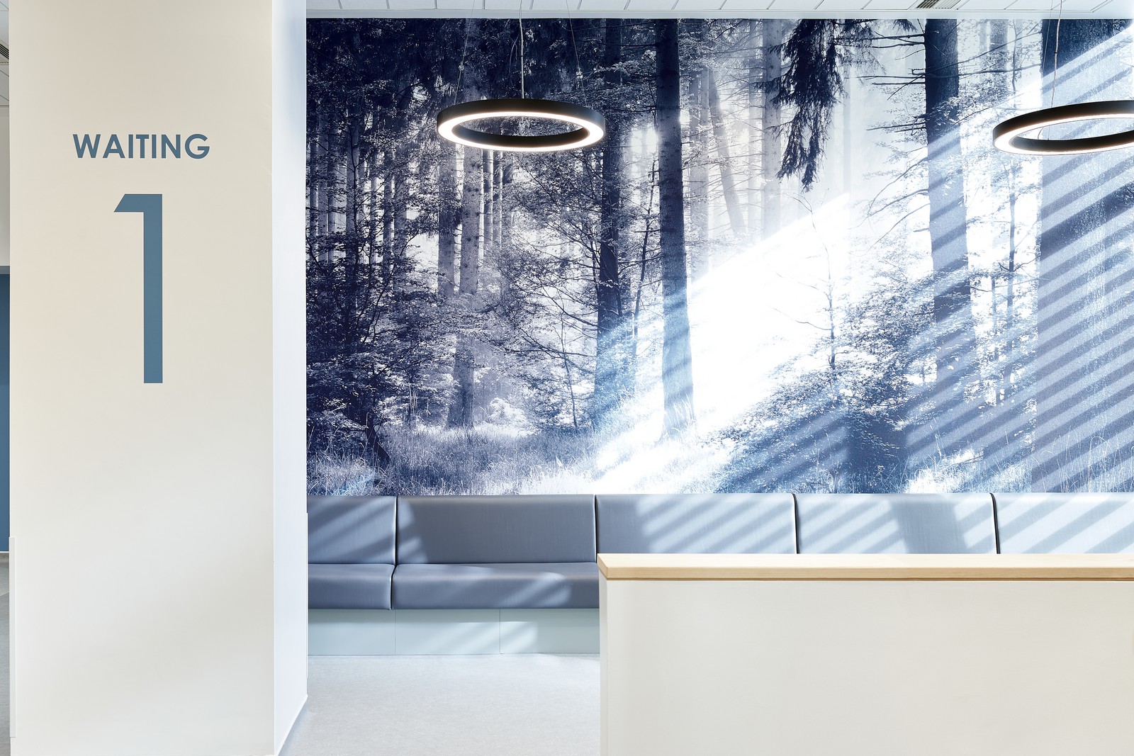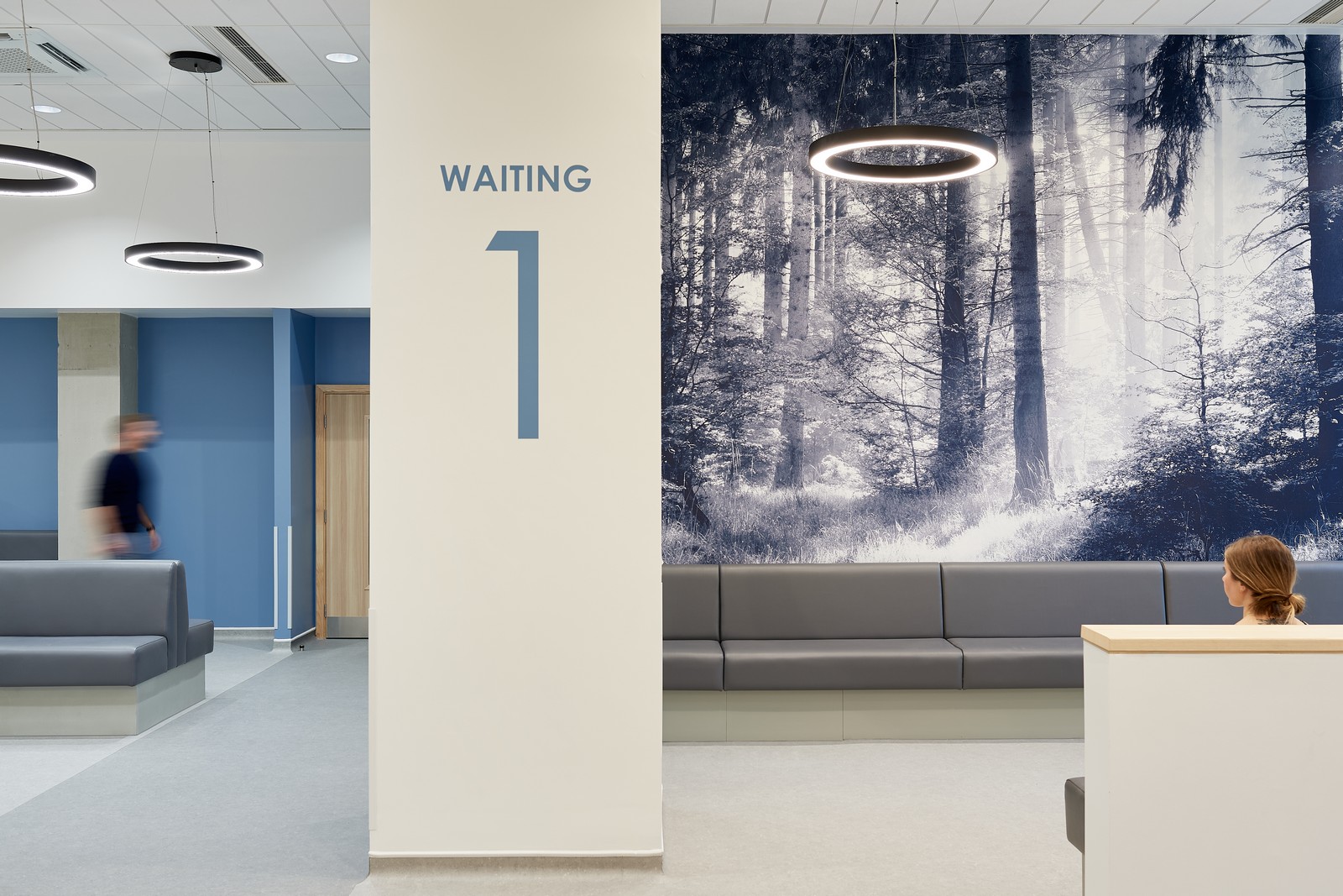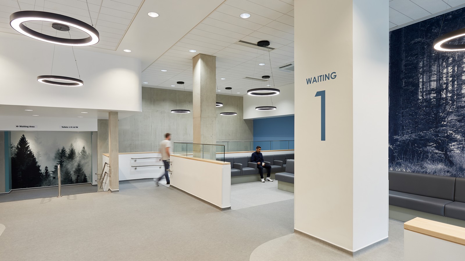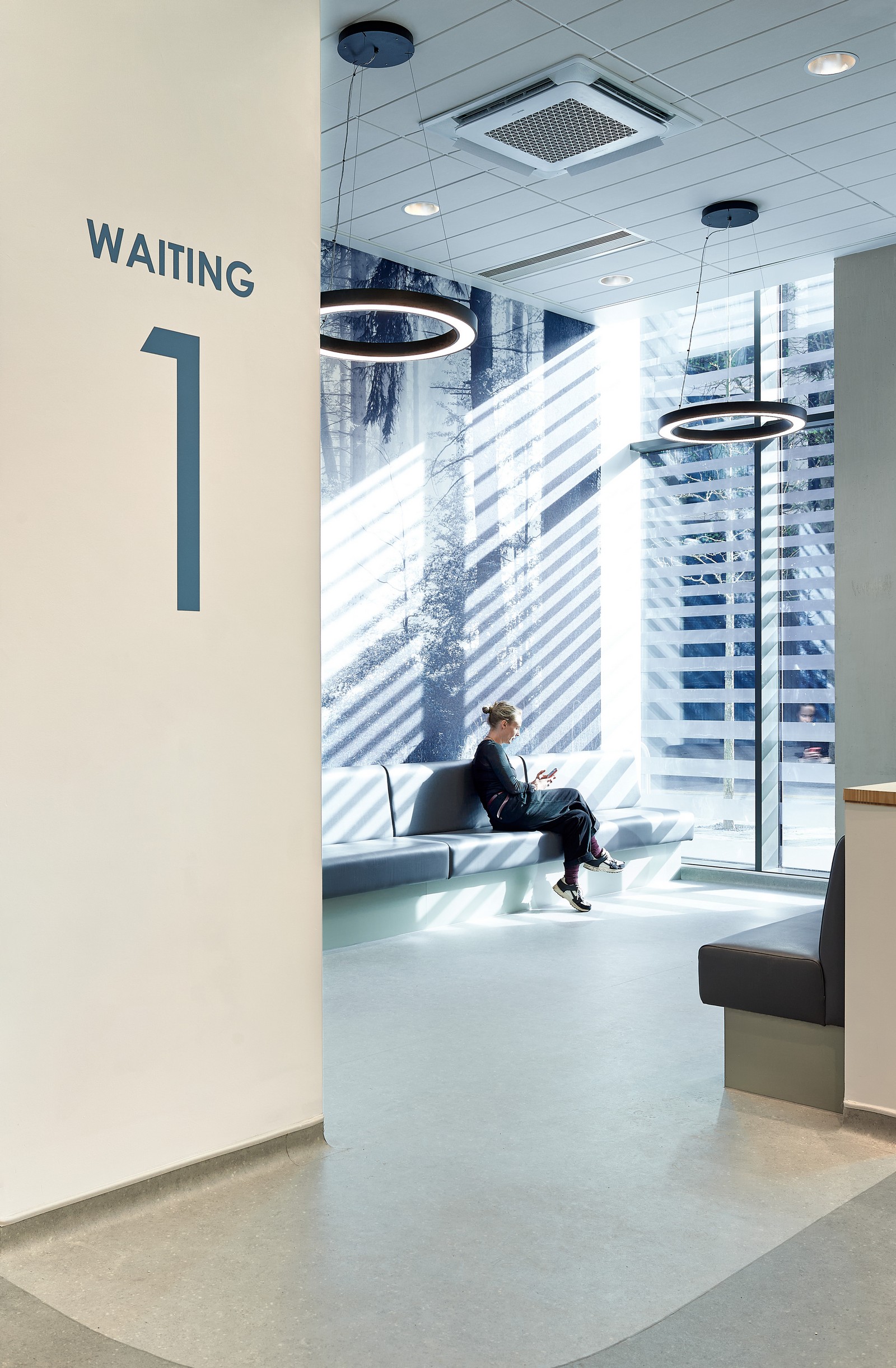 Las salas de espera están situadas junto a ventanas de altura completa, donde se ha realizado un considerable esfuerzo para coordinar los servicios del techo con el fin de maximizar la altura de este y la cantidad de luz natural que entra en el edificio. Esto ayuda a resaltar el diseño interior, que utiliza una gama de colores, señalización y gráficos en las paredes para diferenciar las áreas clave del edificio. Los materiales duraderos y de bajo mantenimiento, como el fresno natural y el hormigón visto, también contribuyen al carácter de la clínica.
