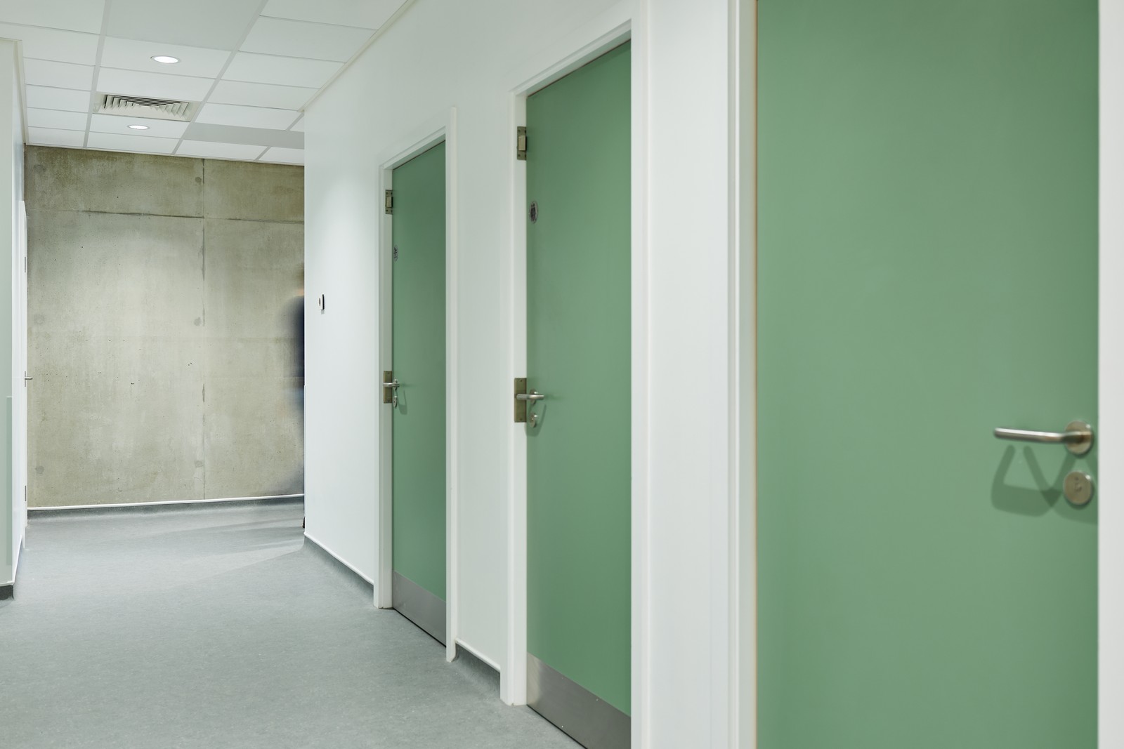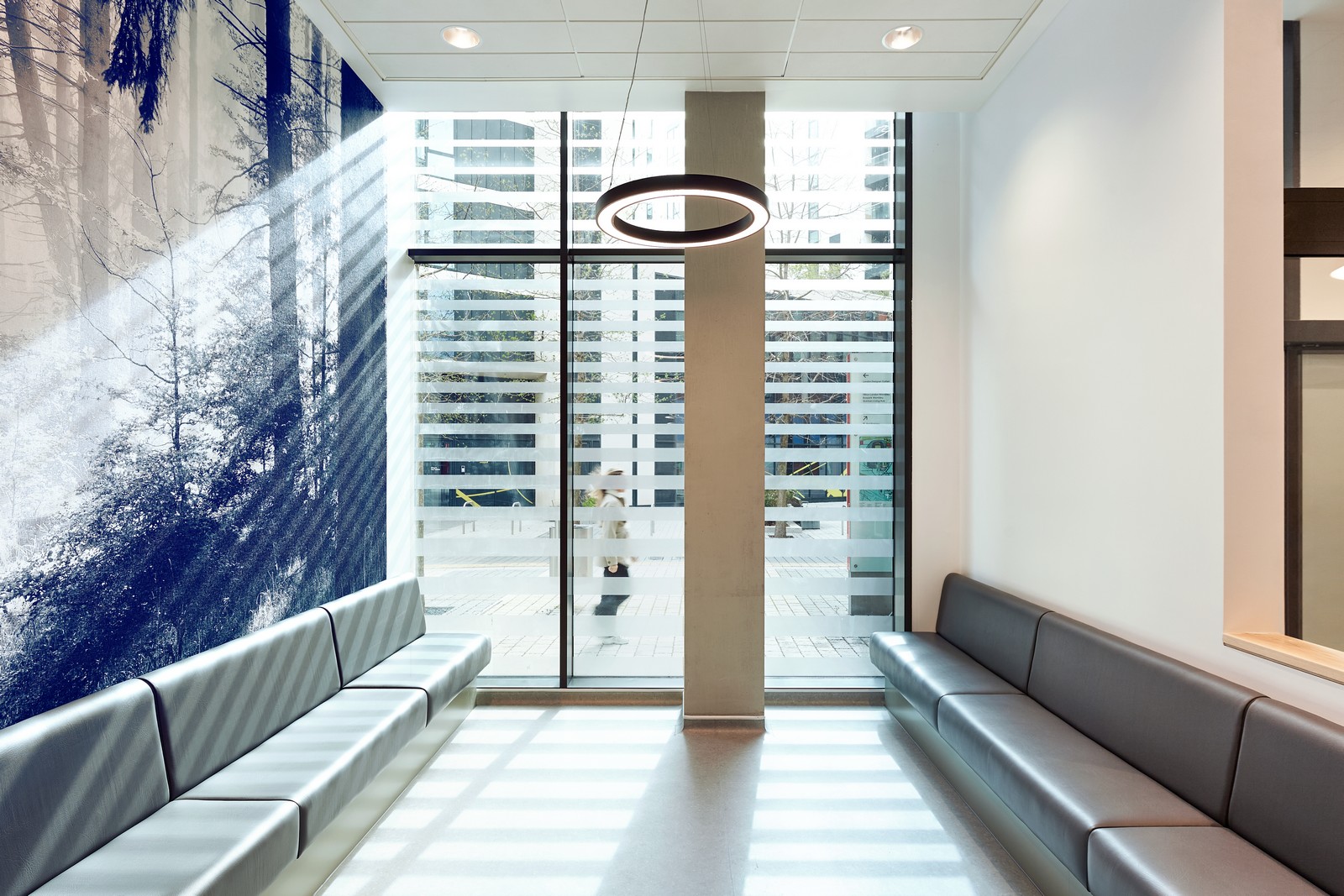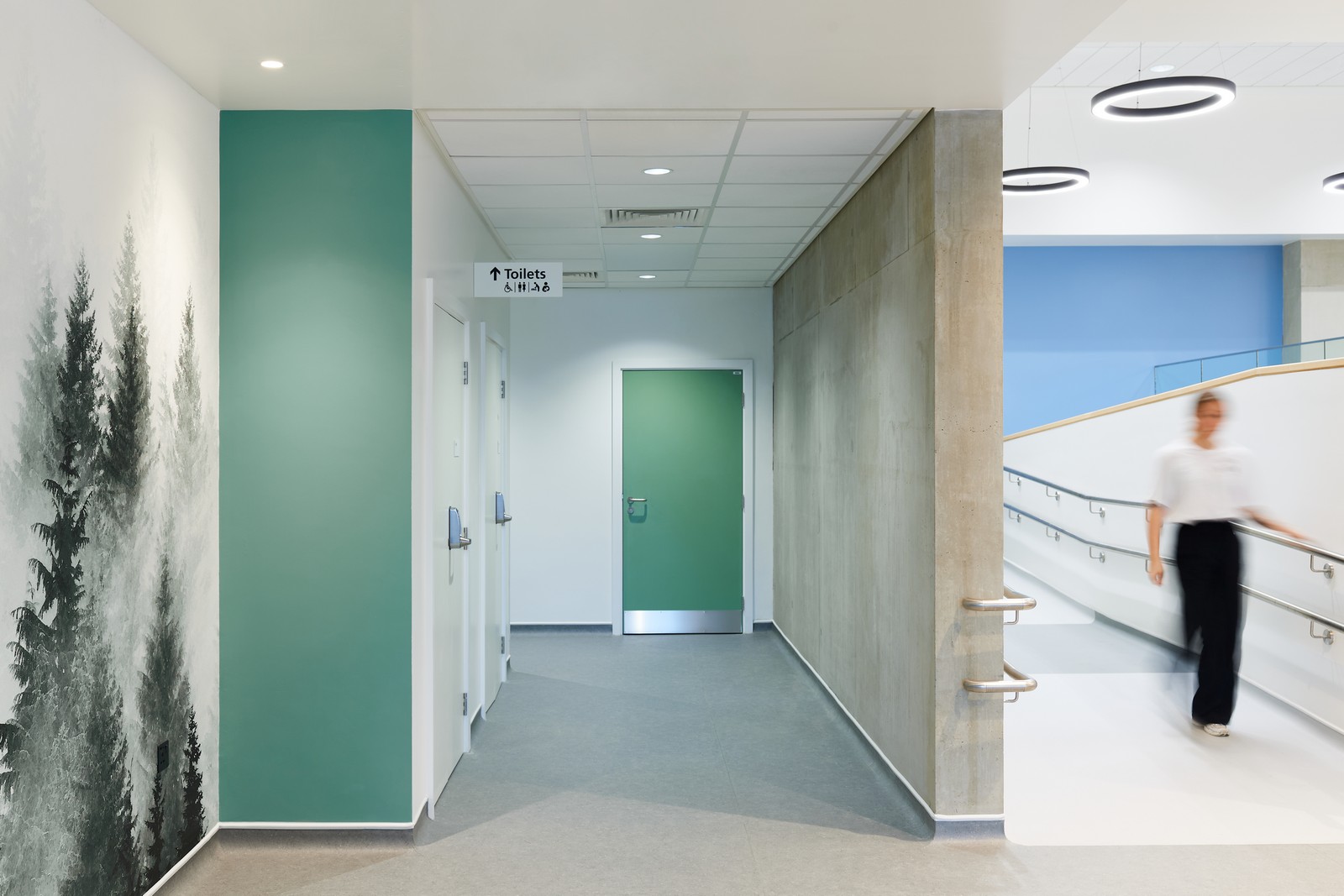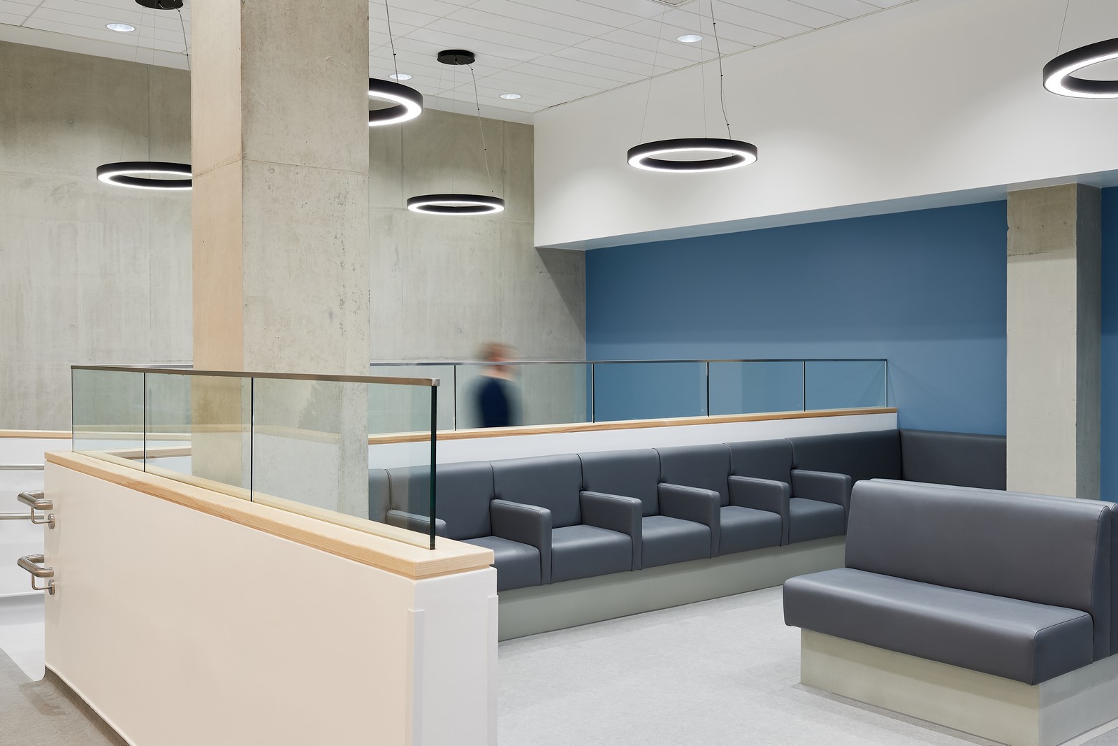 Las salas de espera están situadas junto a ventanas de altura completa, donde se ha realizado un considerable esfuerzo para coordinar los servicios del techo con el fin de maximizar la altura de este y la cantidad de luz natural que entra en el edificio. Esto ayuda a resaltar el diseño interior, que utiliza una gama de colores, señalización y gráficos en las paredes para diferenciar las áreas clave del edificio. Los materiales duraderos y de bajo mantenimiento, como el fresno natural y el hormigón visto, también contribuyen al carácter de la clínica.